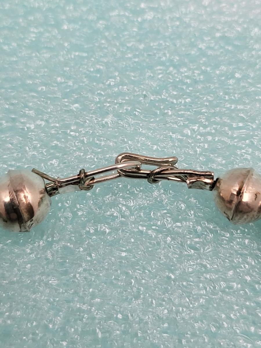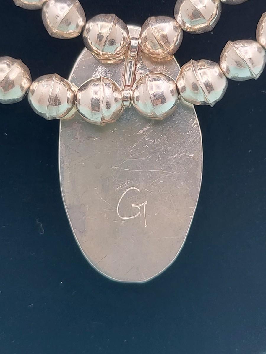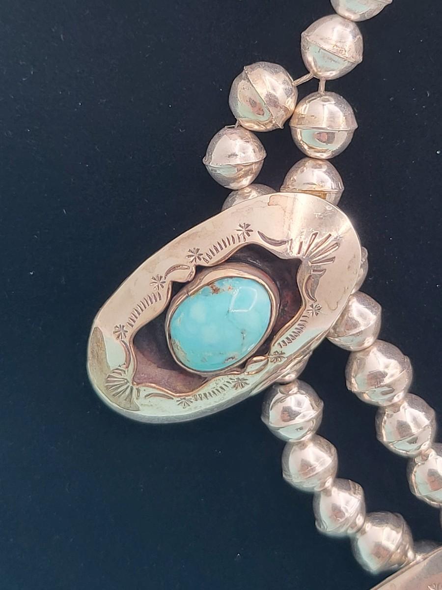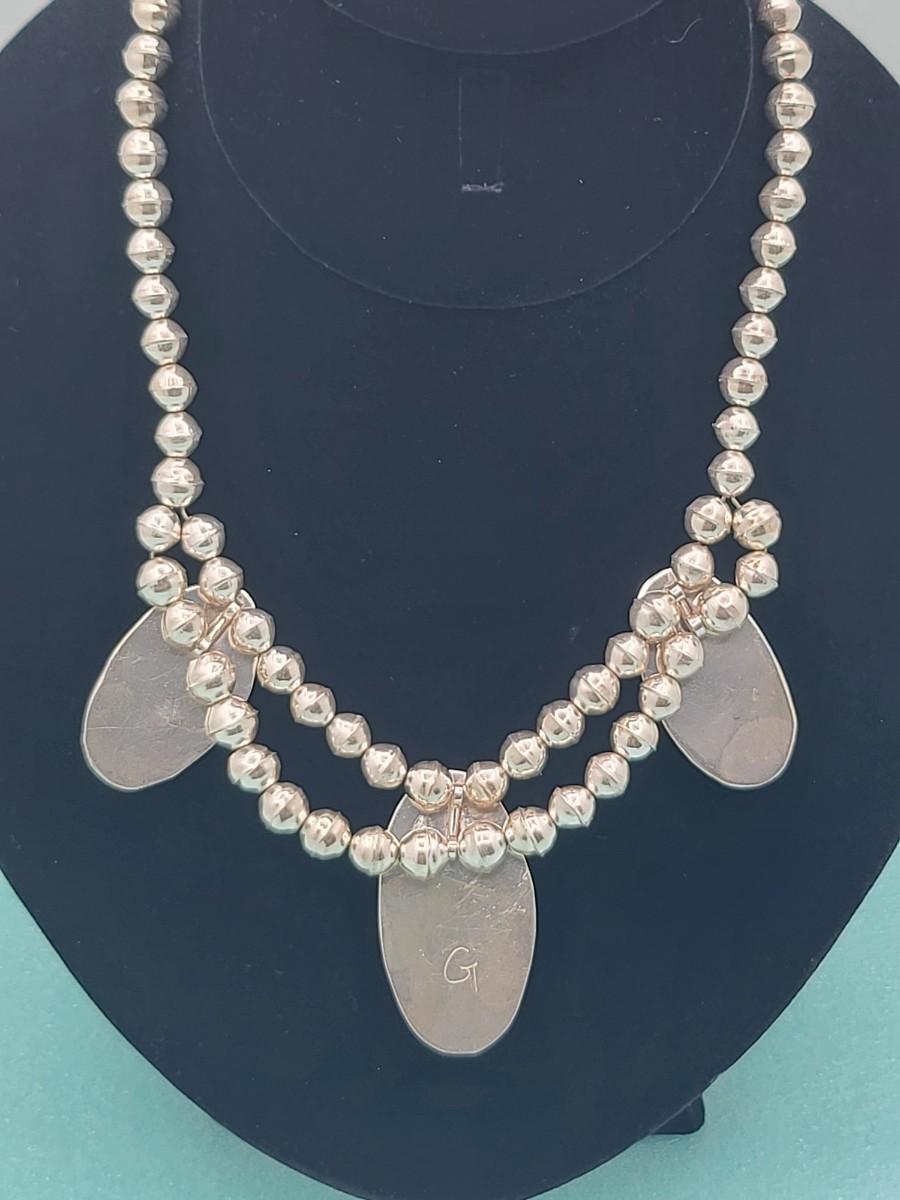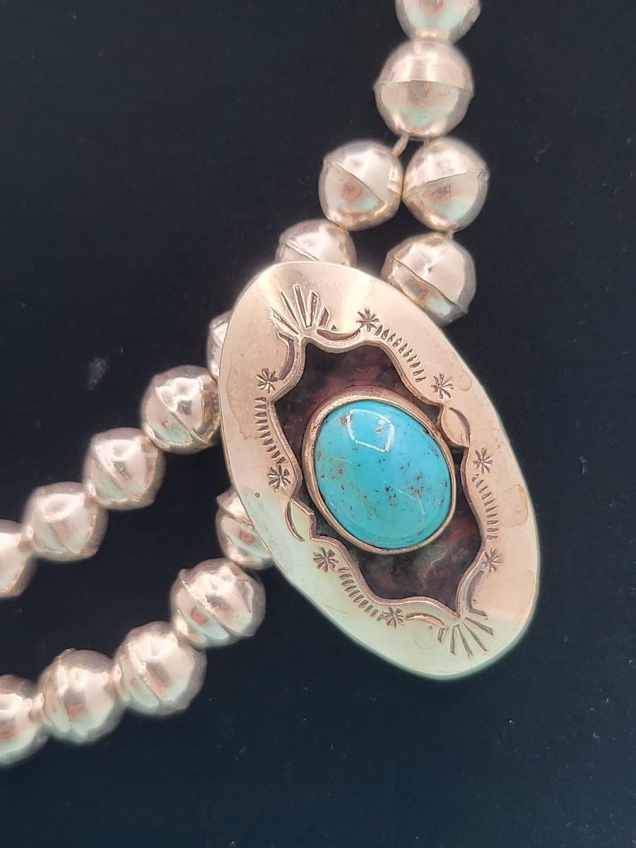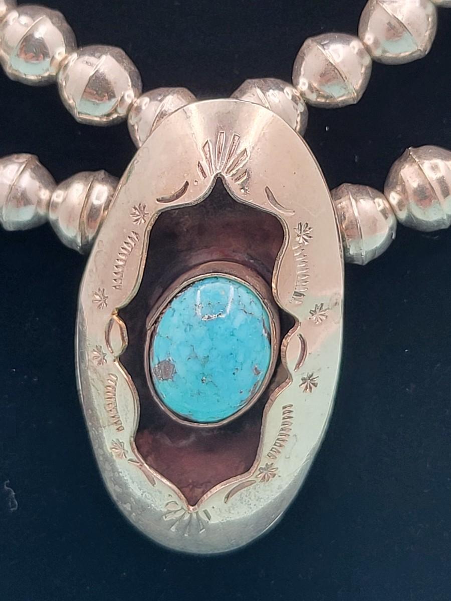 Lovely vintage Navajo find! Silver beads (4mm) and three oval etched 'shadowbox' medallions with turquoise stones is a beautifully hand made statement piece. Artist etched initial G signature on back. Unmarked but verified as sterling silver and genuine turquoise. Shepherds hook clasp. Necklace is 15" long. The center medallion is 2" long x 1" wide and the two medallions on either side are 1.5" long x .75" wide. Oval turquoise inserts have been hand polished and are solid in their setting. Total weight 55 grams.