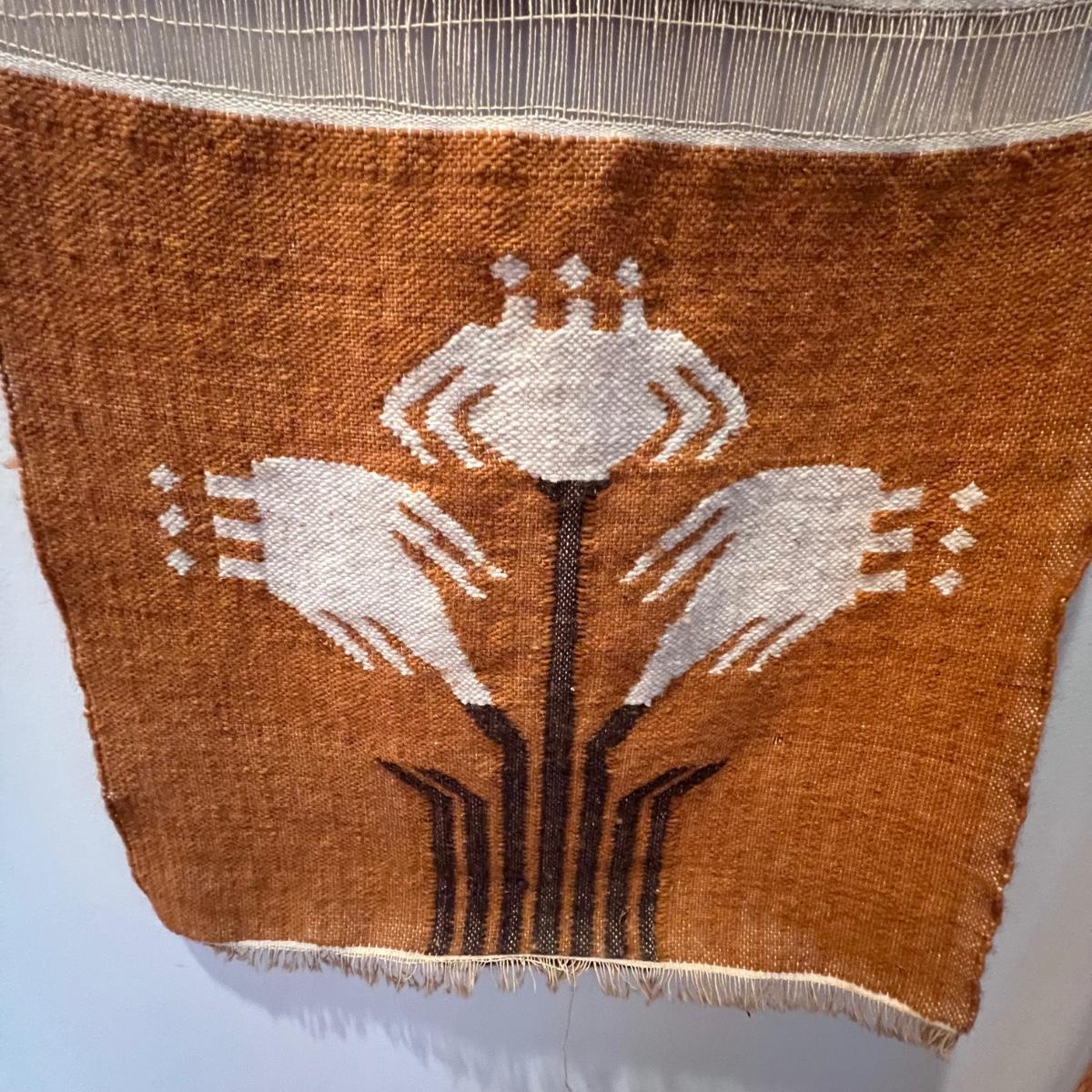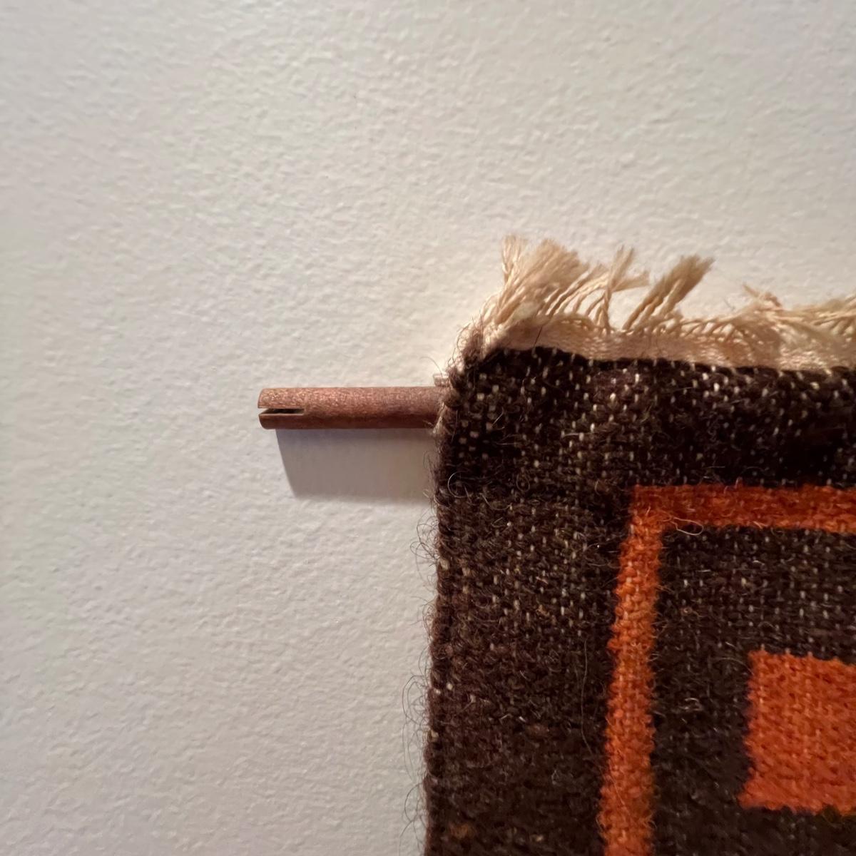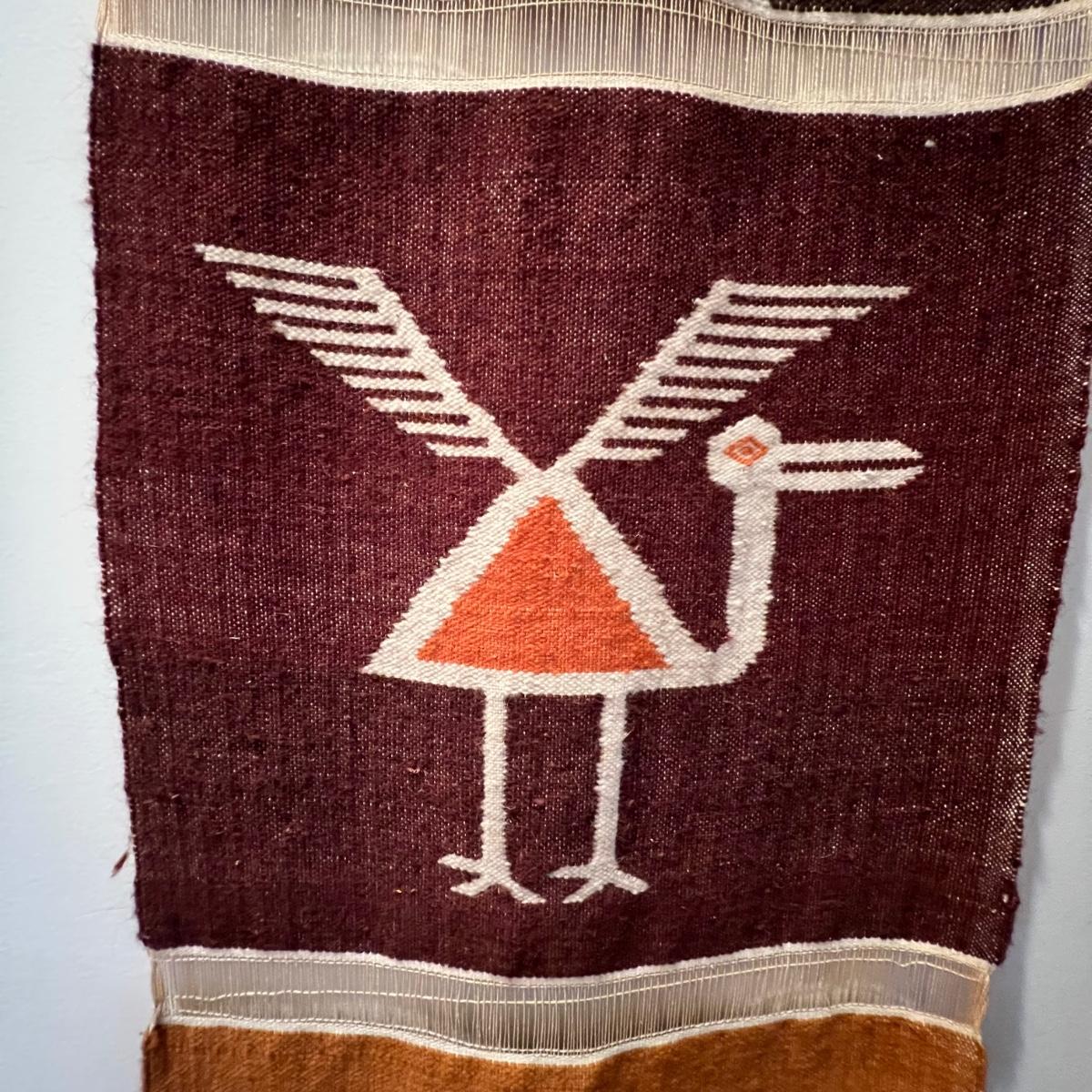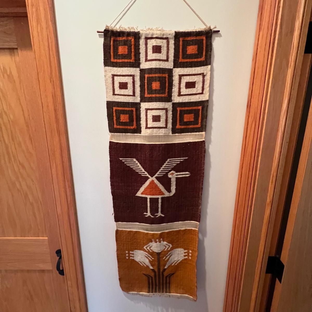 This attractive Navajo style wall hanging appears to be handwoven wool. It measures 15.5” x 47”H. A wooden rod has a string hanging handle.