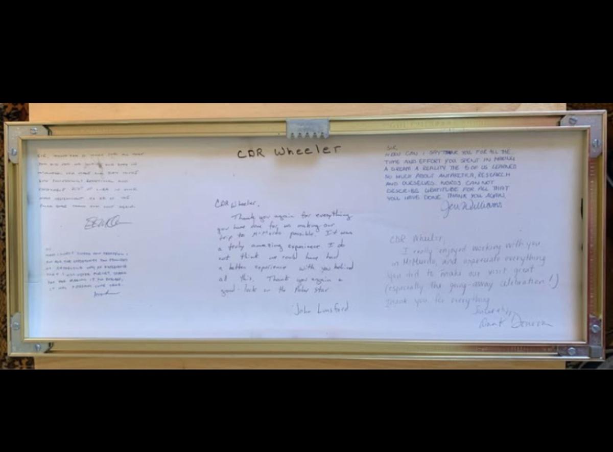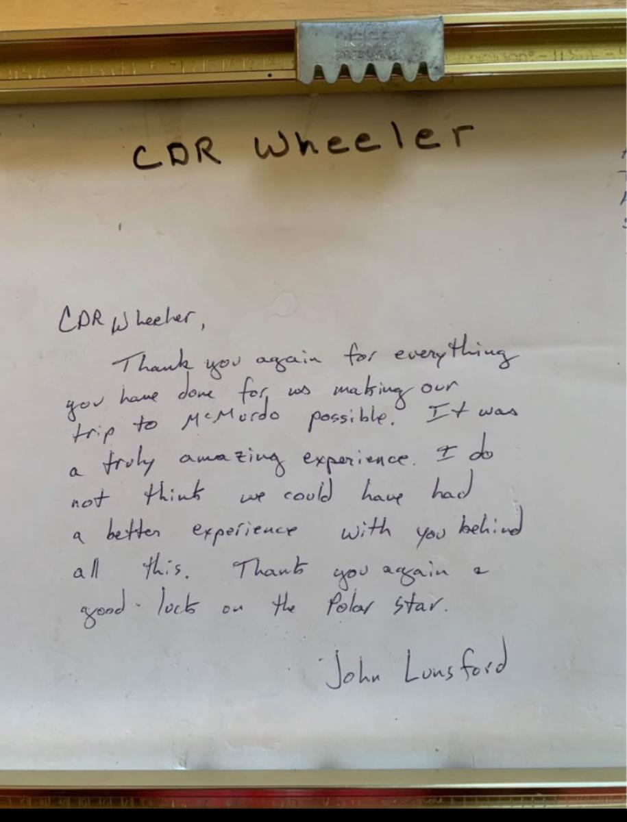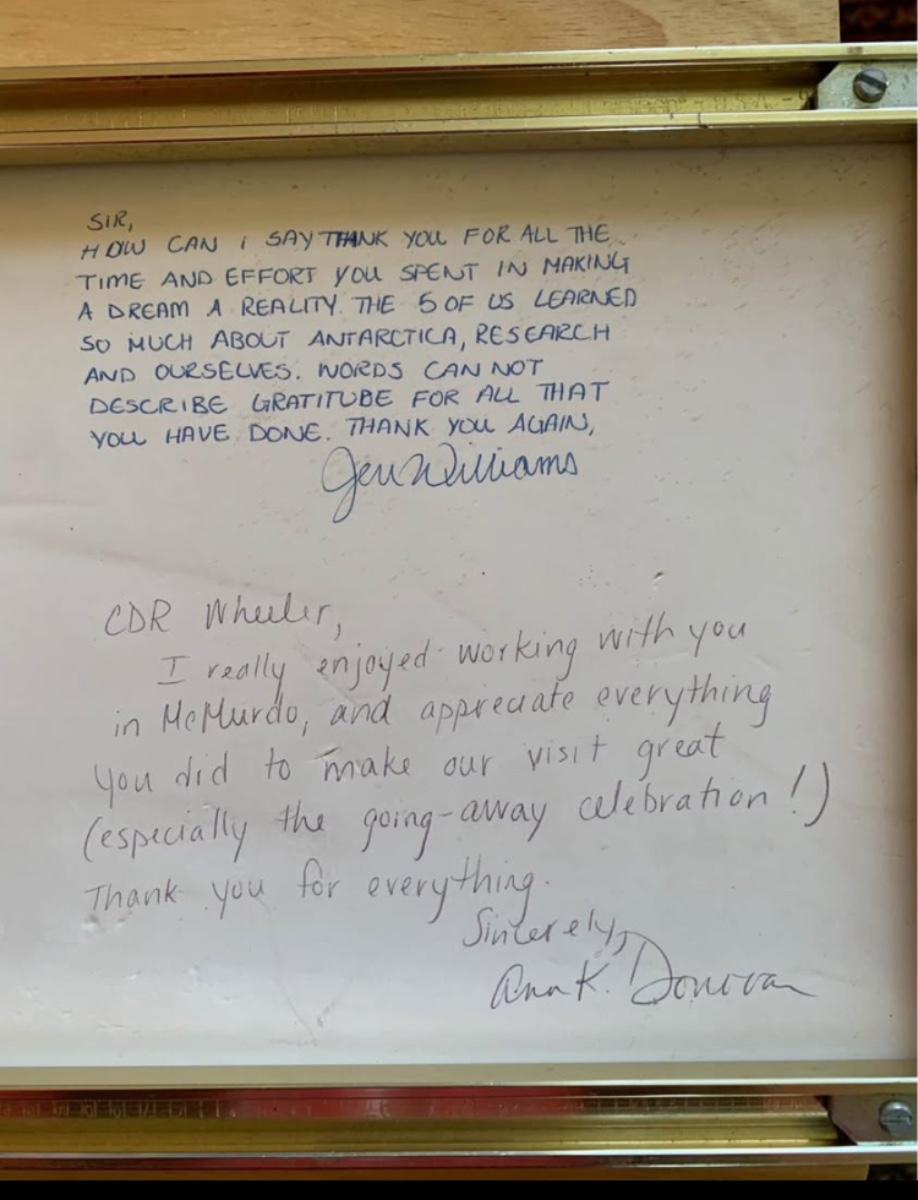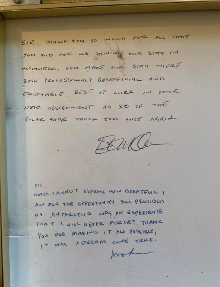 The back features five handwritten thank-you messages from the people he escorted to Antarctica — each one expressing appreciation, memories of McMurdo, and well-wishes for his upcoming Polar Star assignment.