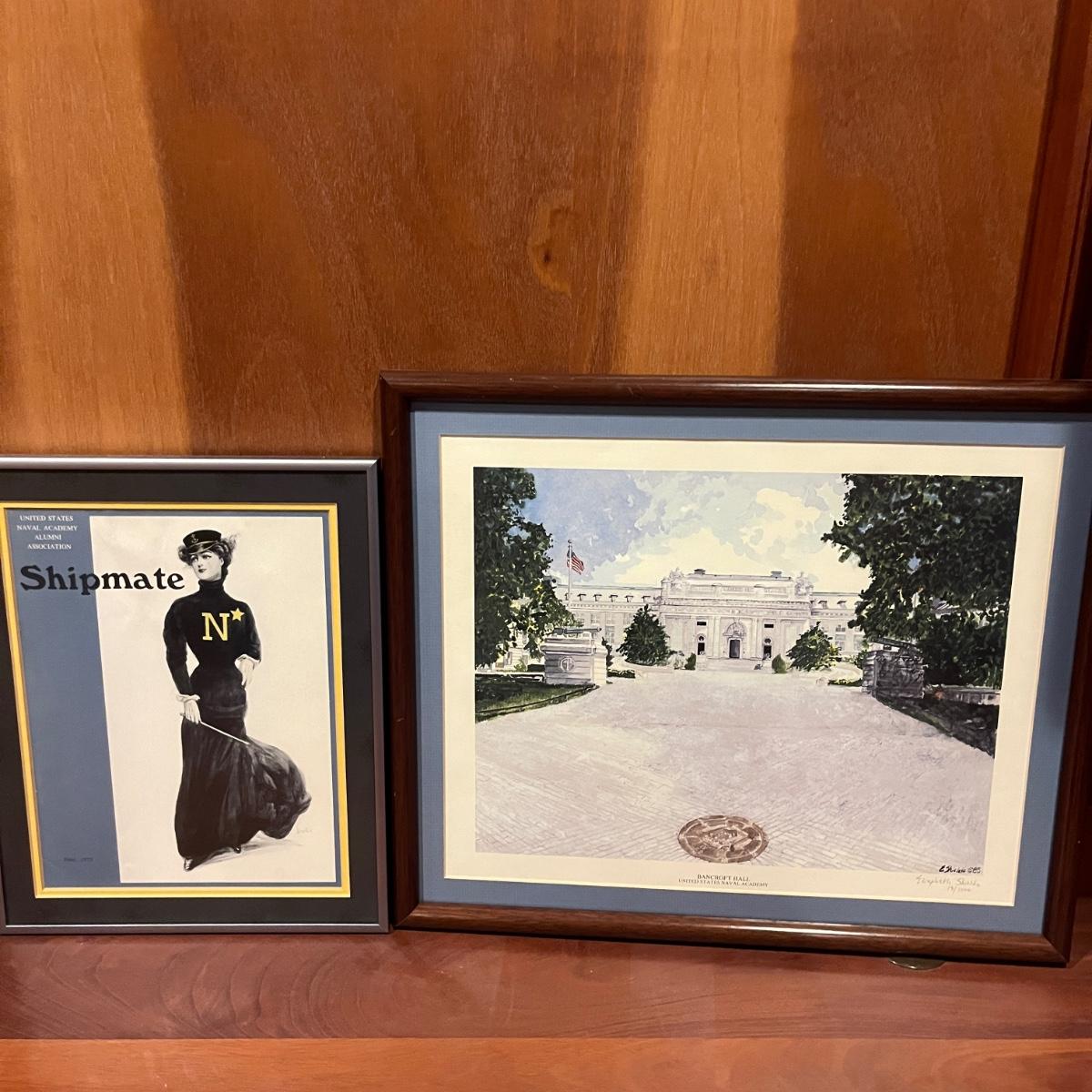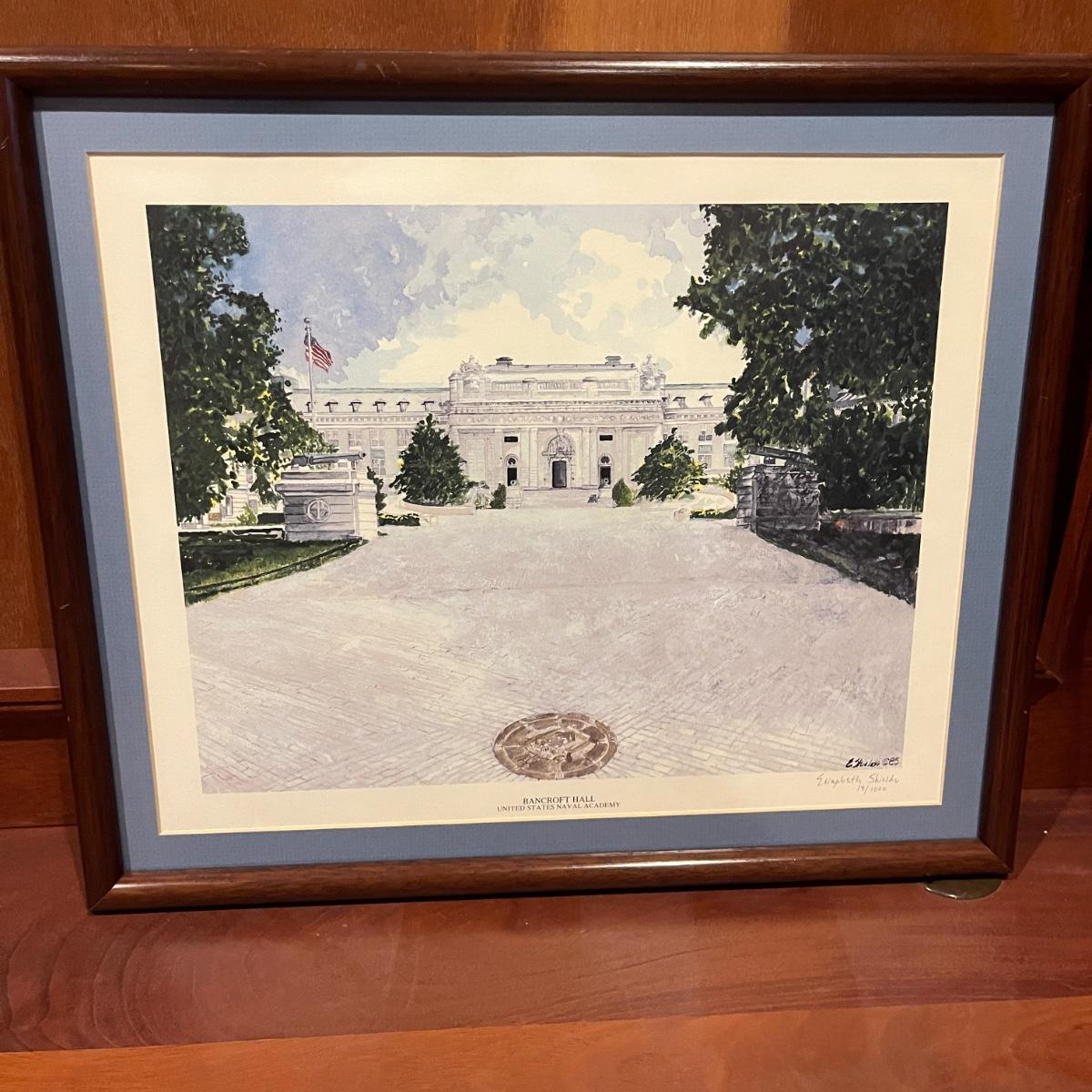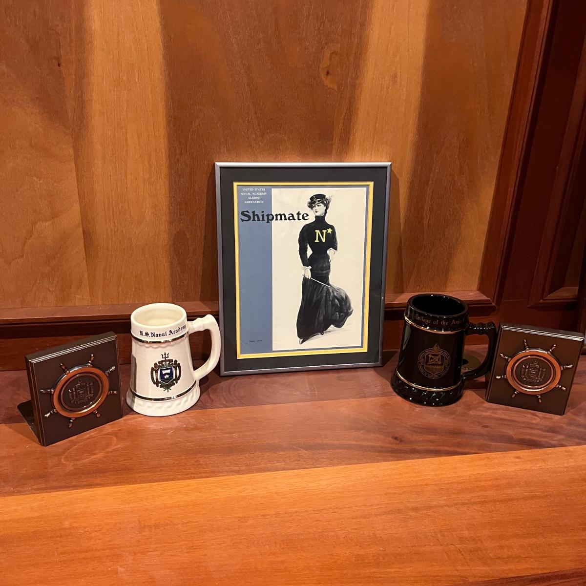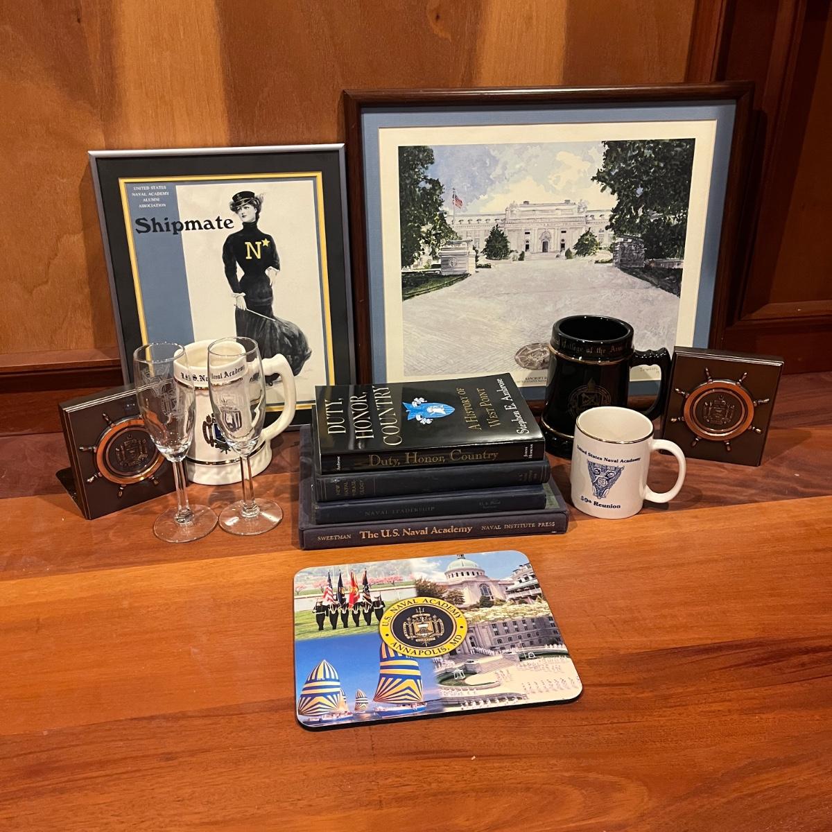 This lot contains a wooden framed, signed and numbered print by Elizabeth Shields, metal framed Shipmate cover, two metal bookends, three mugs, two flutes, four books and a mousepad. Largest frame measures 18.5” x 15.5”H.