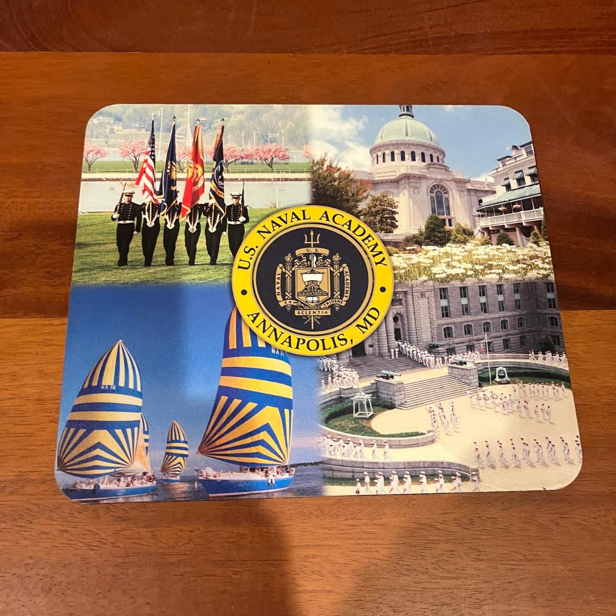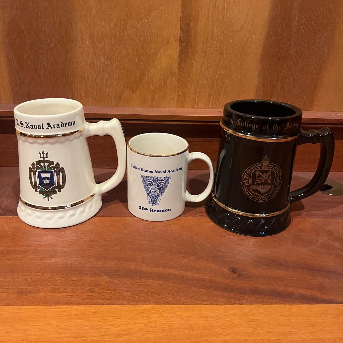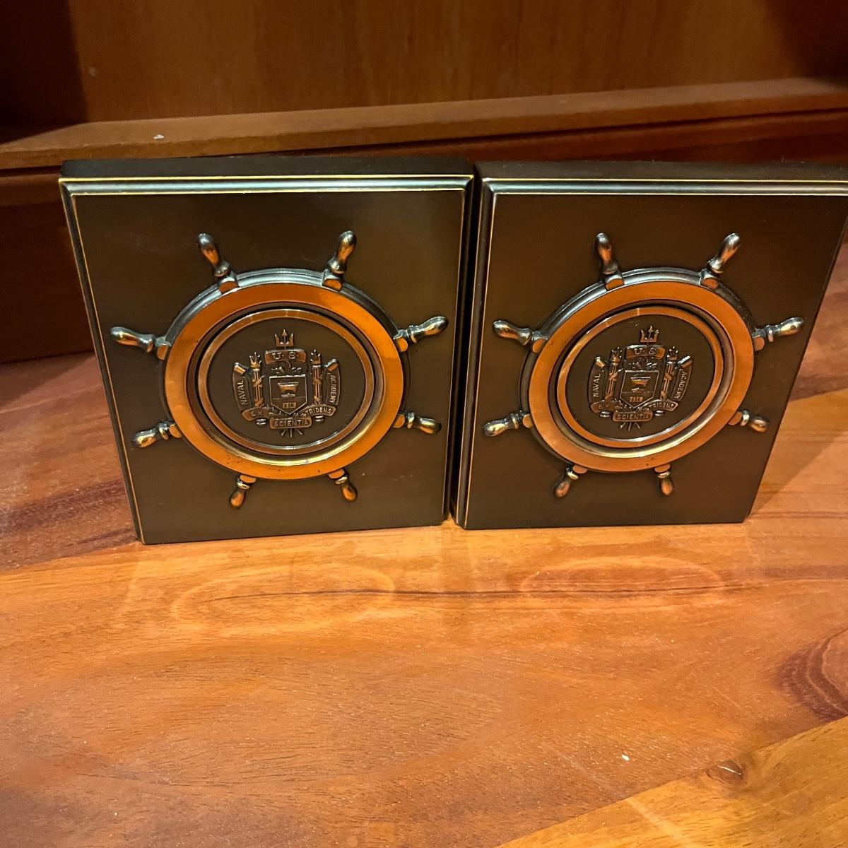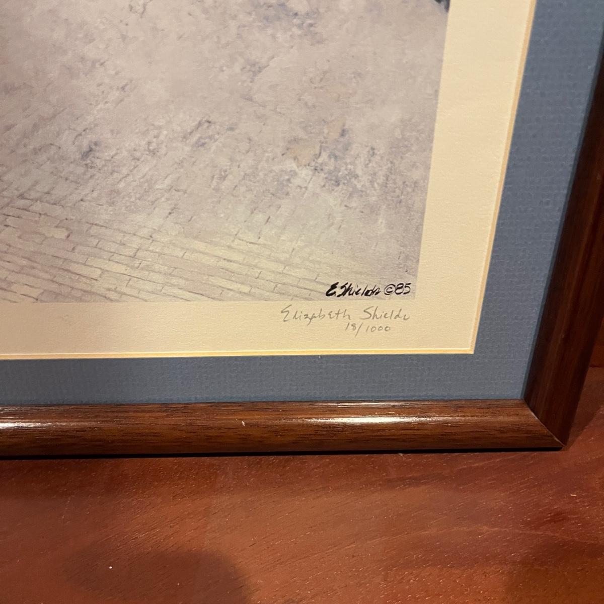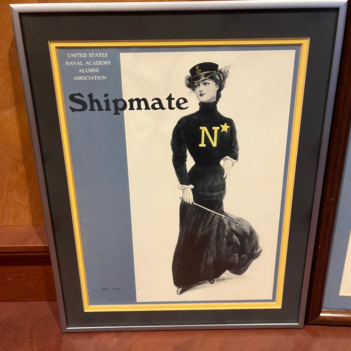 This lot contains a wooden framed, signed and numbered print by Elizabeth Shields, metal framed Shipmate cover, two metal bookends, three mugs, two flutes, four books and a mousepad. Largest frame measures 18.5” x 15.5”H.
