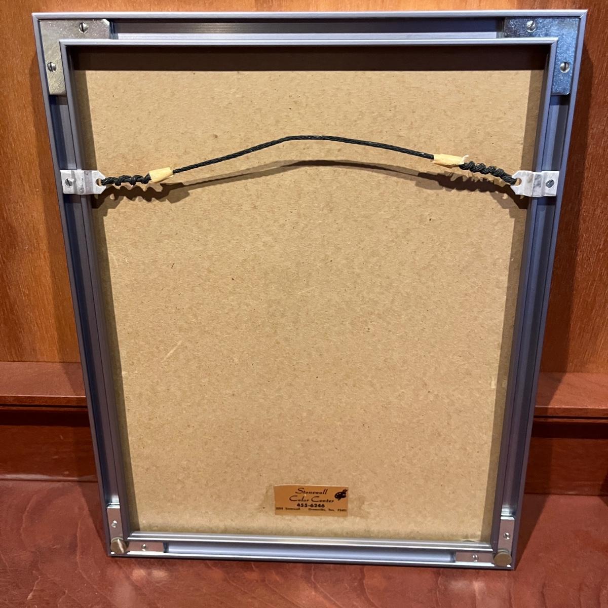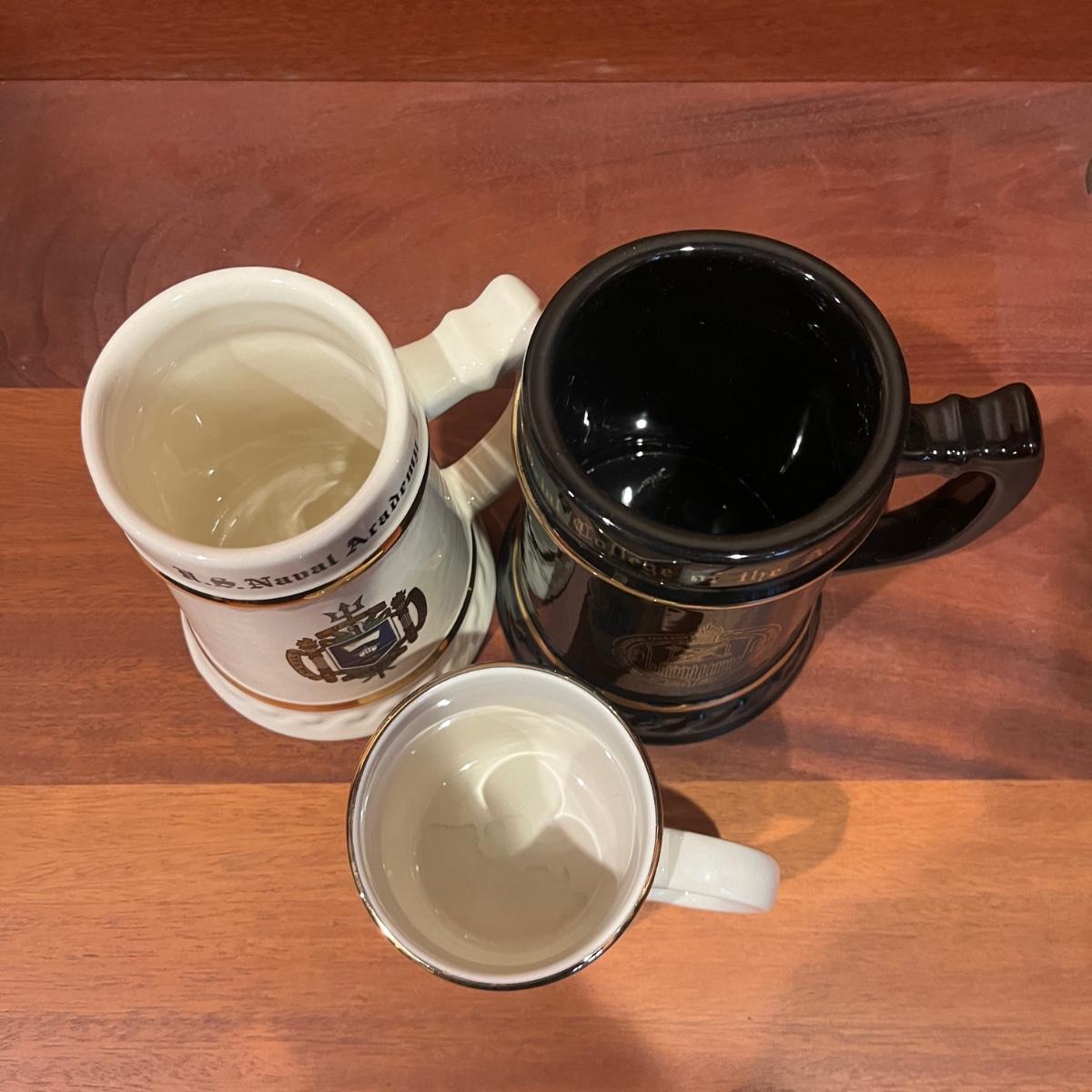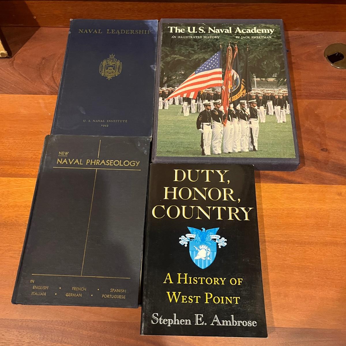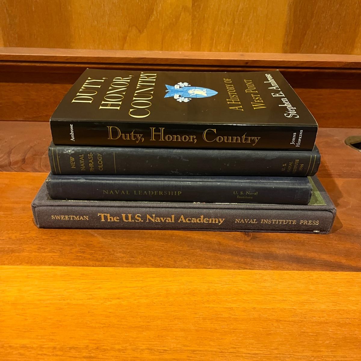 This lot contains a wooden framed, signed and numbered print by Elizabeth Shields, metal framed Shipmate cover, two metal bookends, three mugs, two flutes, four books and a mousepad. Largest frame measures 18.5” x 15.5”H.