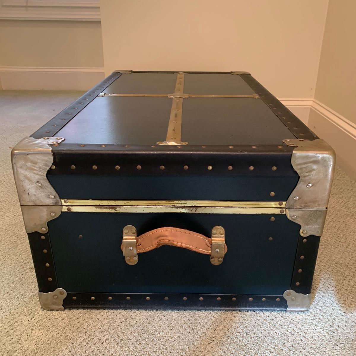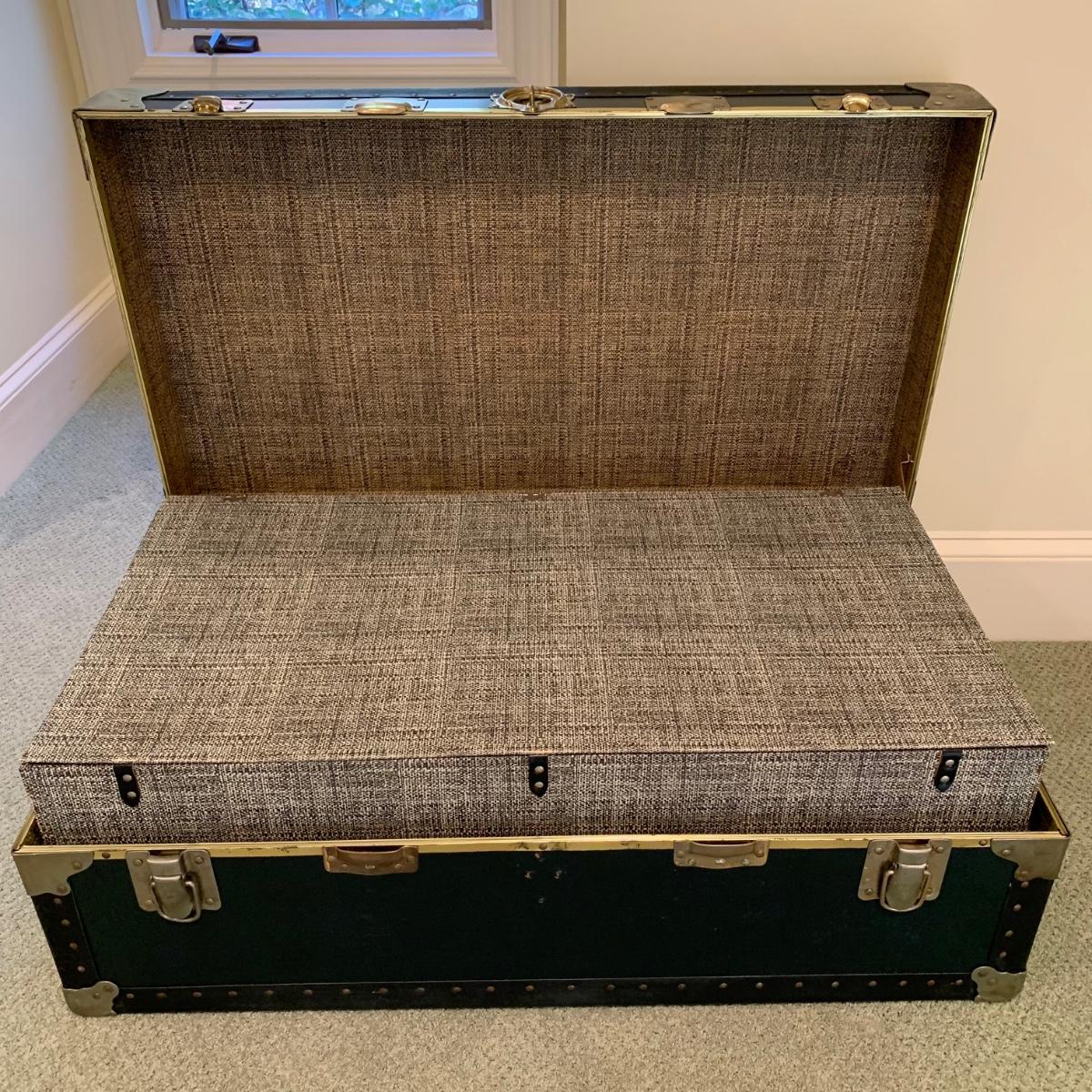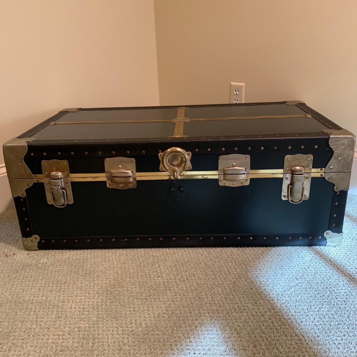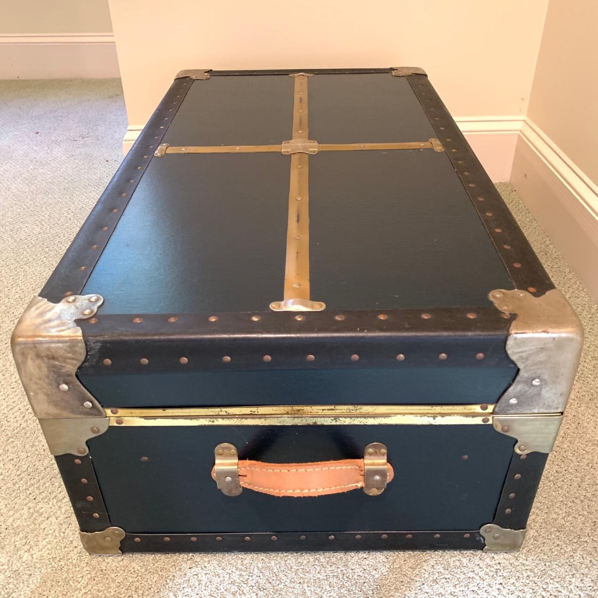 Navy blue steamer truck with insert. Solid trunk. Lid closes and fits flush with the rest of the unit. Trunk measures, 36” x 20” x 13”H. No lock or keys included. Local pickup only.