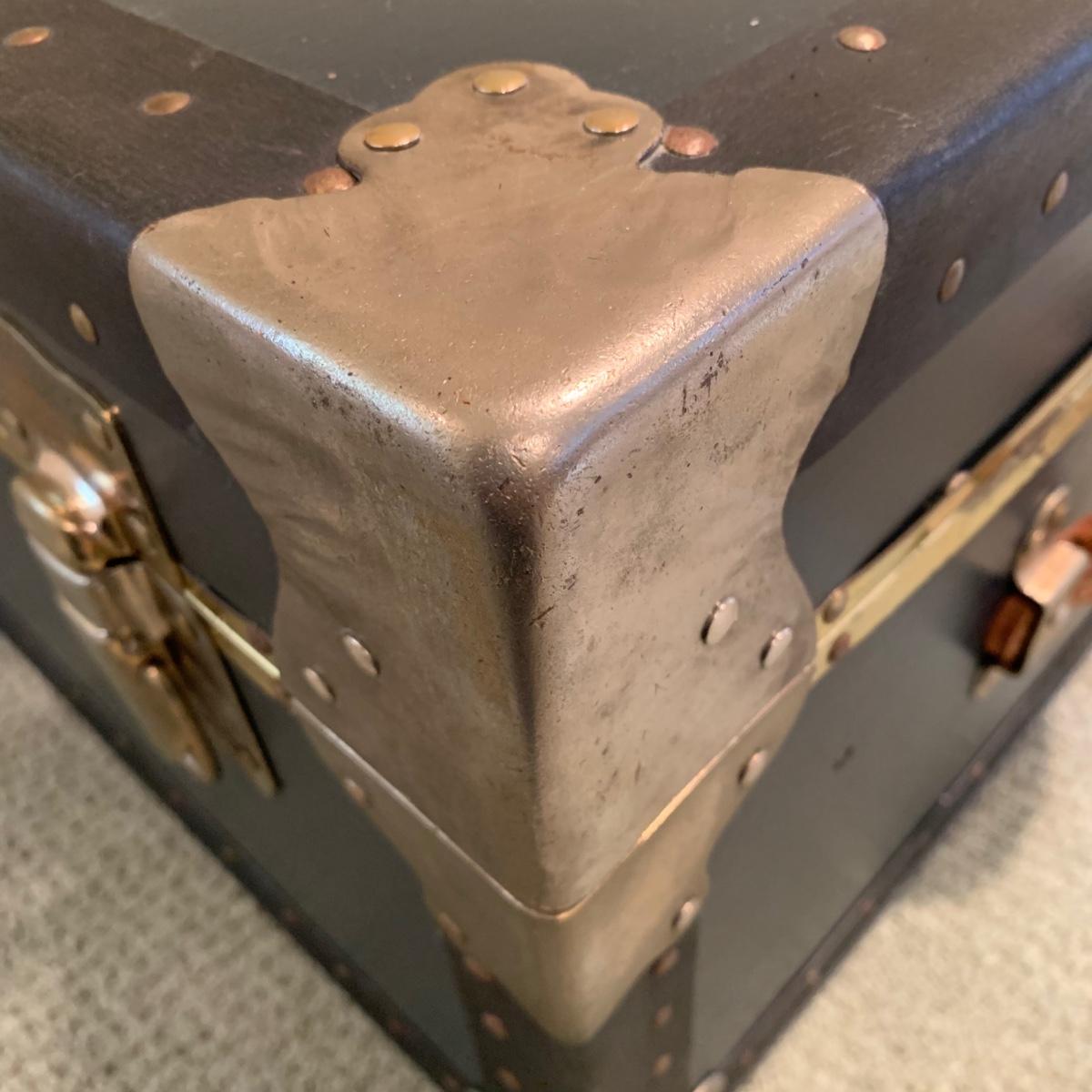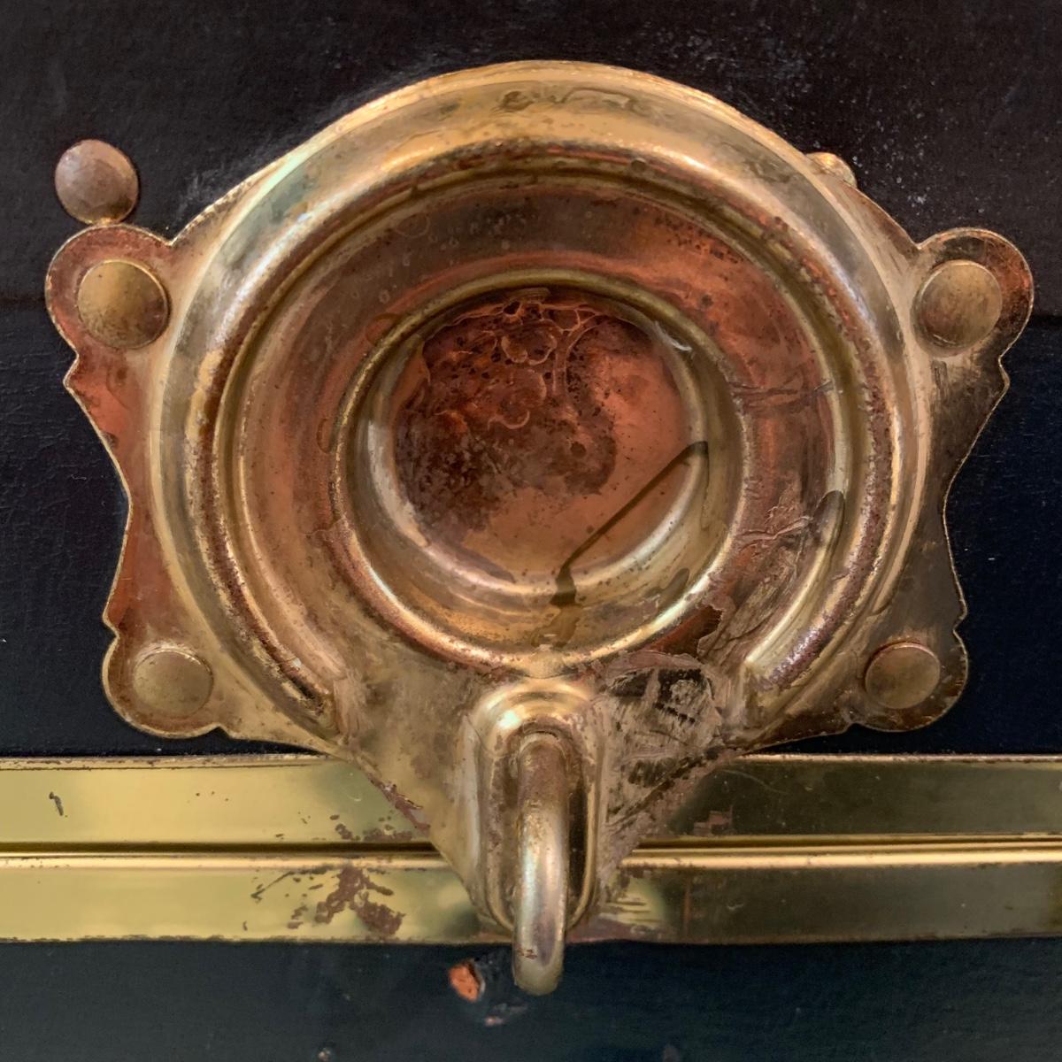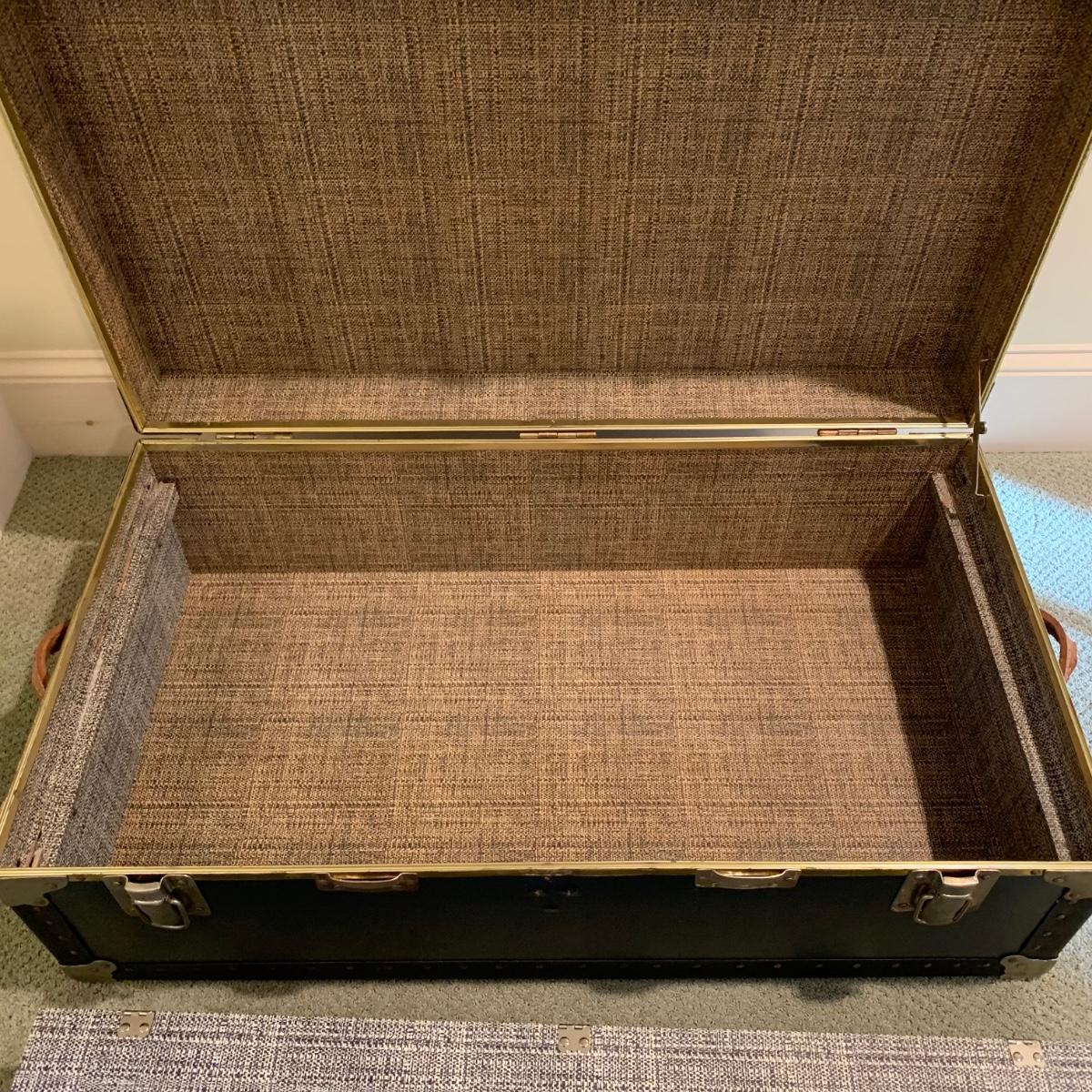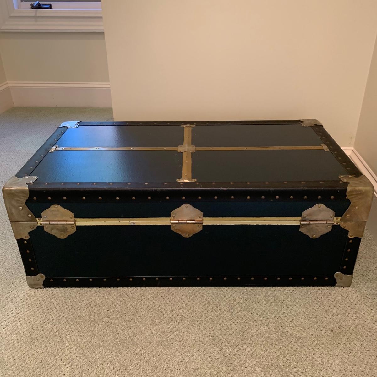 Navy blue steamer truck with insert. Solid trunk. Lid closes and fits flush with the rest of the unit. Trunk measures, 36” x 20” x 13”H. No lock or keys included. Local pickup only.