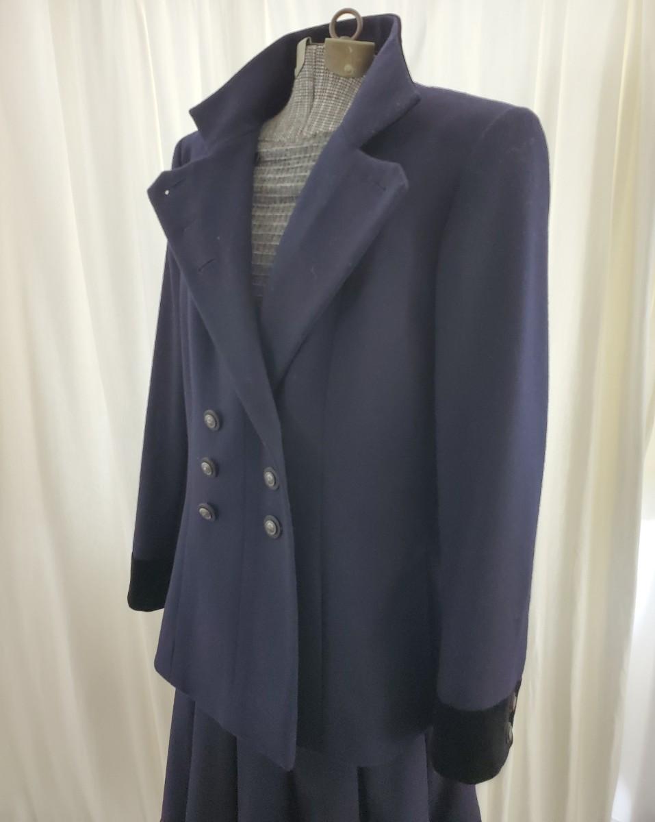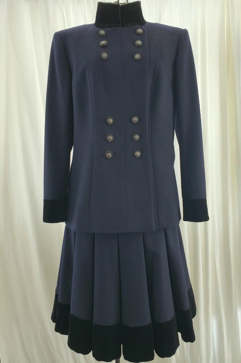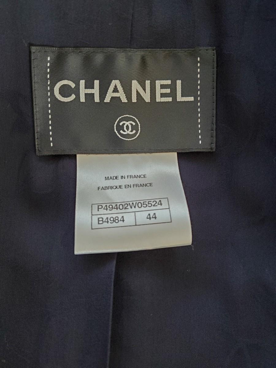 Navy Chanel wool and alpaca-blend double-breasted jacket with structured shoulders, velvet collar and cuffs, dual vent and button closures at front. Look 41 From the Pre-Fall 2014 Métiers d'Art Runway. Size 44