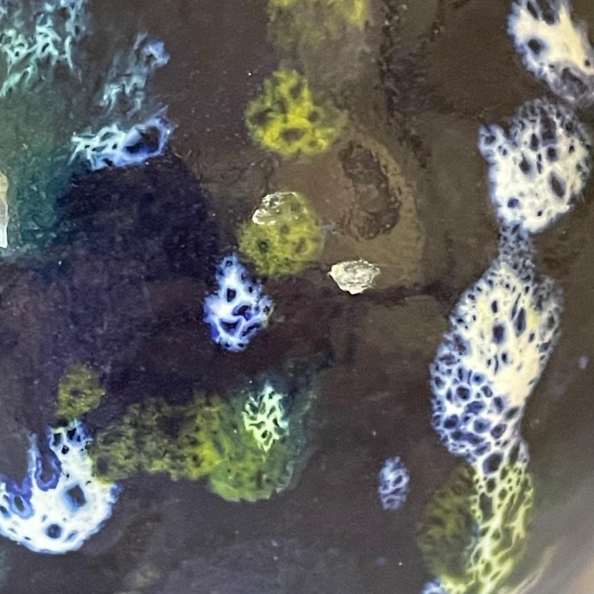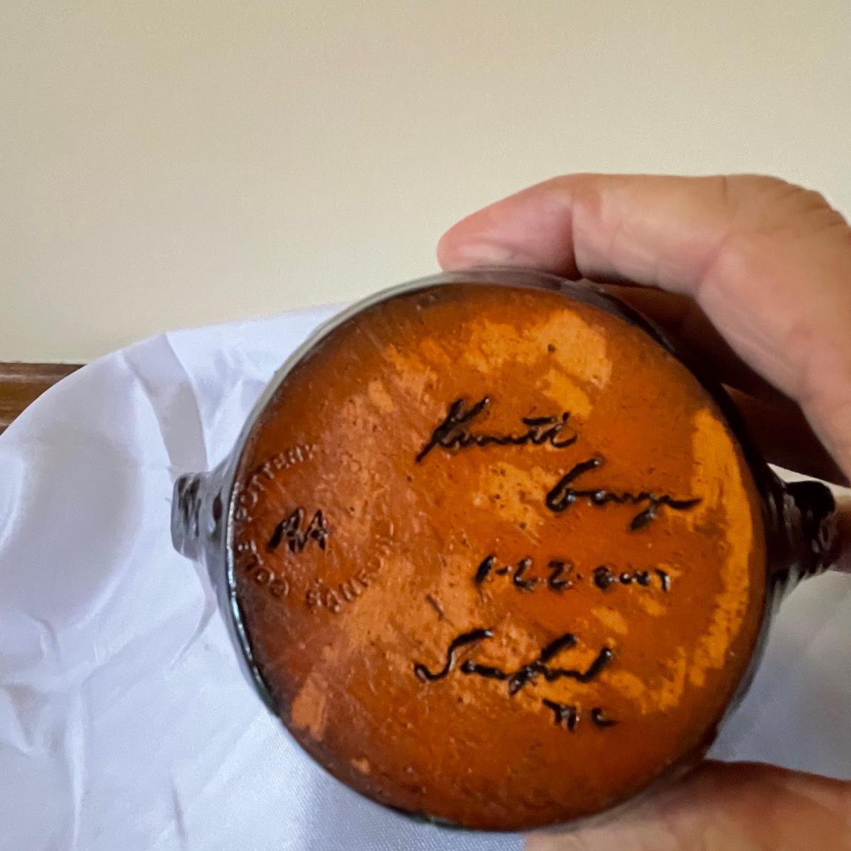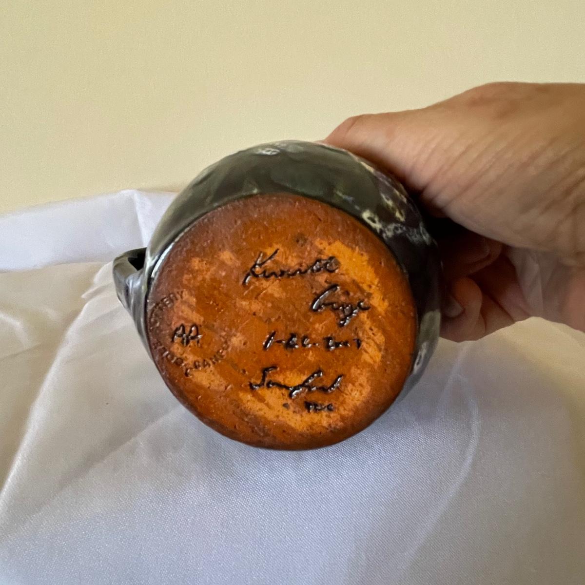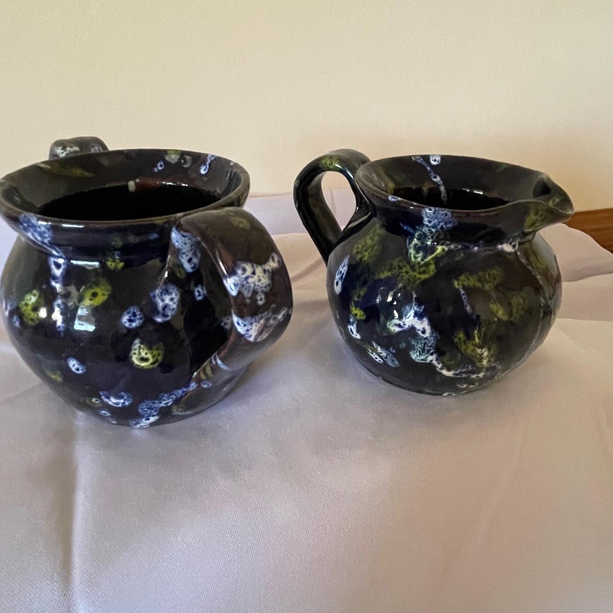 This matching due are from Cole Pottery in NC and signed by Kenneth George. They have a dark blue glaze with small dabs and runs of white and green.