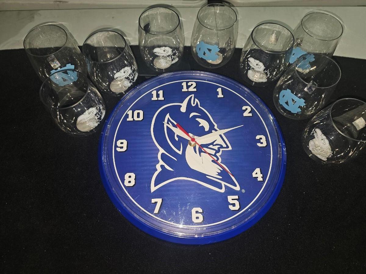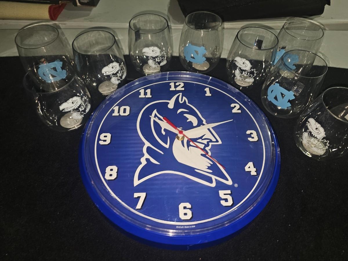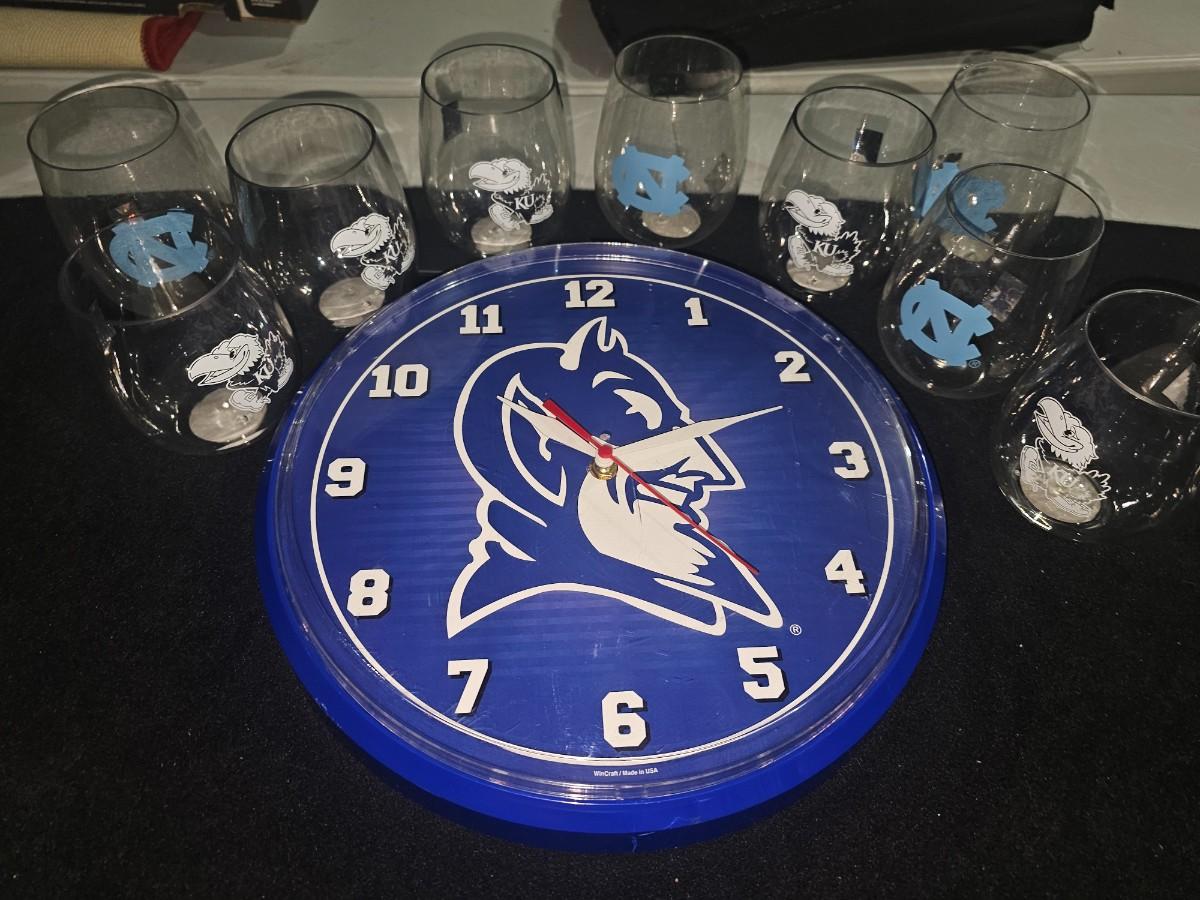 NCAA Kansas Jayhawks UNC Tarheels Duke Bluedevils Glasses Clock Lot
