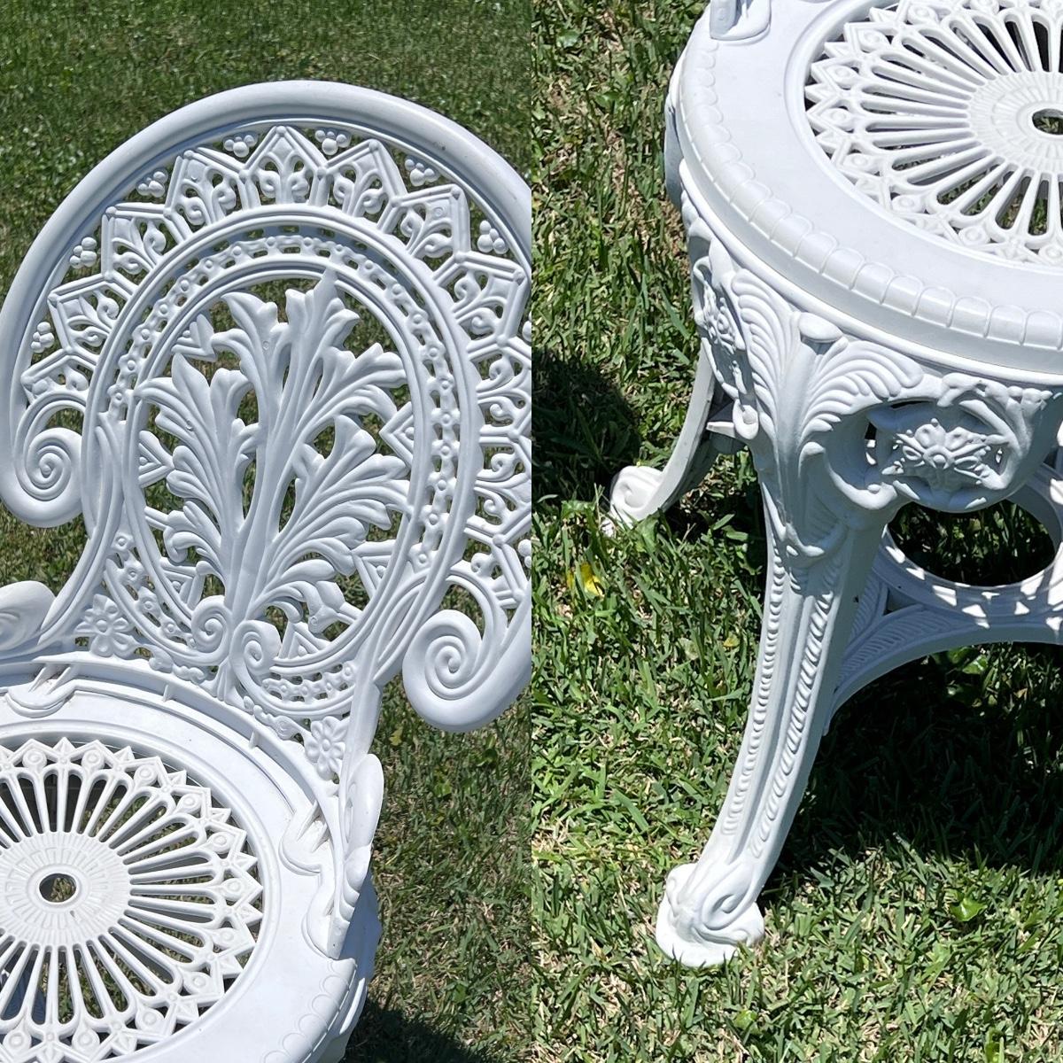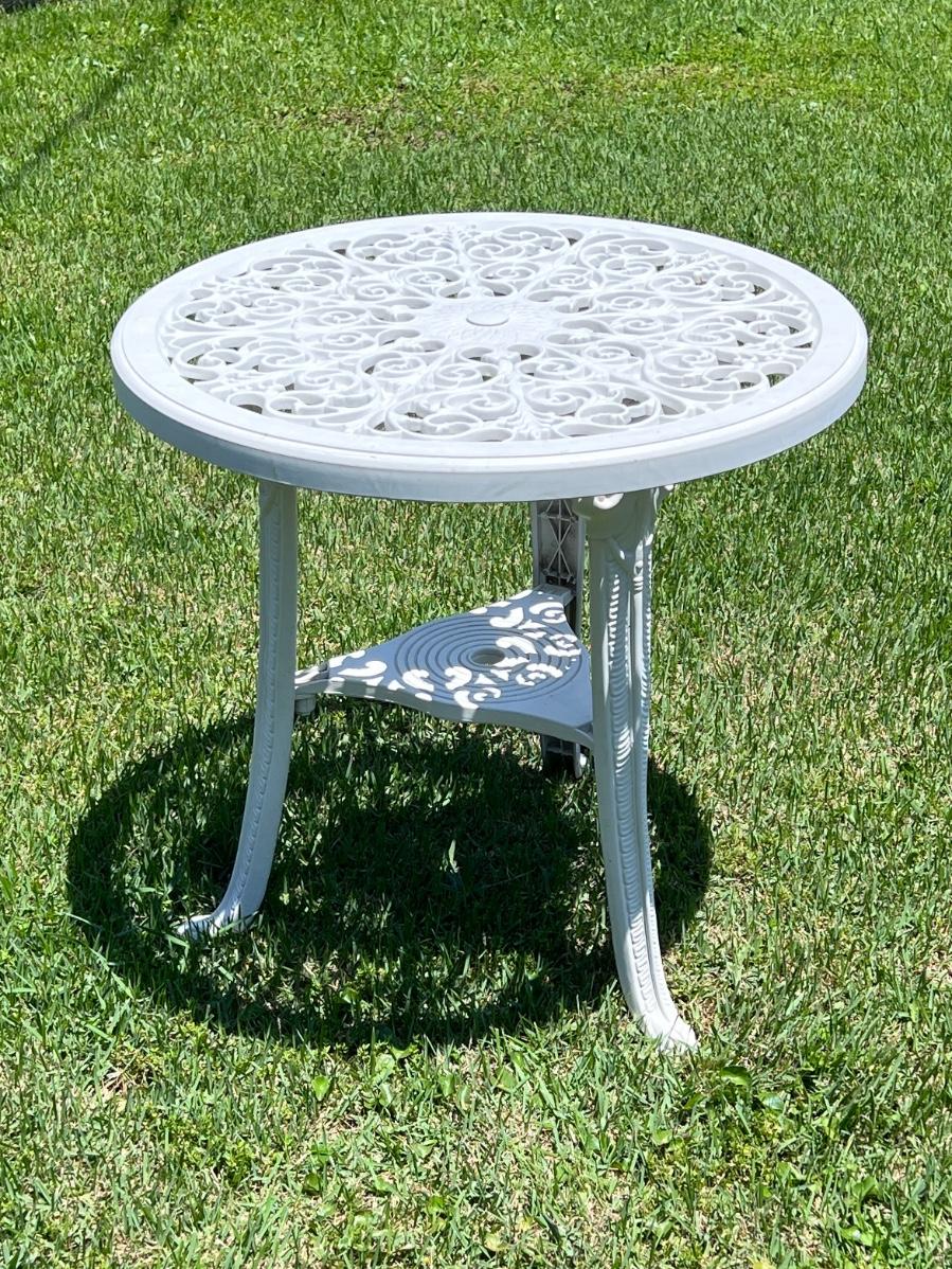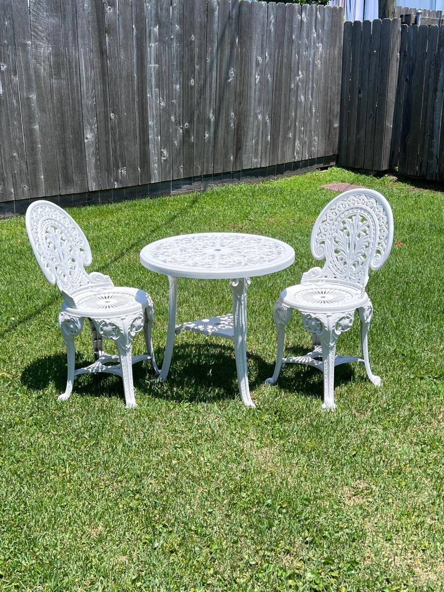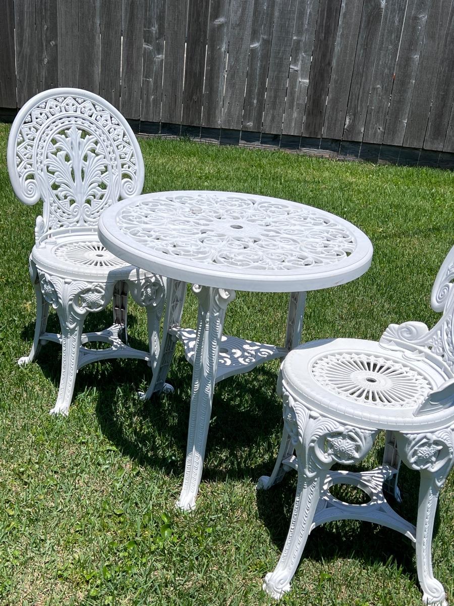Made of a Rubbermaid material, made to look like metal. Patio kept. Table = 26.25” H x 26.5” Round. Both chairs = 34.5” H x 16.6” W x 20” D.