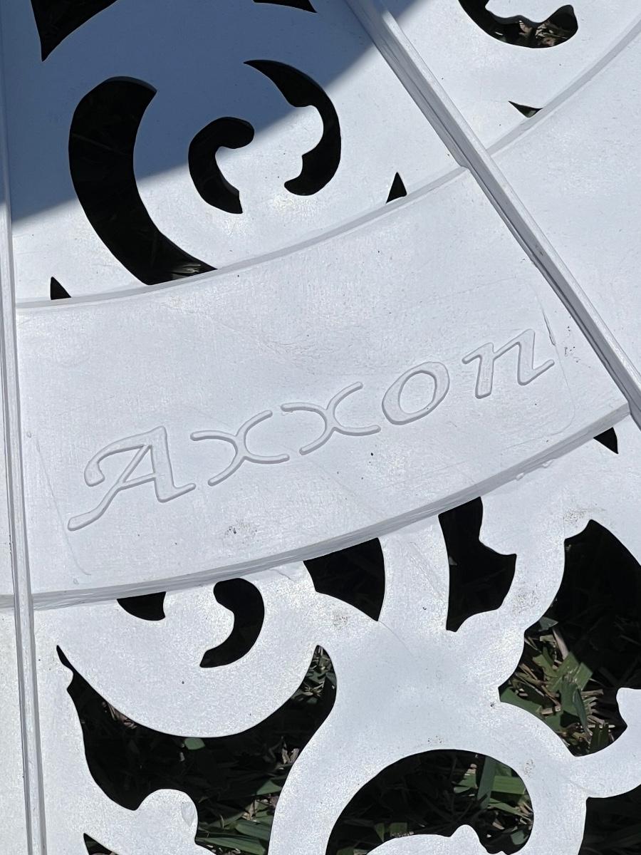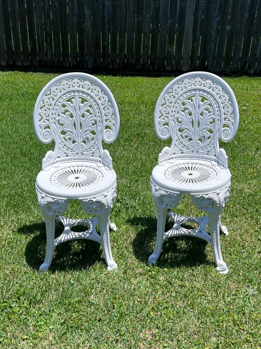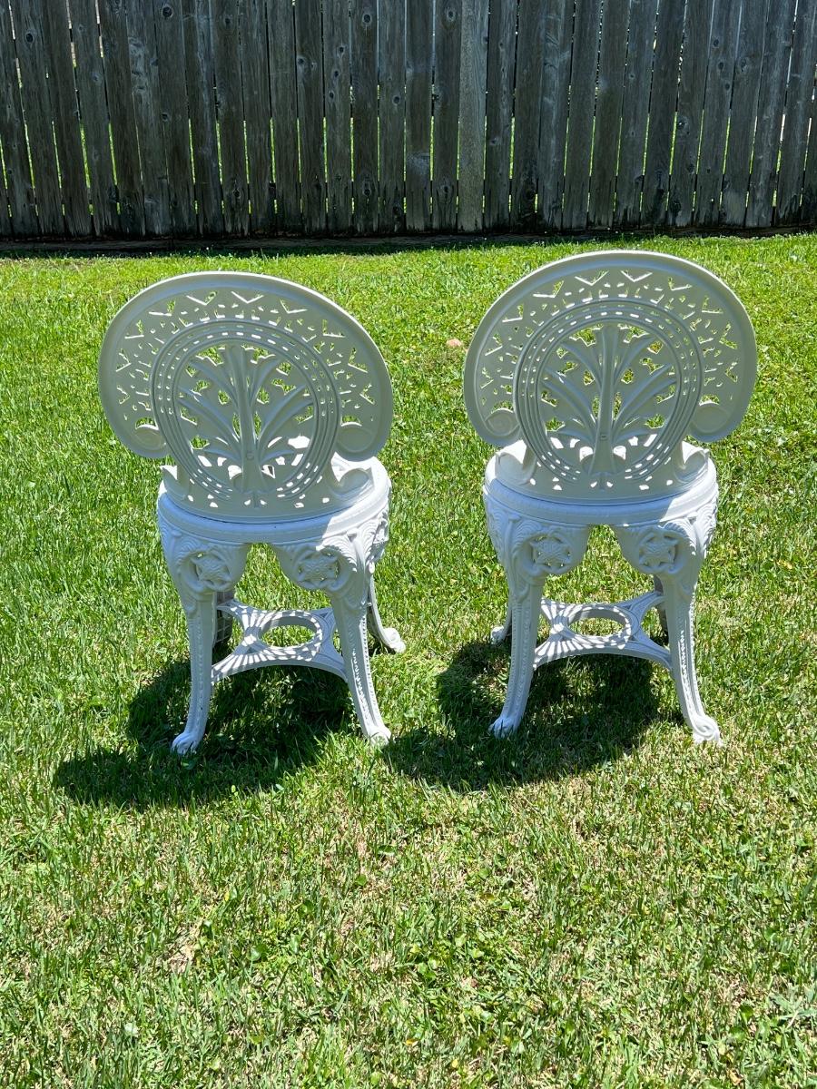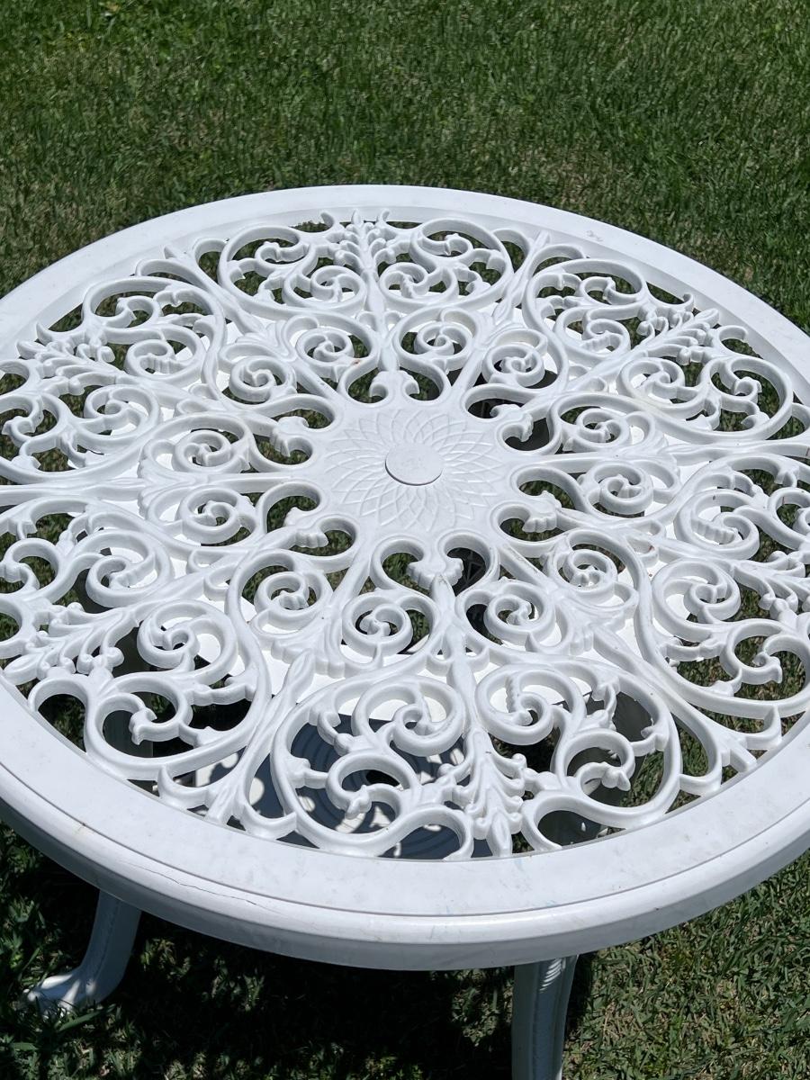 Made of a Rubbermaid material, made to look like metal. Patio kept. Table = 26.25” H x 26.5” Round. Both chairs = 34.5” H x 16.6” W x 20” D.