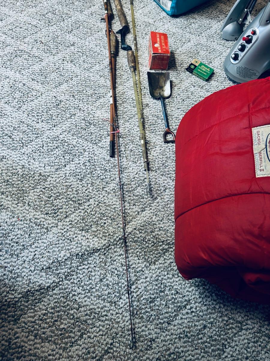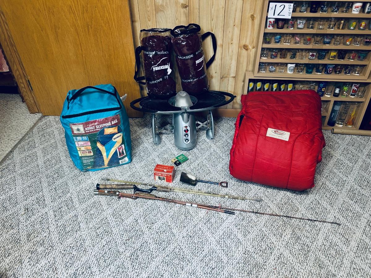 NICE CAMPING/TAILGATE PORTABLE GAS GRILL, VTG FISHING POLES, SLEEPING BAGS AND MORE!