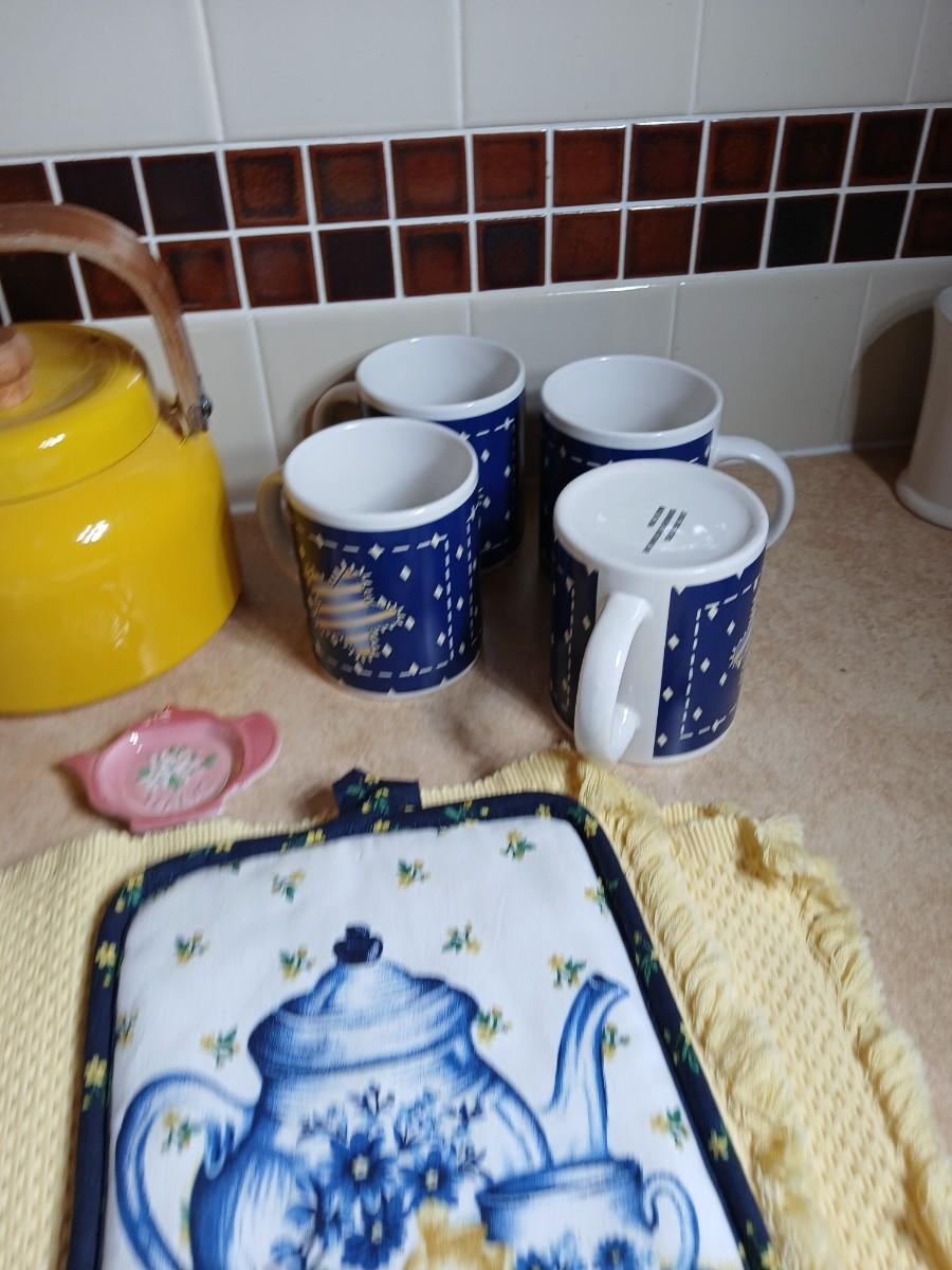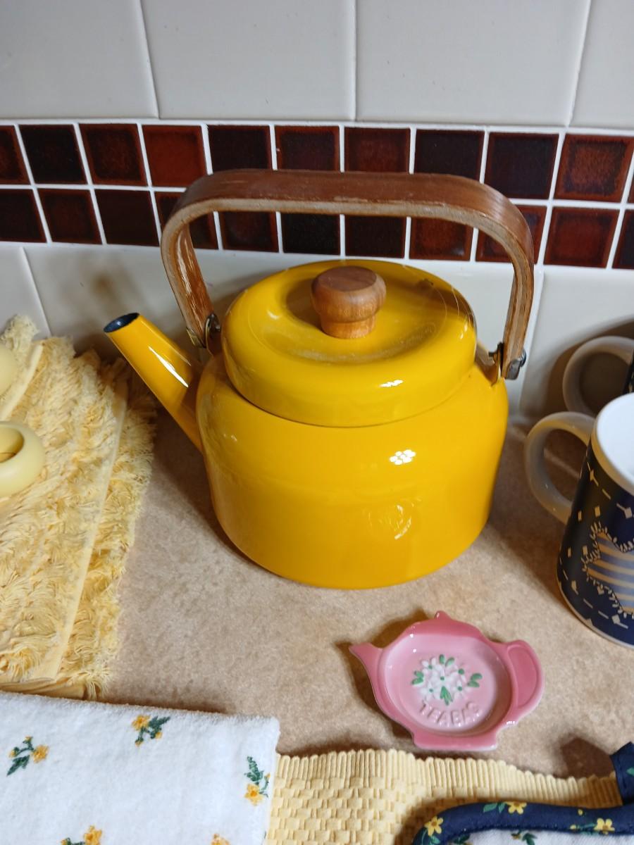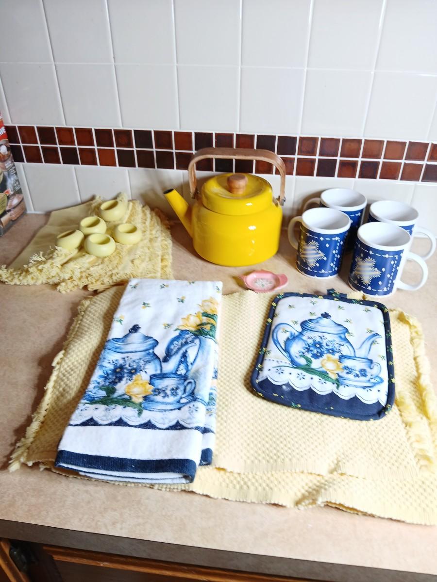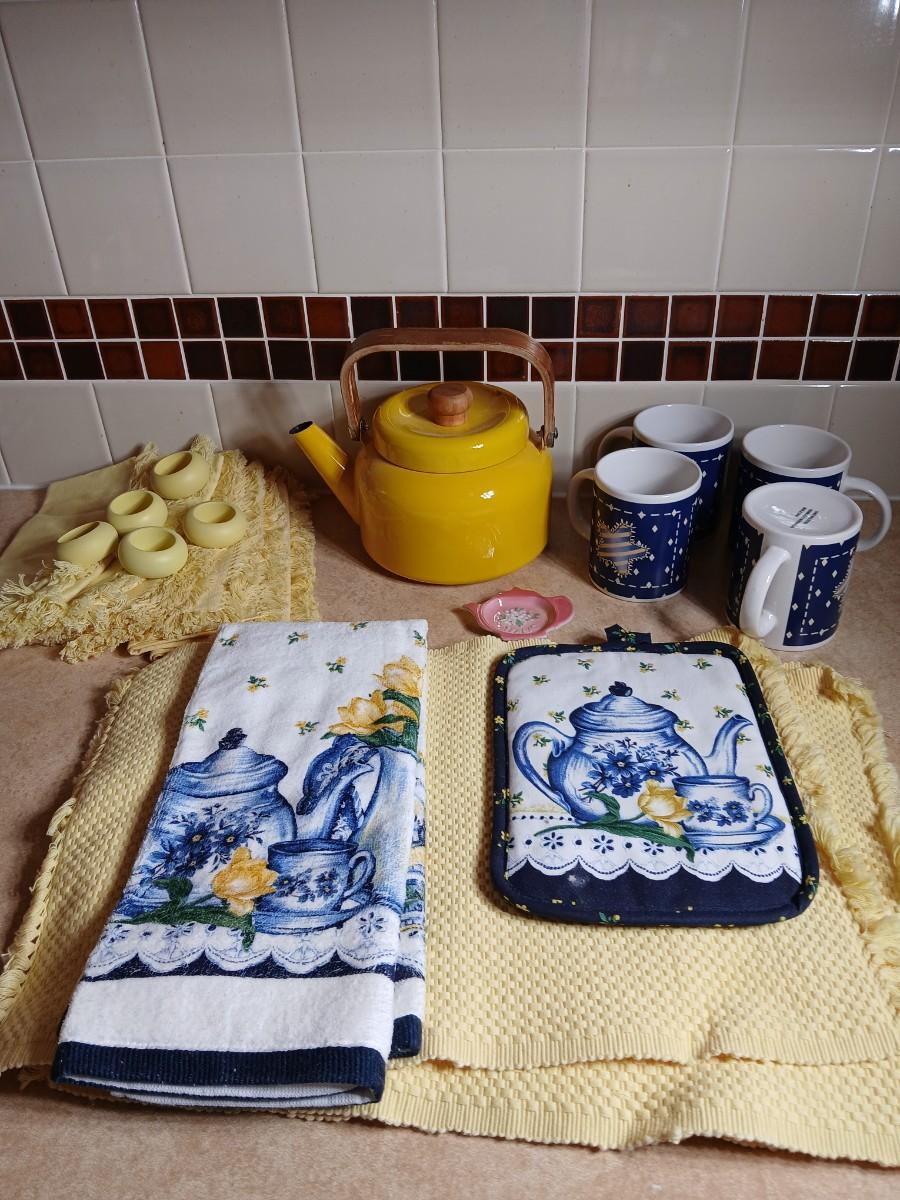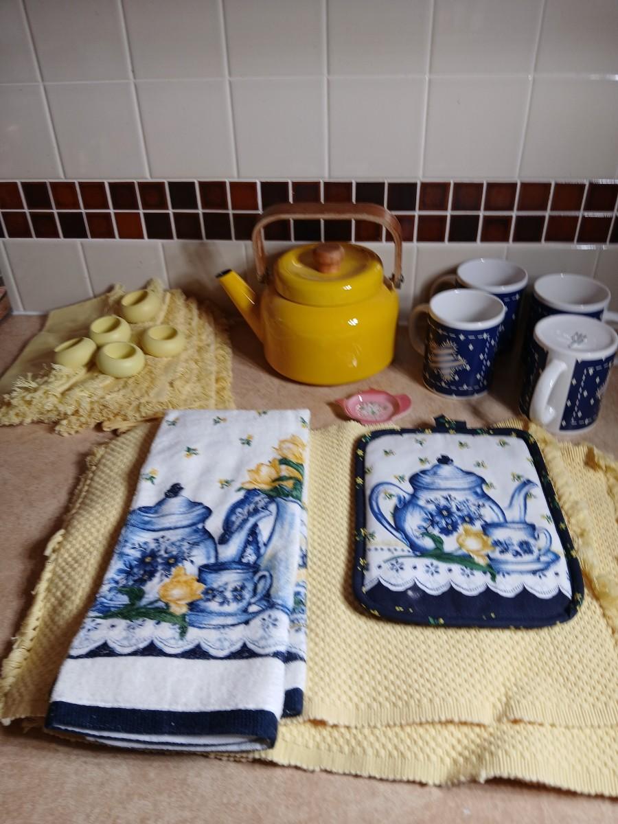 Neat enamel yellow tea pot with star fun mugs and tea themed towels to match