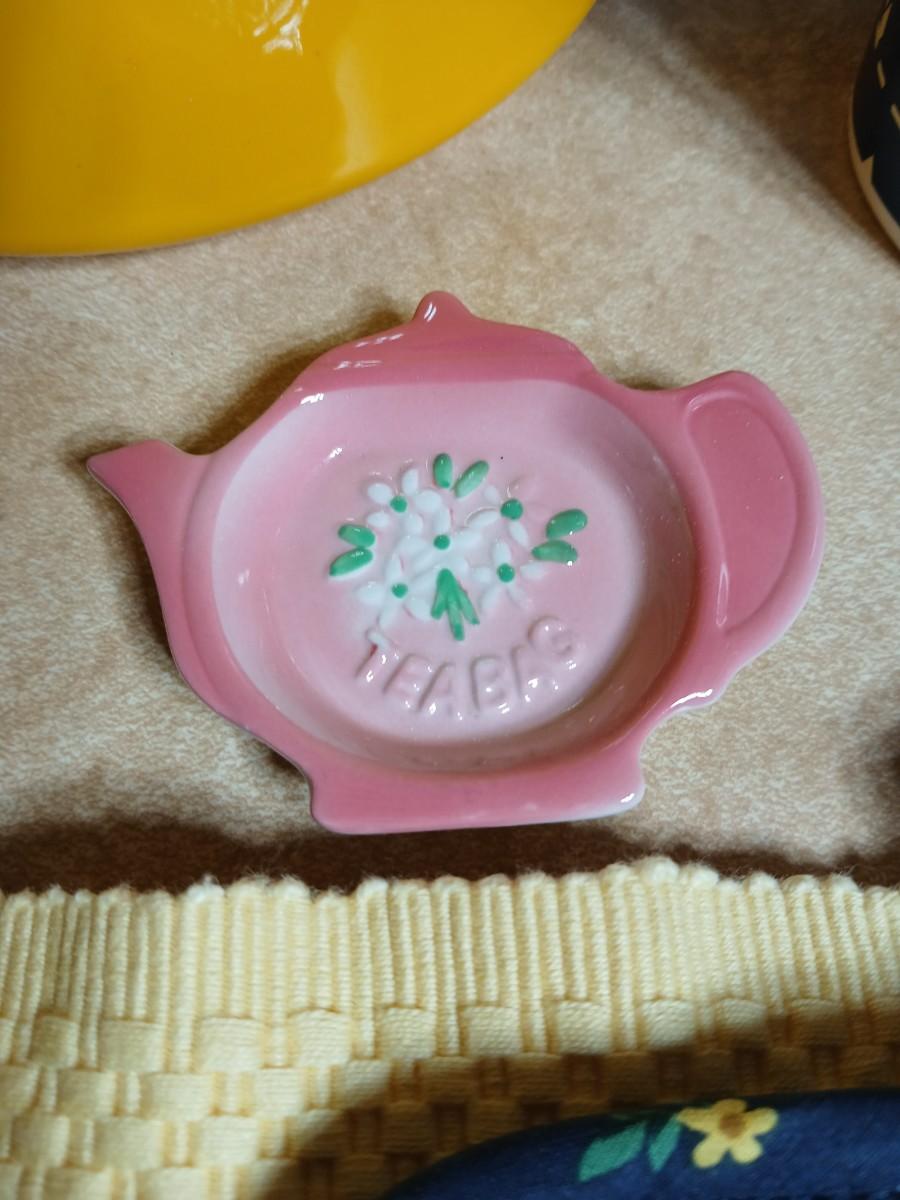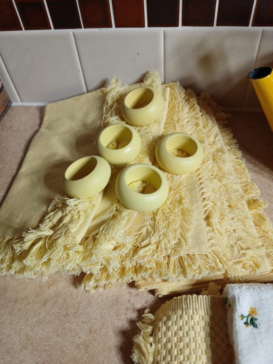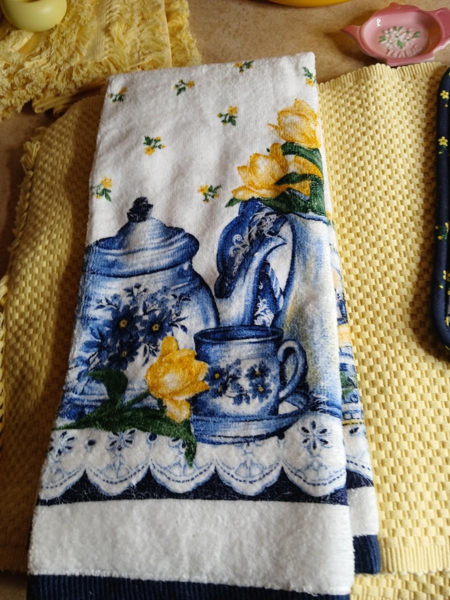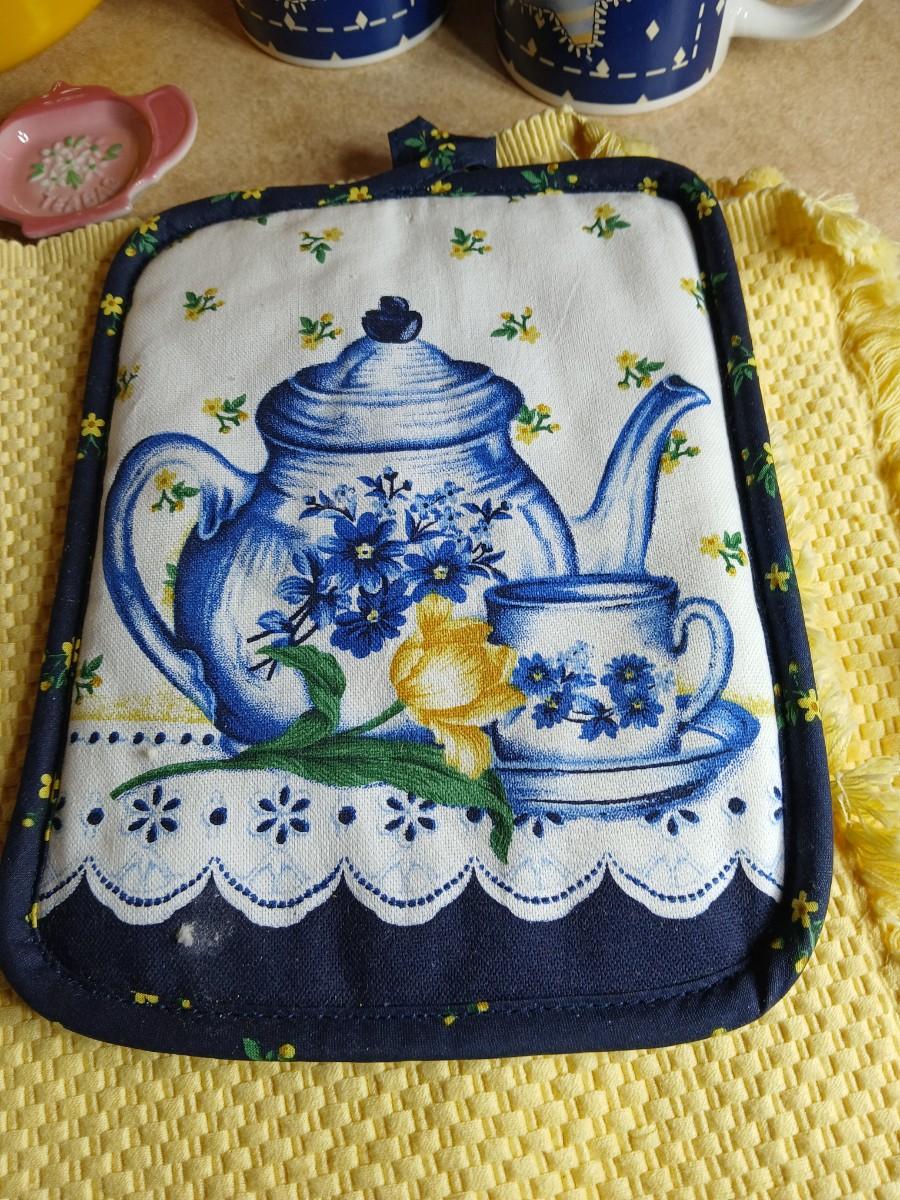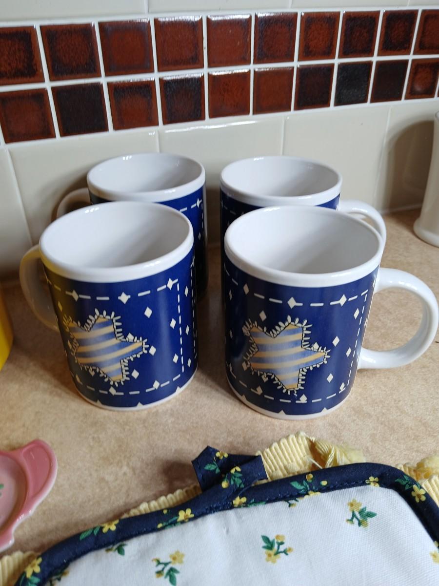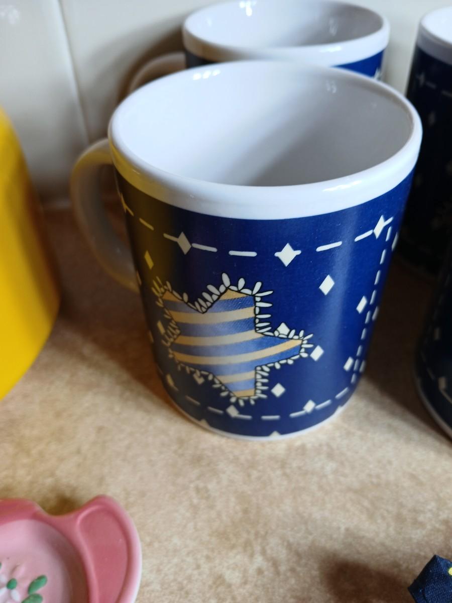 Neat enamel yellow tea pot with star fun mugs and tea themed towels to match