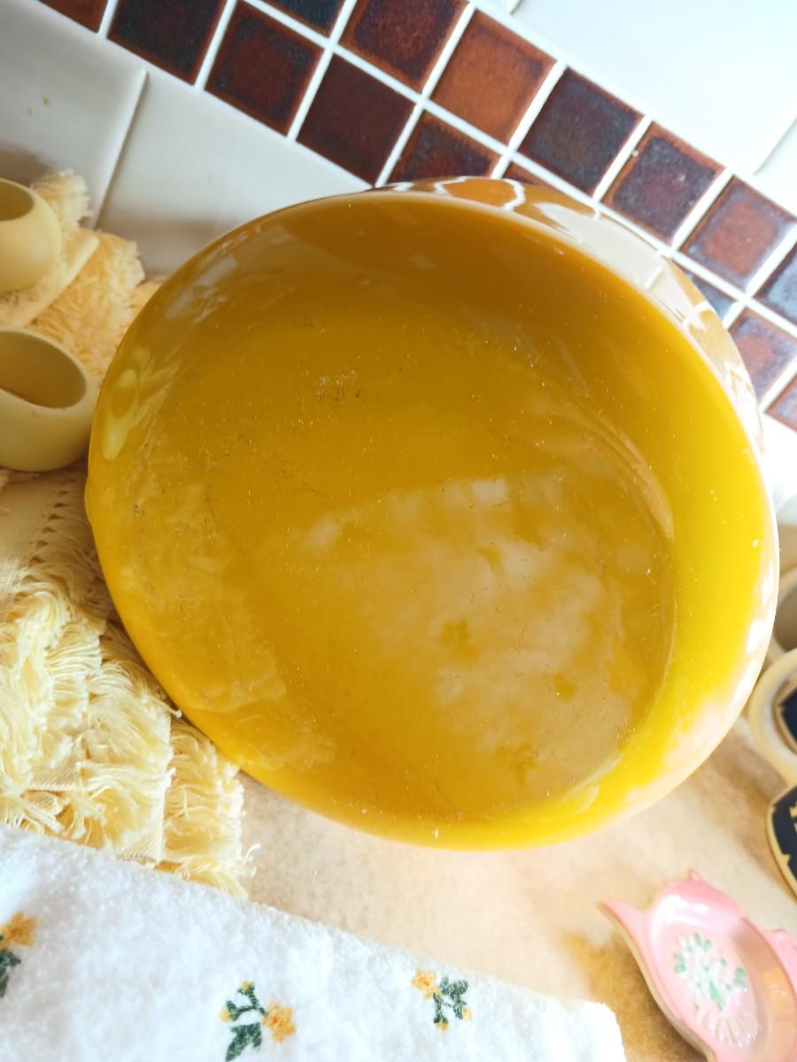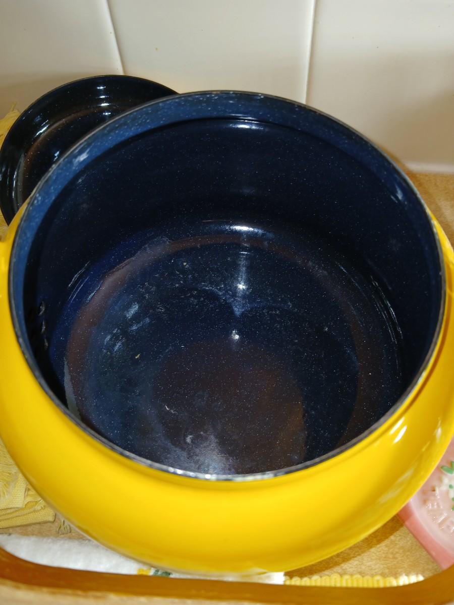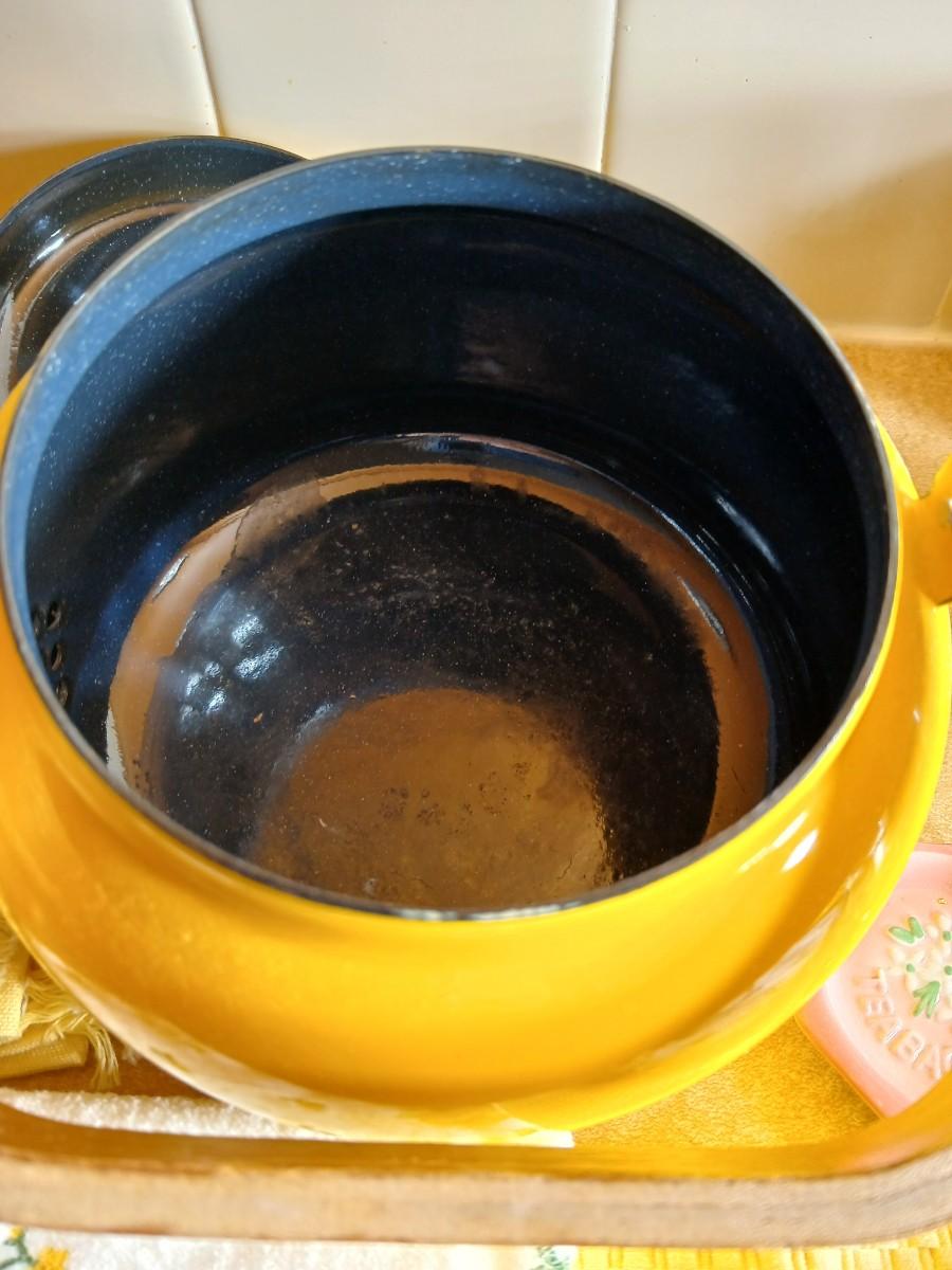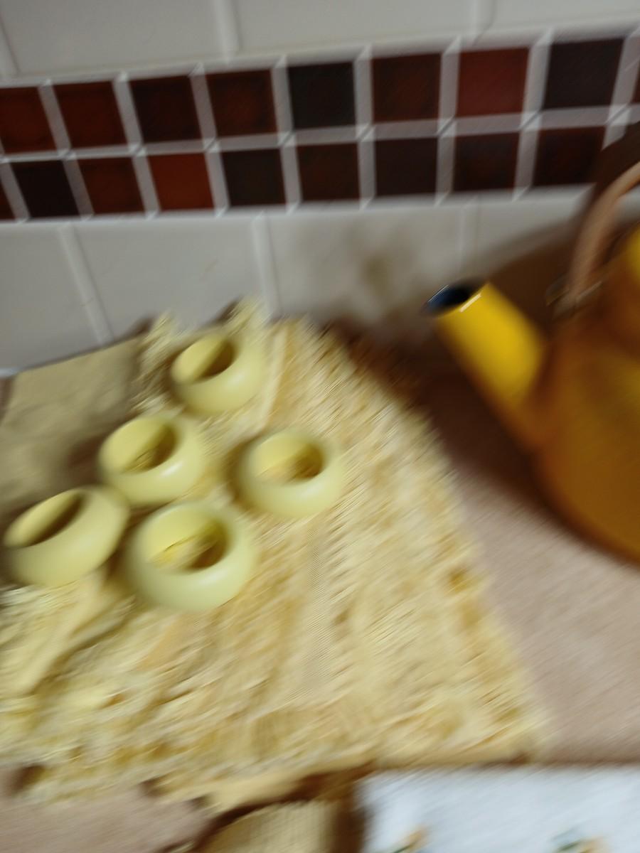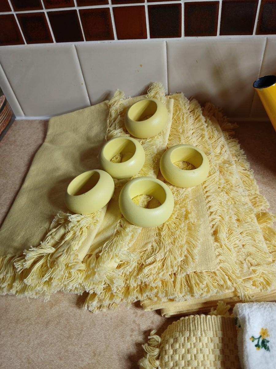 Neat enamel yellow tea pot with star fun mugs and tea themed towels to match