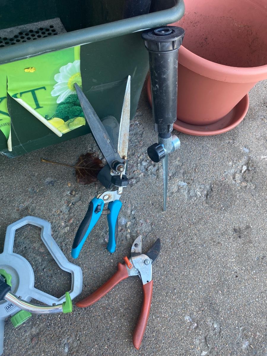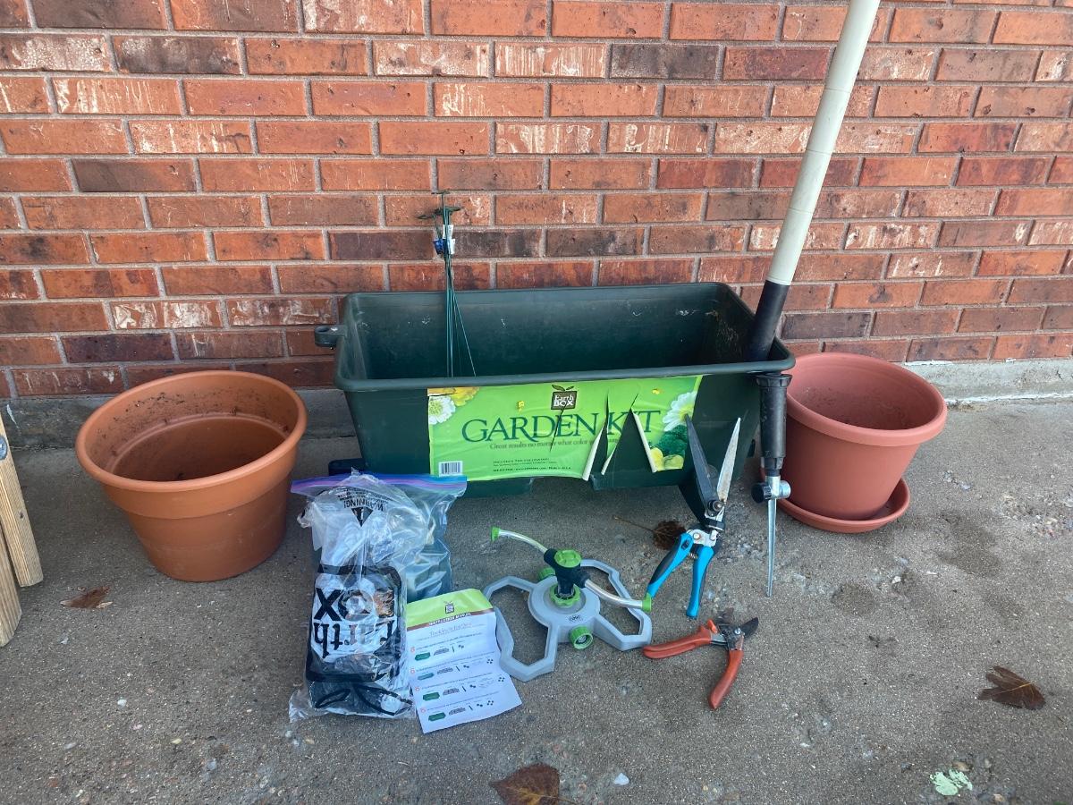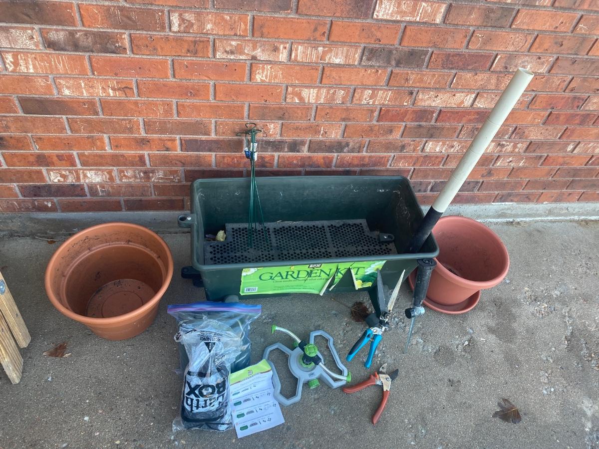 NEAT LITTLE GARDEN KIT PLANTER BOX WITH COVER, PLANTERS, YARD HAND TOOLS, SPRINKLER AND MORE!
