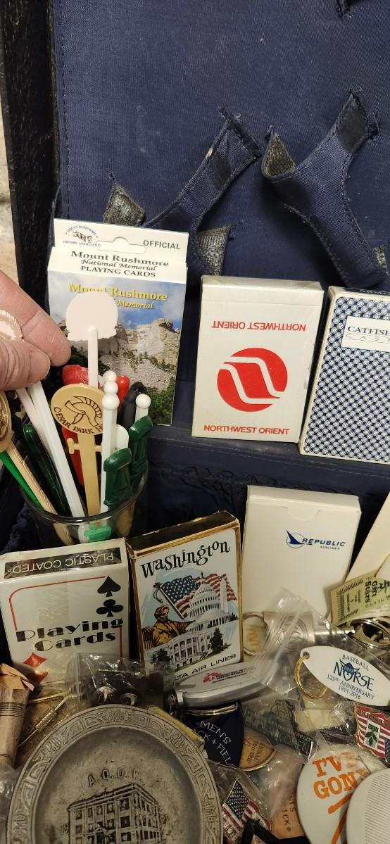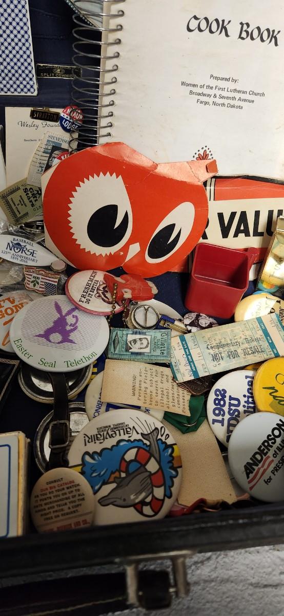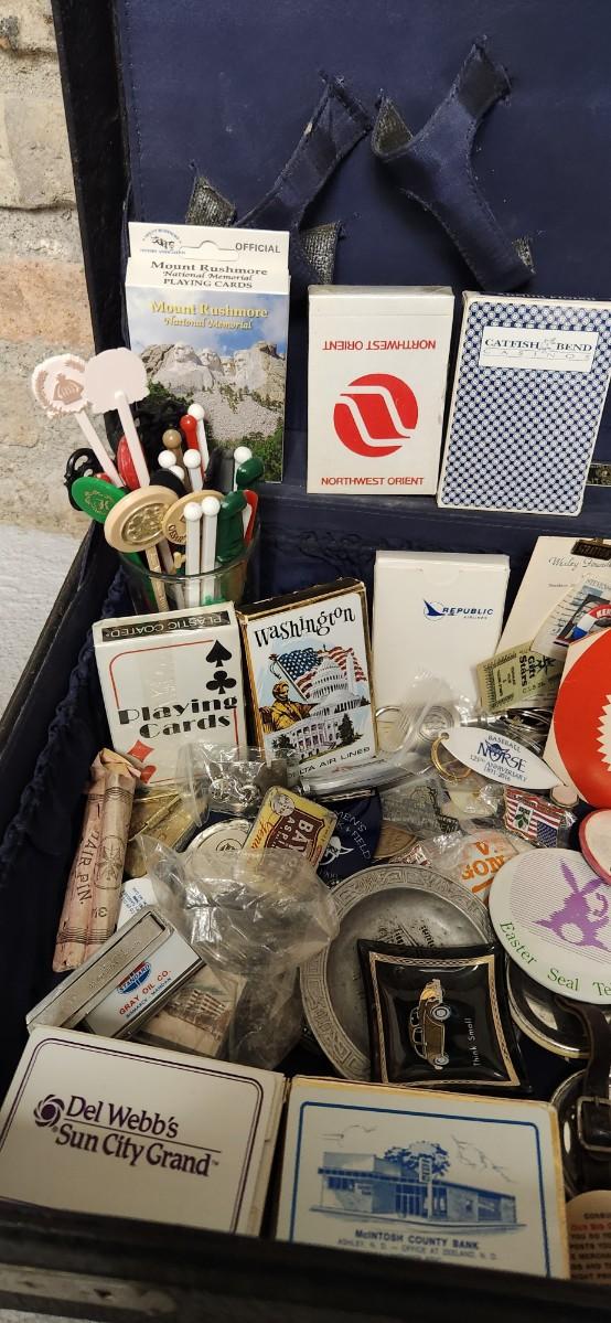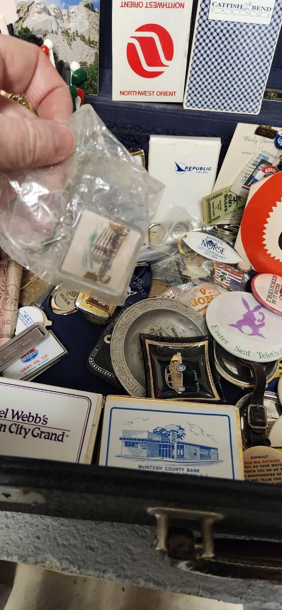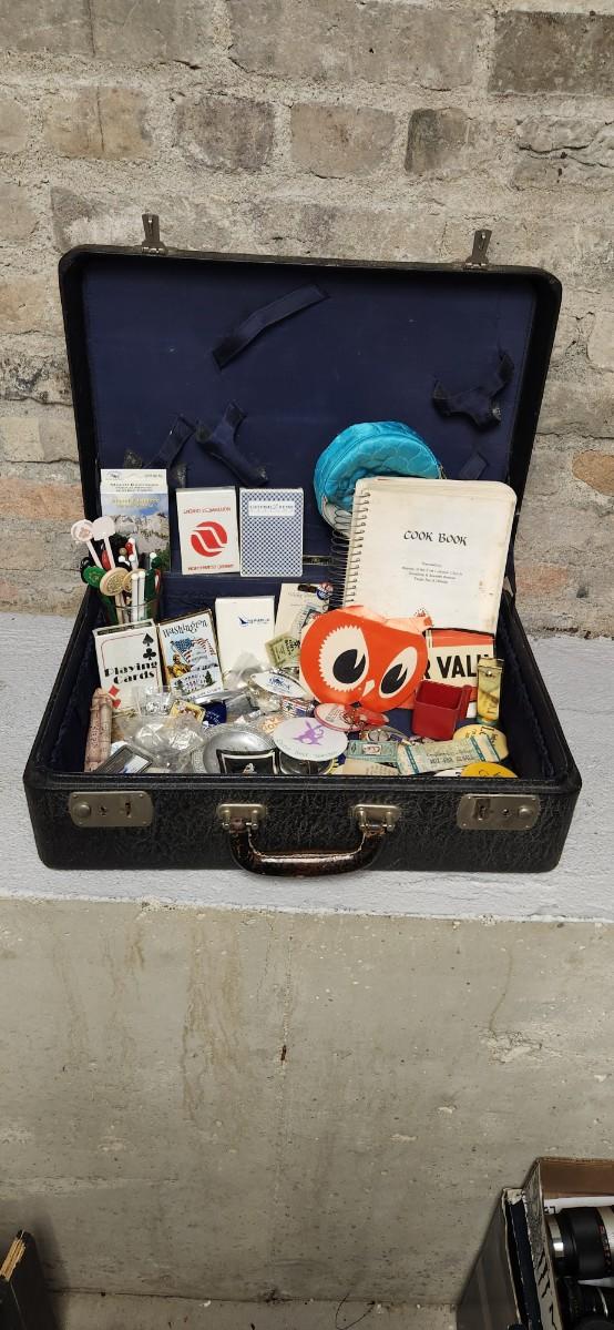 That case might have been a salesman case or bar case, it is filled with cards, buttons, keychains, advertising give aways etc.