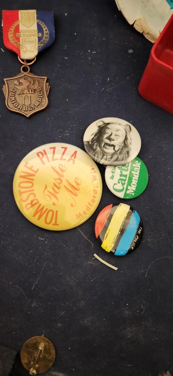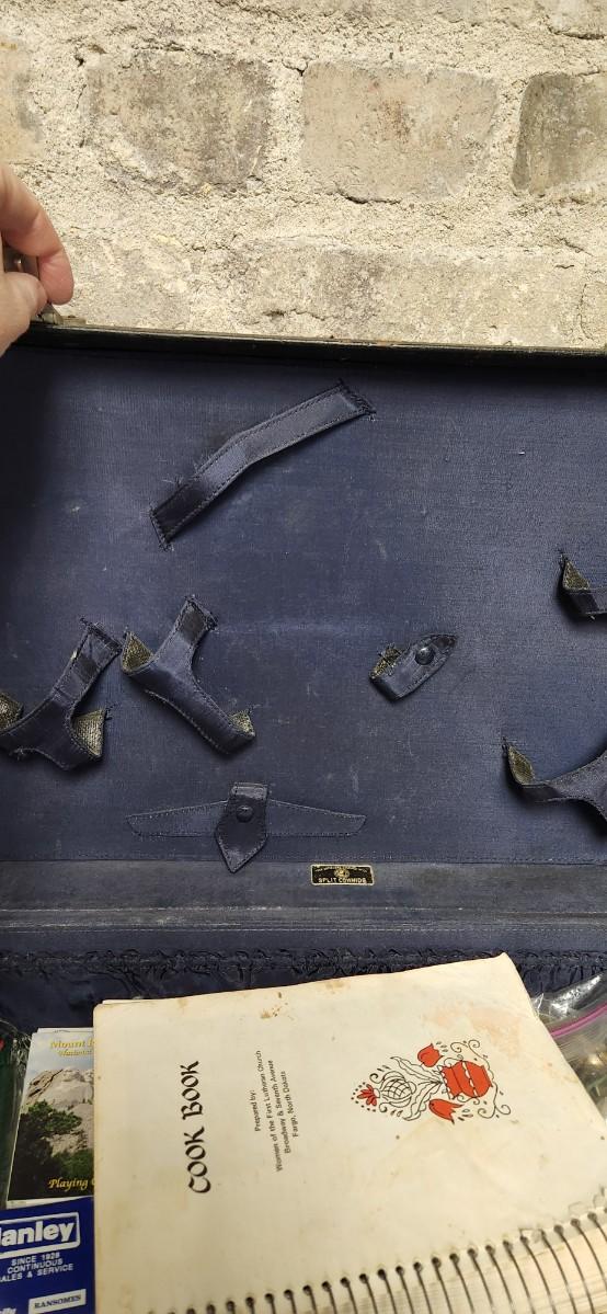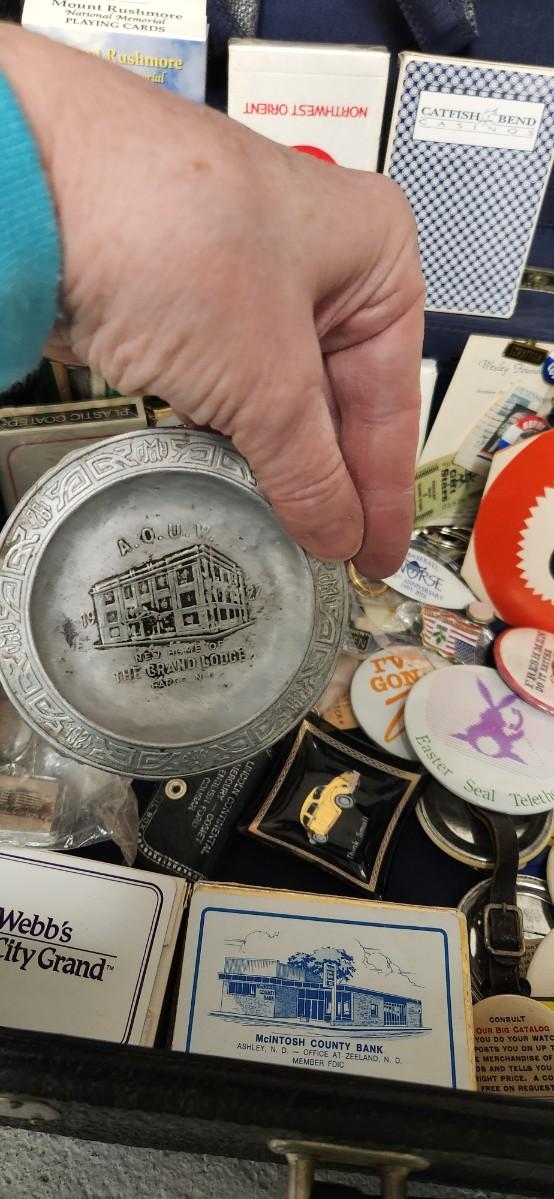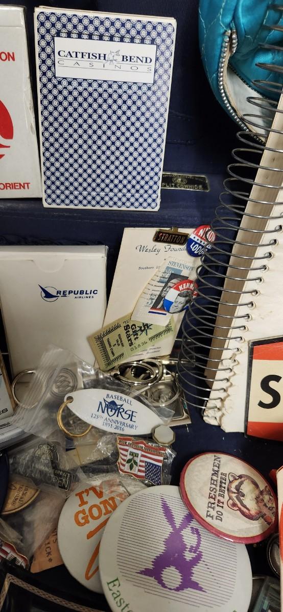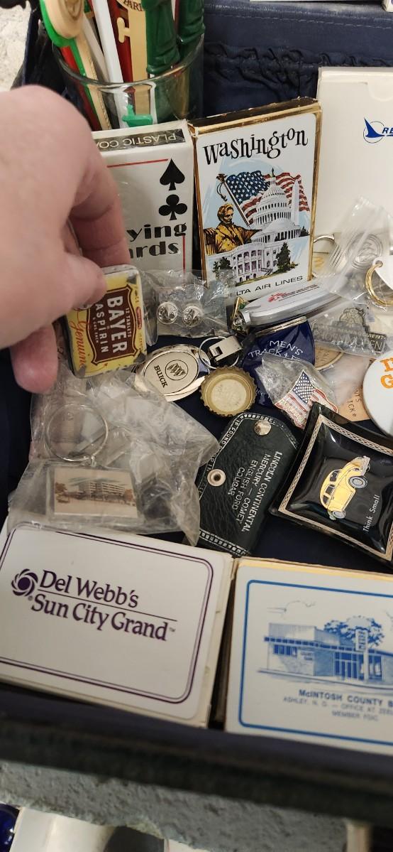 That case might have been a salesman case or bar case, it is filled with cards, buttons, keychains, advertising give aways etc.