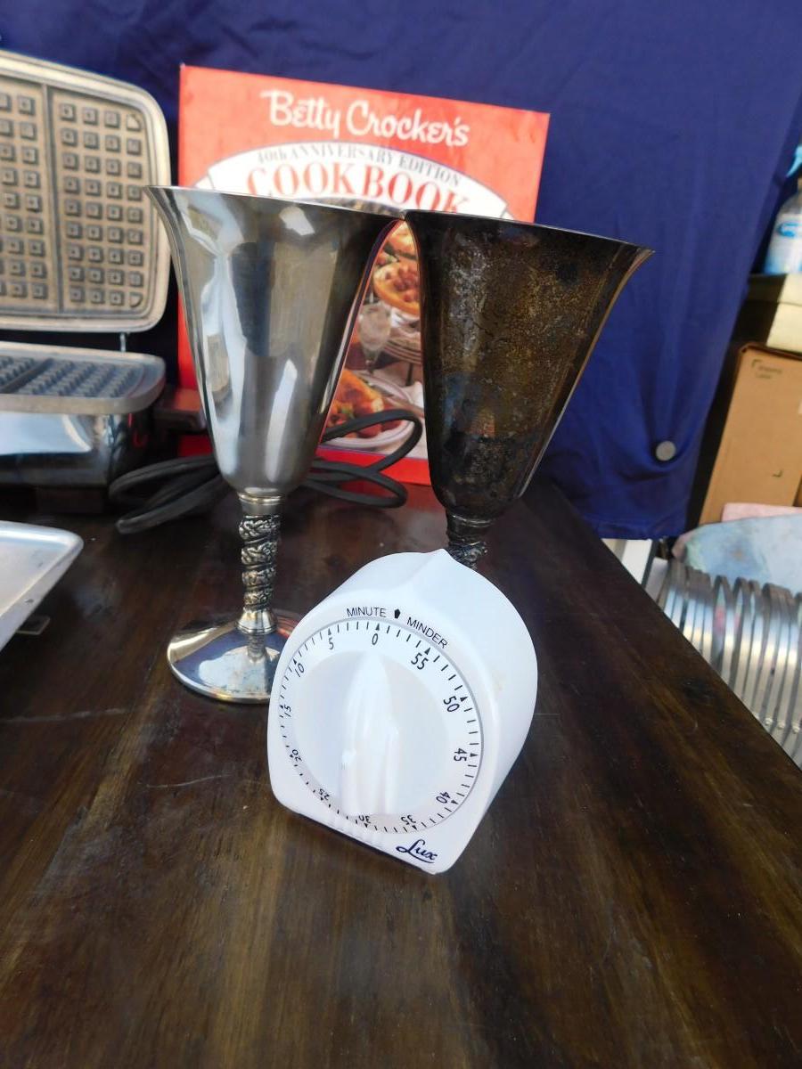 COOKBOOK, SILVERPLATE STEMMED GLASSES, AND LUX TIMER