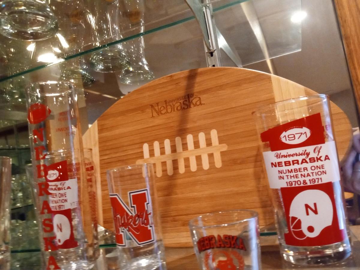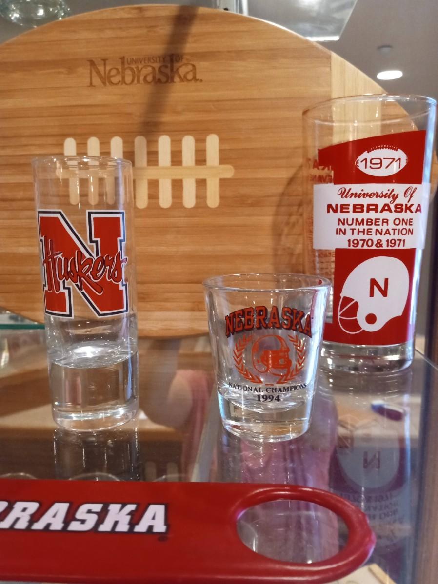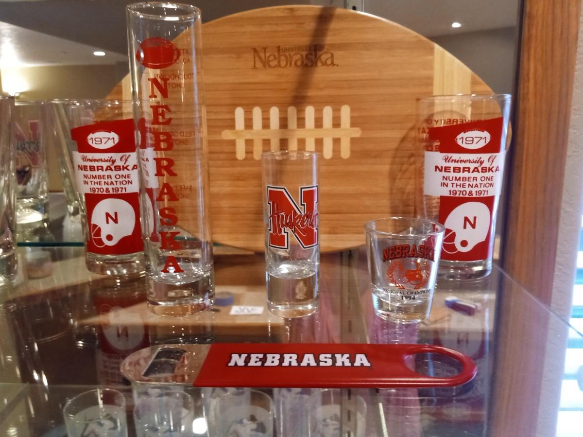 NEBRASKA HUSKERS WOODEN CUTTING BOARD AND VARIOUS SHOT GLASSES