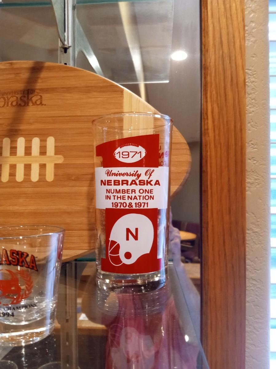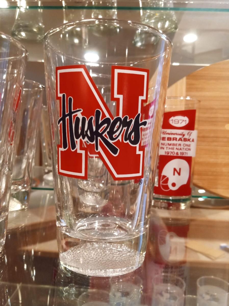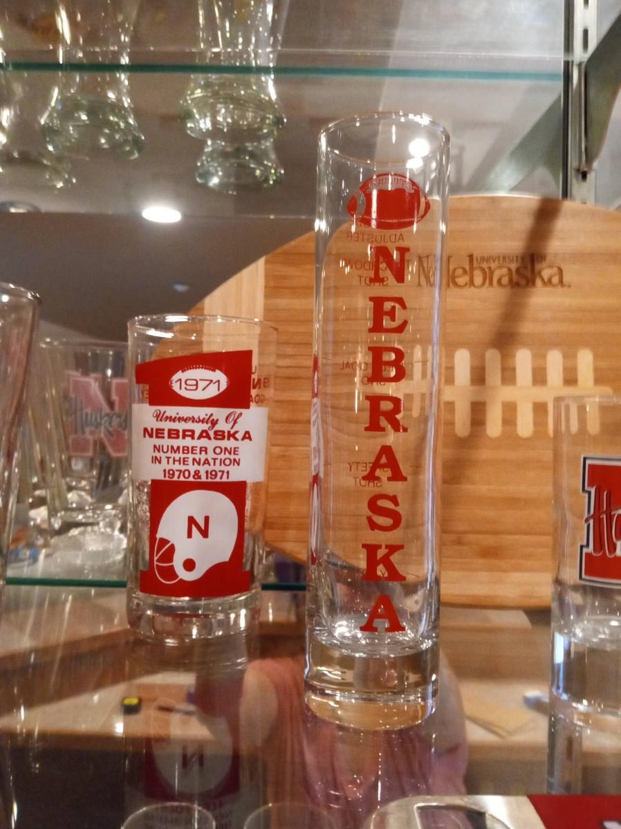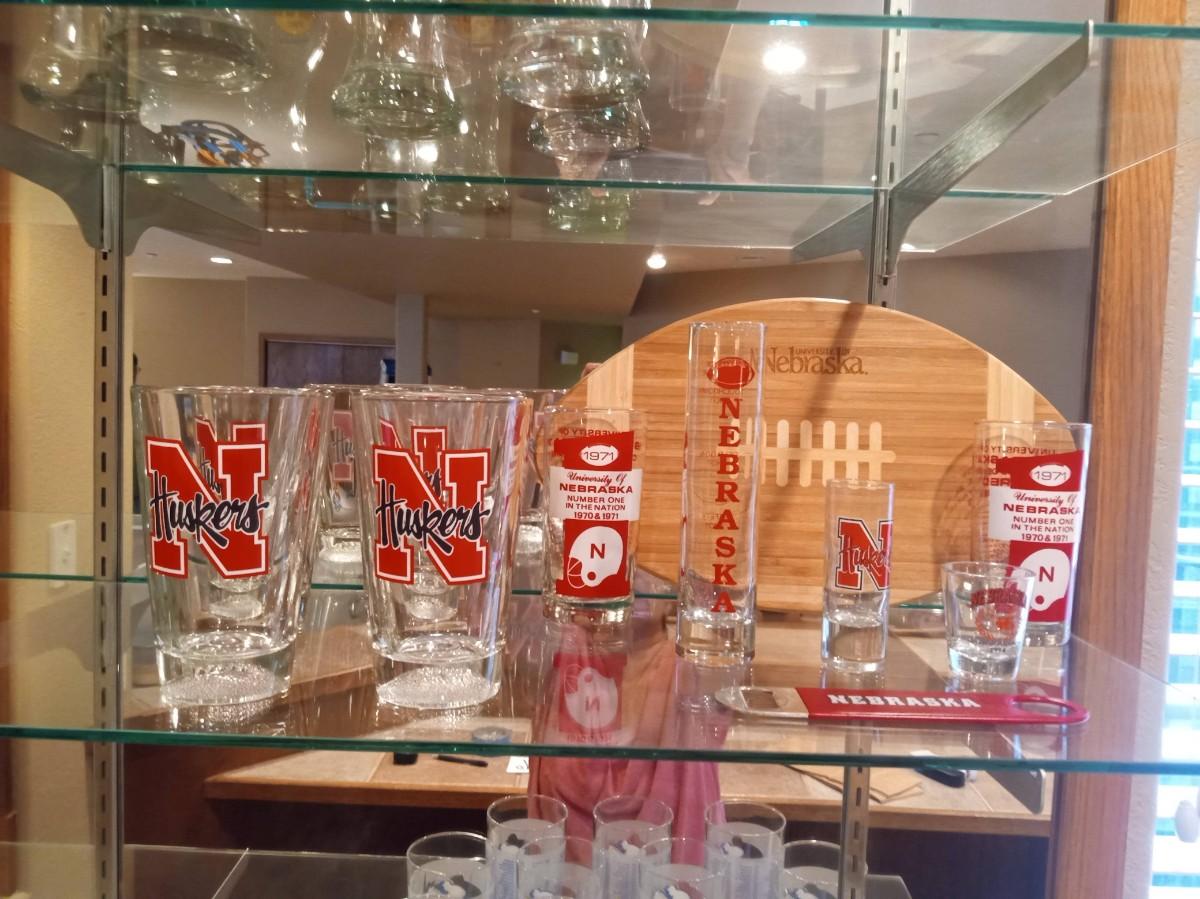 NEBRASKA HUSKERS WOODEN CUTTING BOARD AND VARIOUS SHOT GLASSES