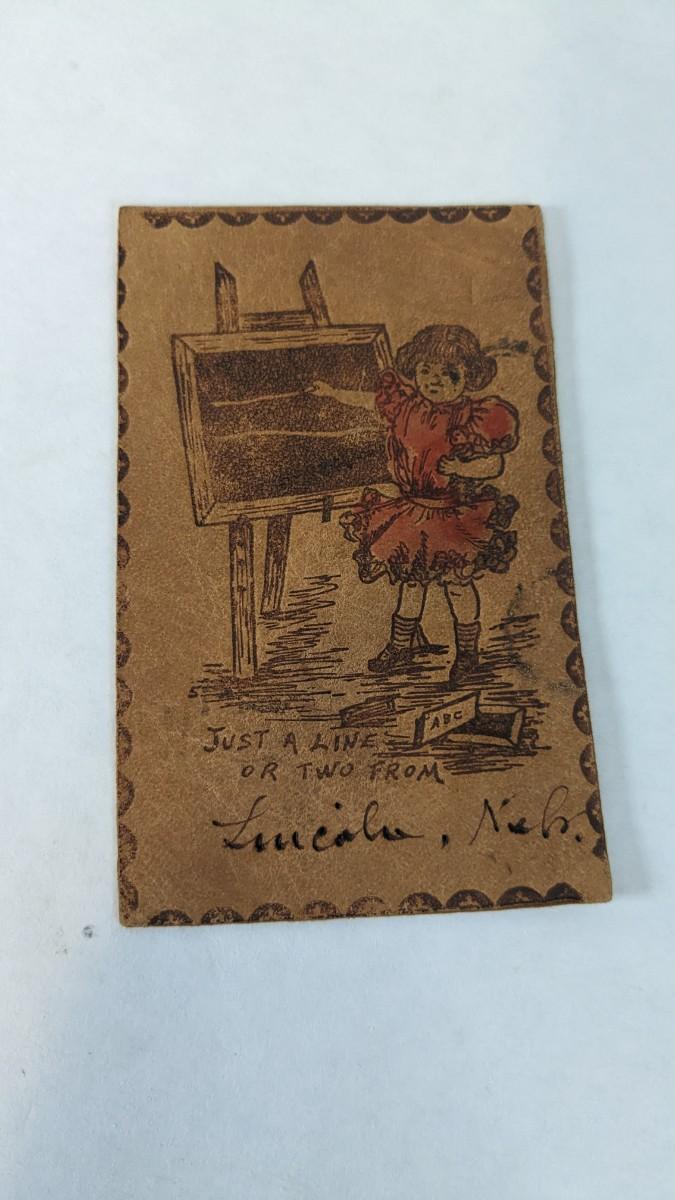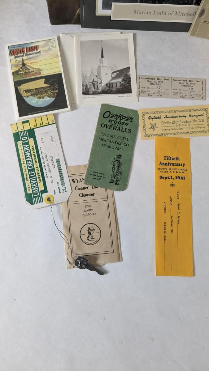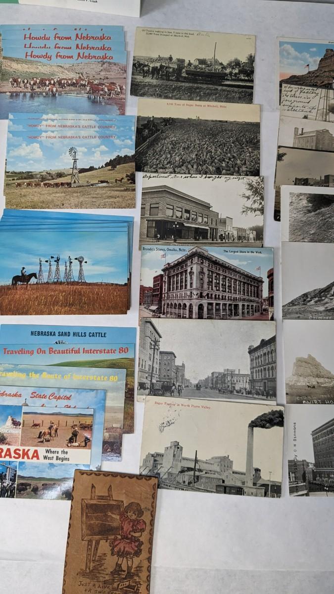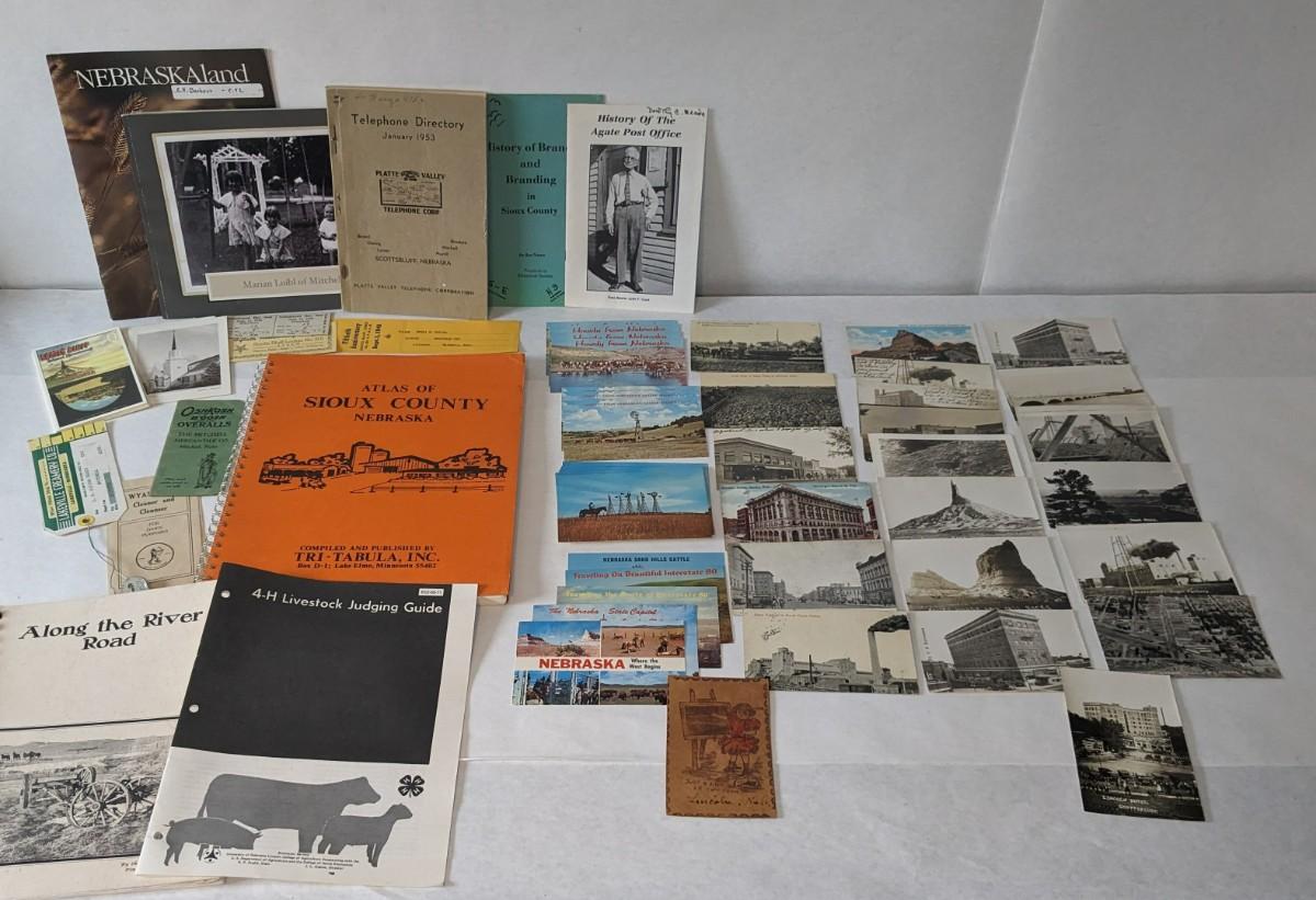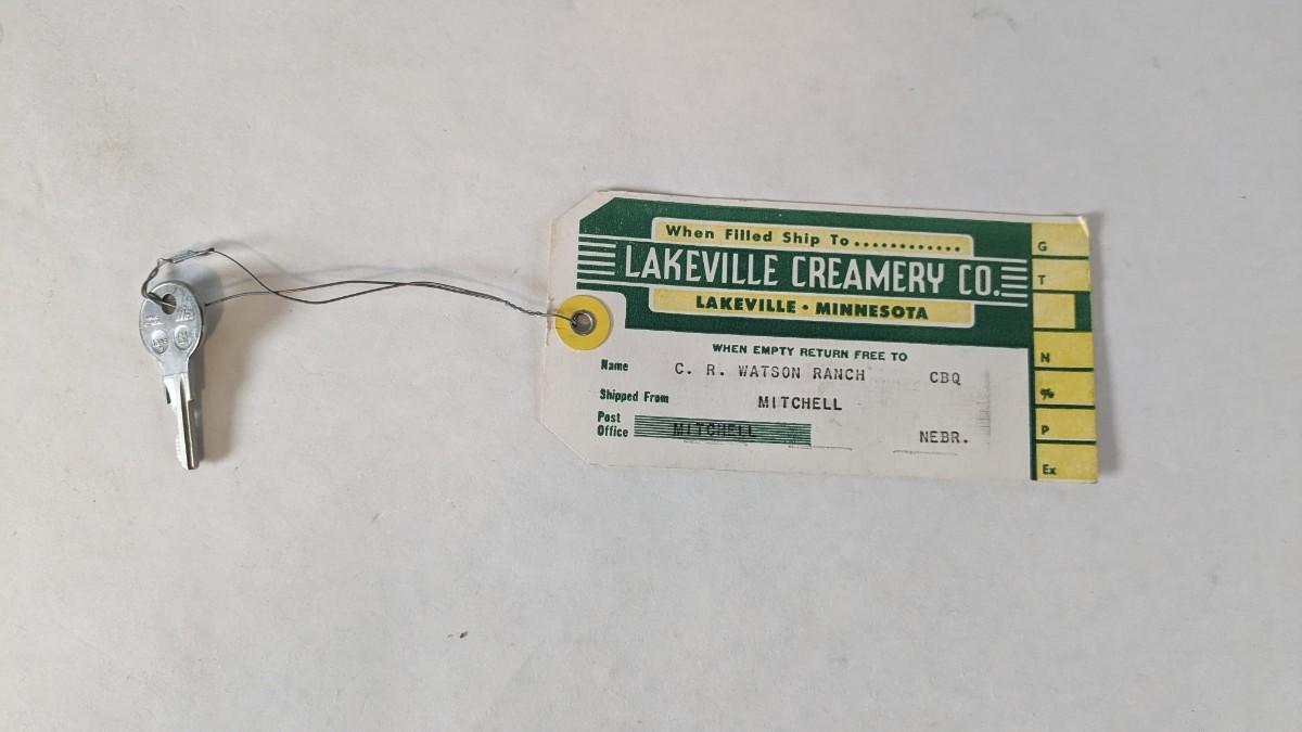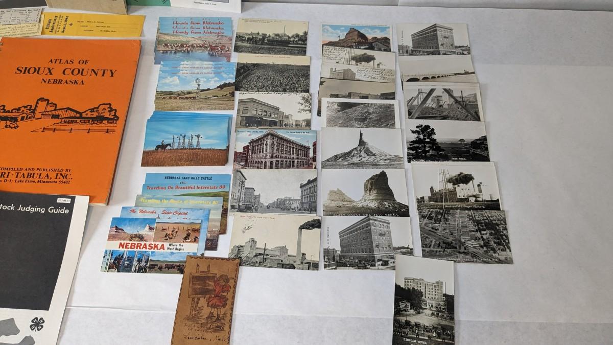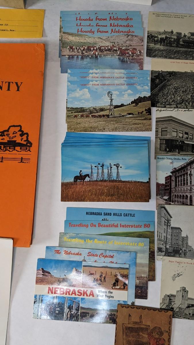 a beautiful mix of used and unused Nebraska specific postcards, some from the Watson ranch specifically, as well as some incredibly early pieces present including a tooled leather treasure. Lots of duplicates and tons of fun! Also includes some great older Nebraska ephemera, an incredbile Lakeview Creamery tag and key,
