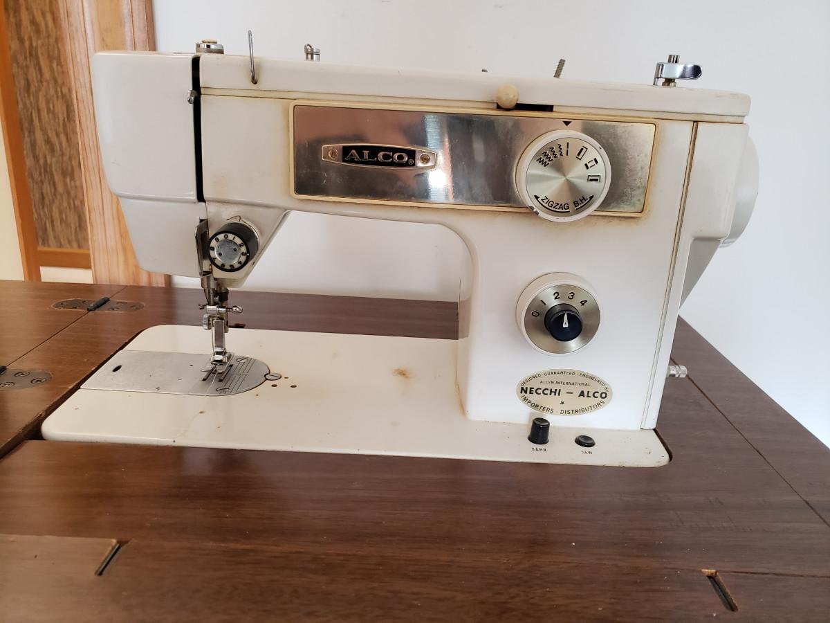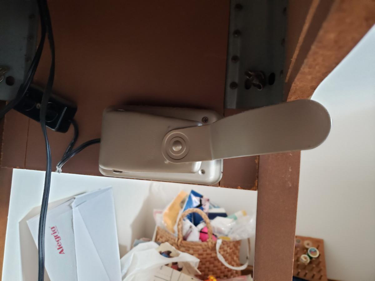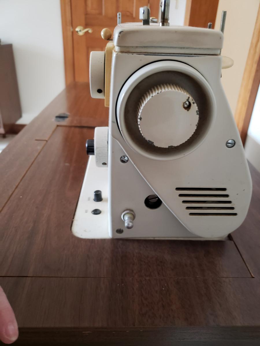 We think this is the model A1 sewing machine, but we need to confirm it. Power supply is mounted under the cabinet and has a knee lever s you can control the machine with your knee instead of a foot pedal on the floor. Sewing supplies included. There are other machine accessories in the boxes with the sewing materials.