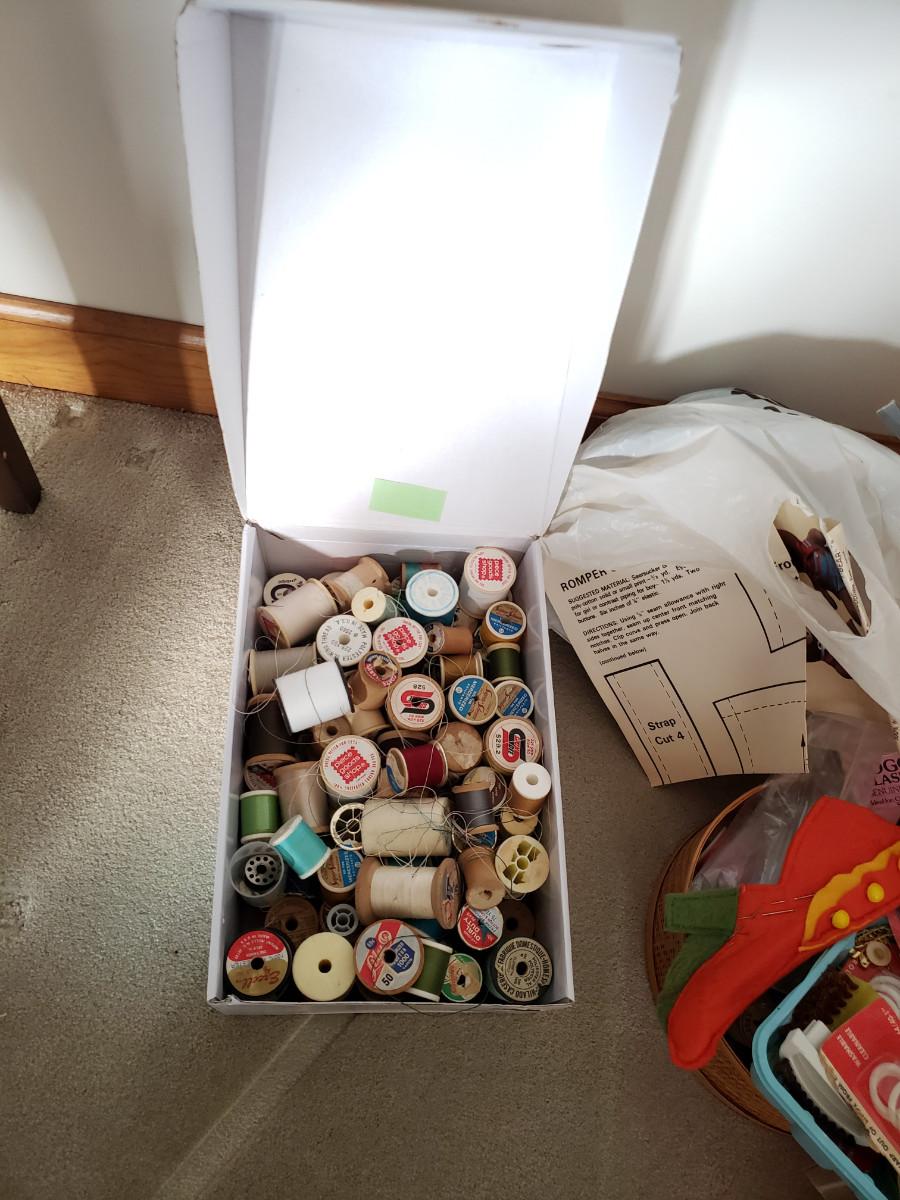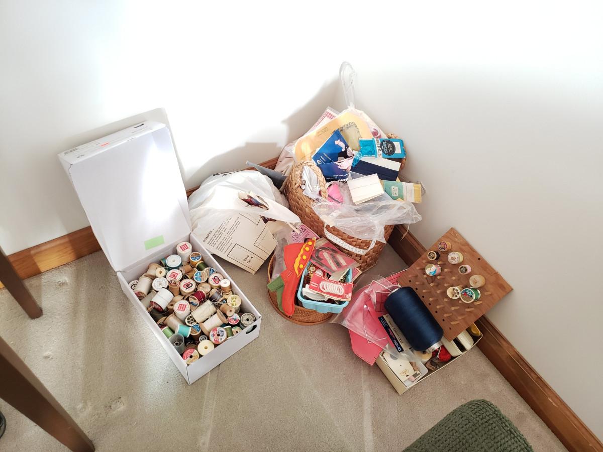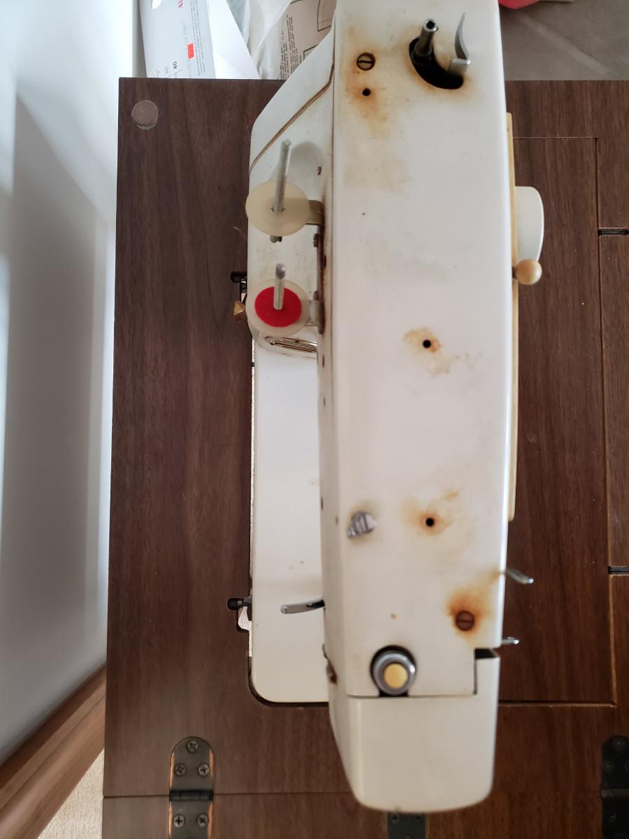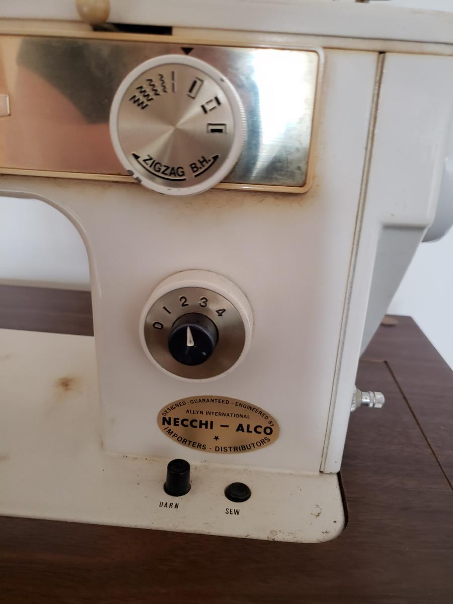 We think this is the model A1 sewing machine, but we need to confirm it. Power supply is mounted under the cabinet and has a knee lever s you can control the machine with your knee instead of a foot pedal on the floor. Sewing supplies included. There are other machine accessories in the boxes with the sewing materials.