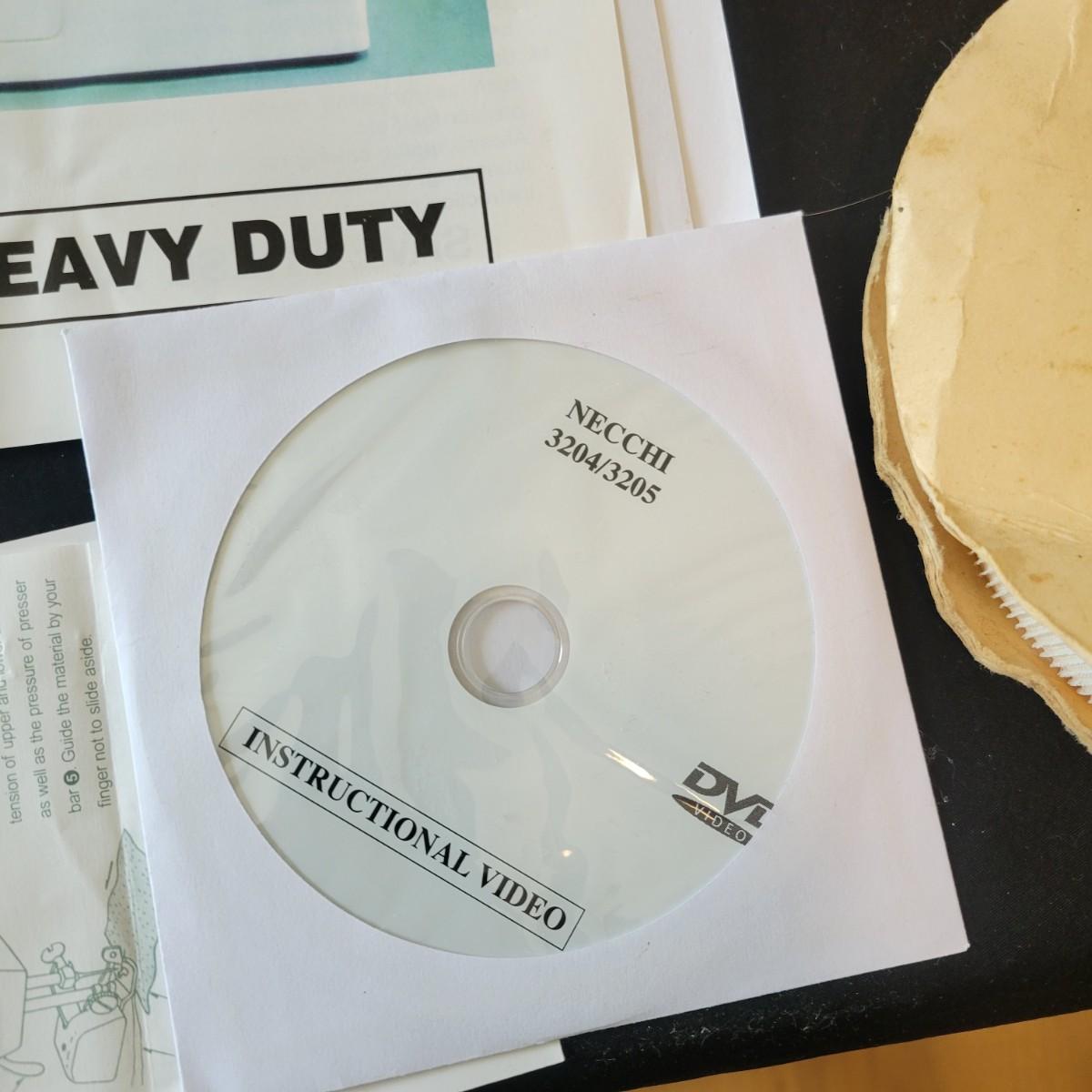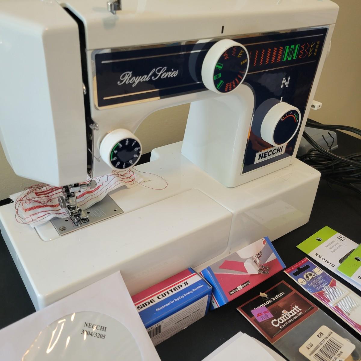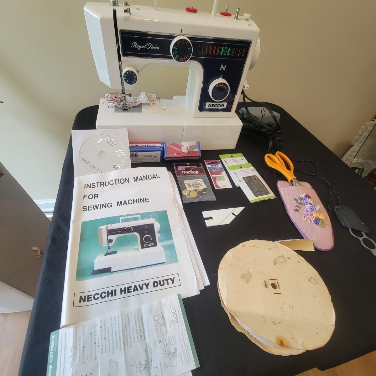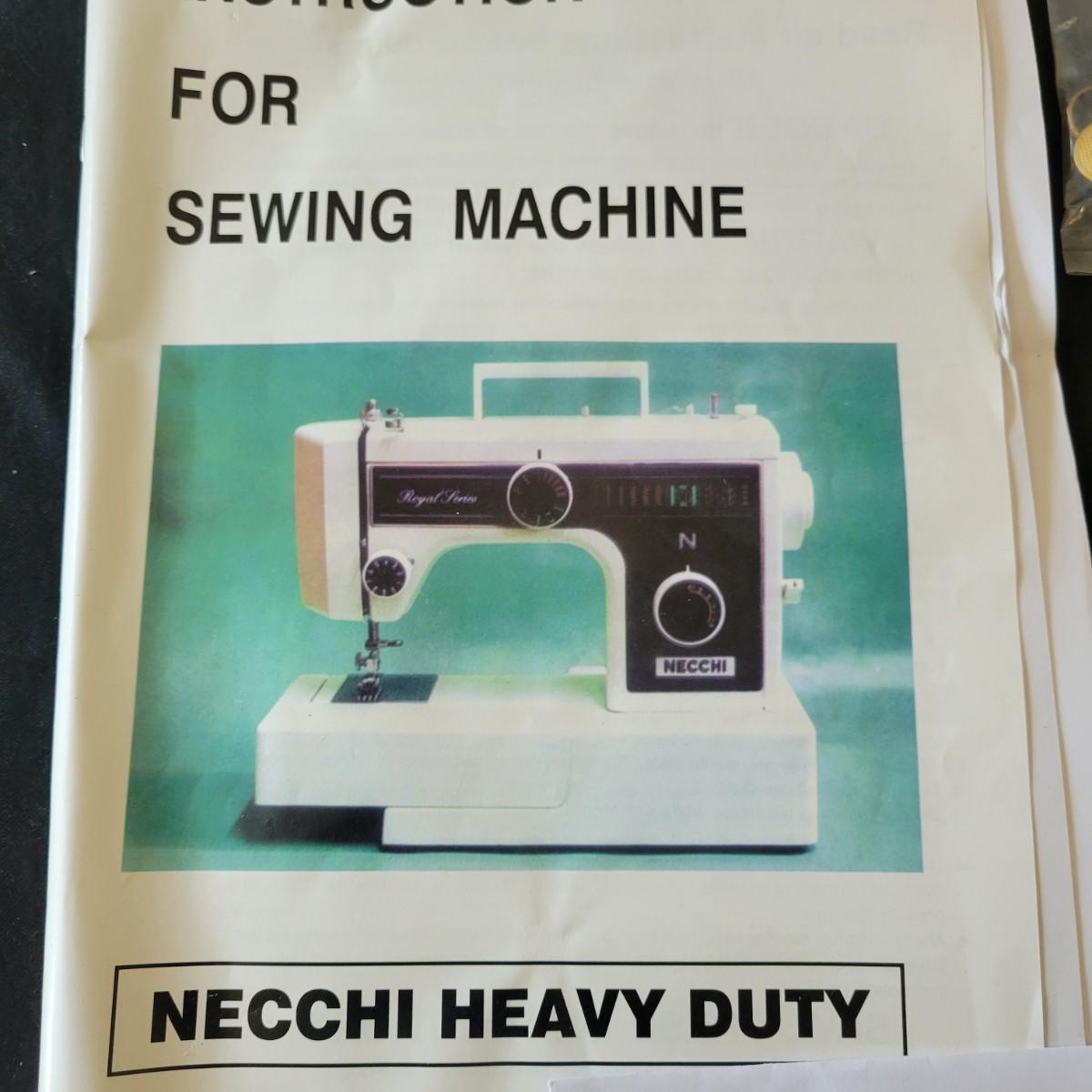 Necchi heavy duty sewing machine, model #3205GA, used but in original box with instruction manual and instructional DVD. Sewing machine was plugged in and works. Includes 2 side cutter II attachments, Carhartt buttons, needles, and scissors. Shipping Available.