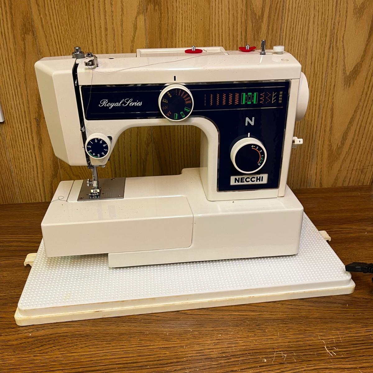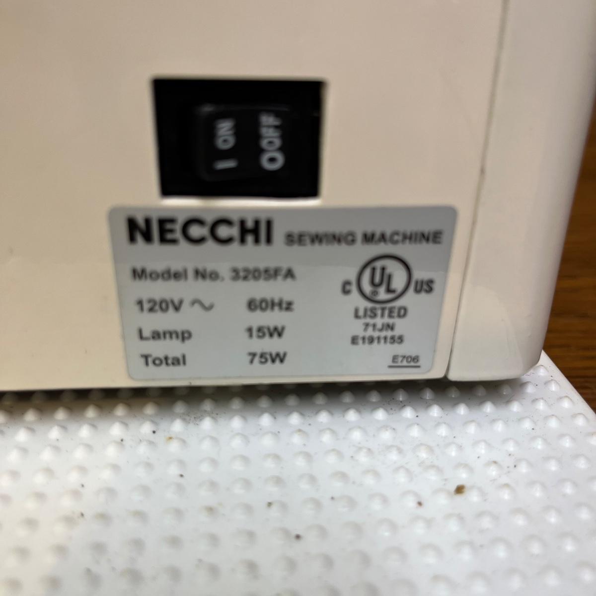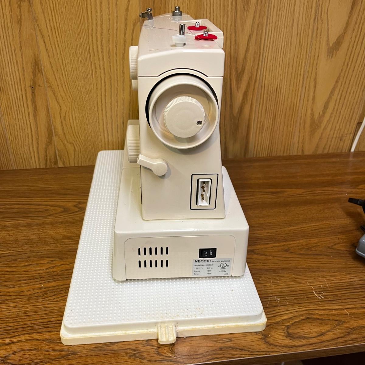 Lot includes a Necchi sewing machine model # 3205FA with carrying case. Machine powered on when tested.