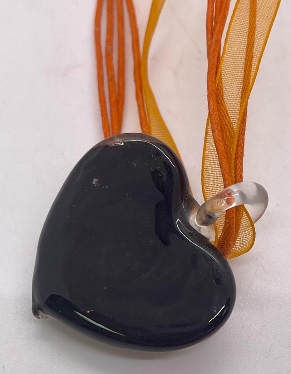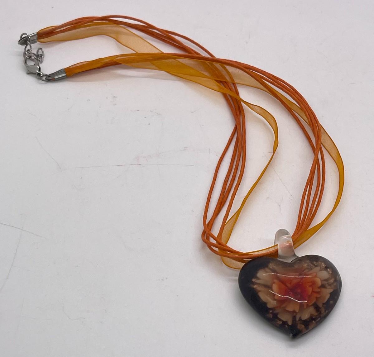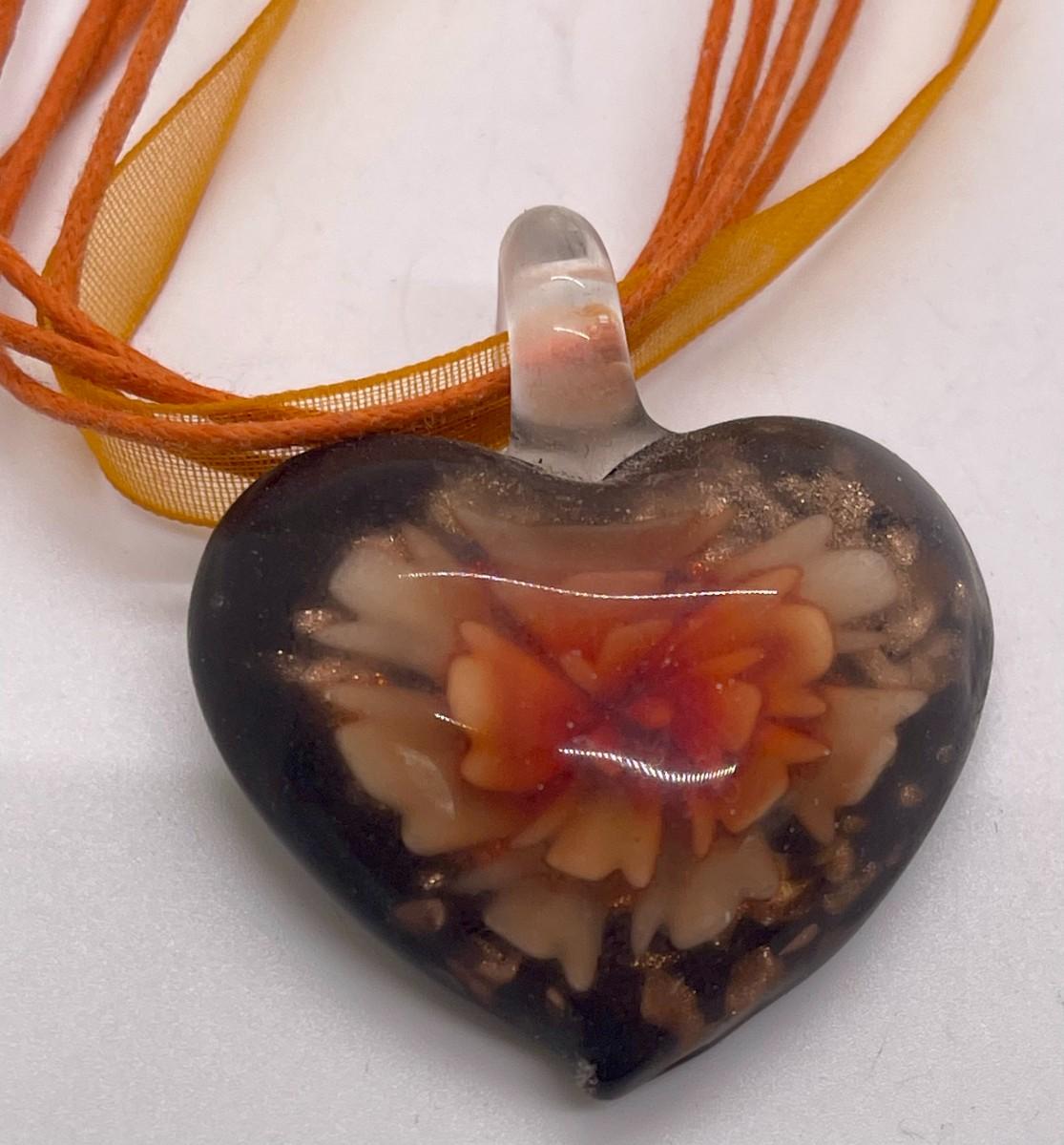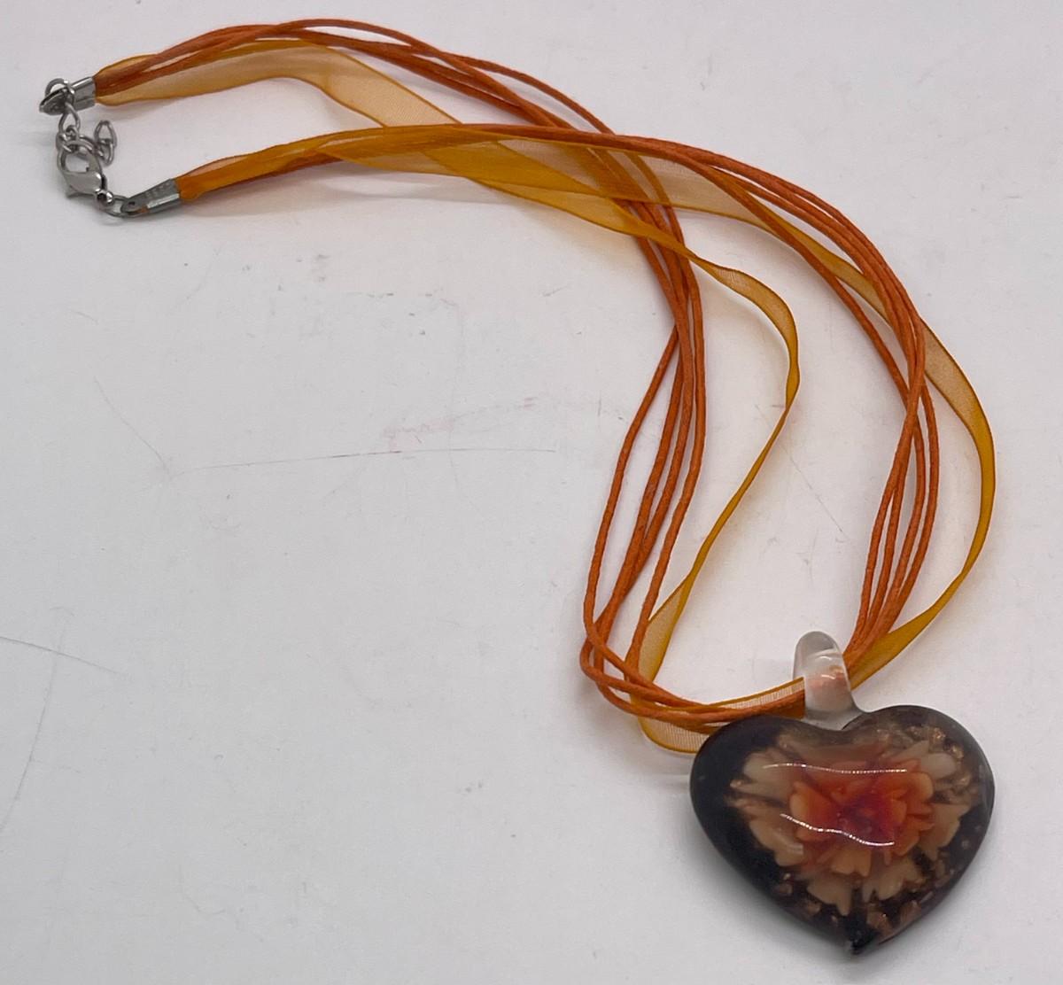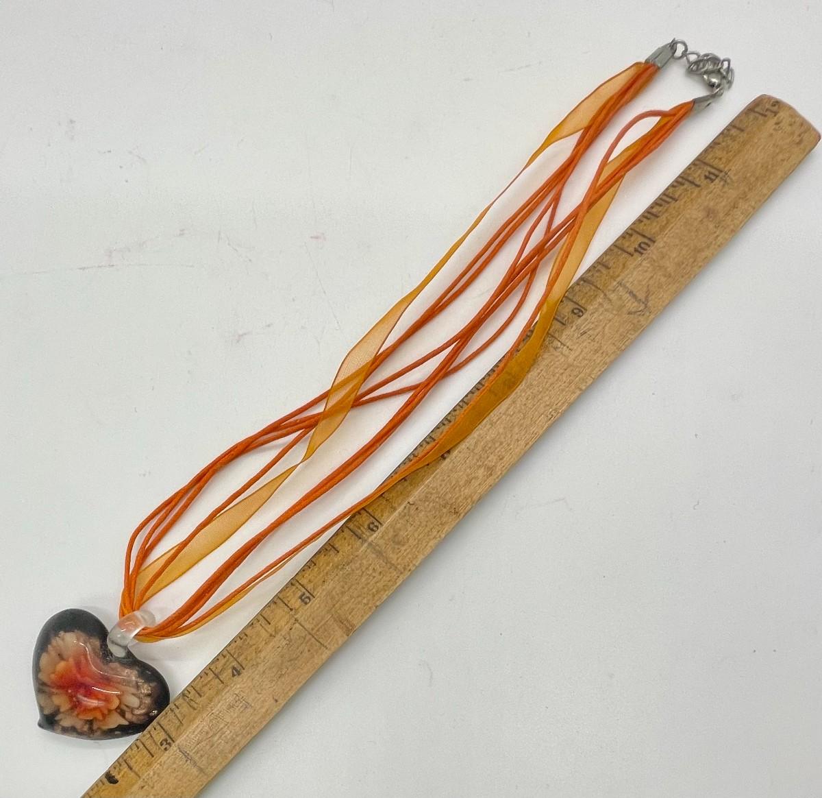Orange Ribbon Necklace Glass Heart Pendant with flowers
