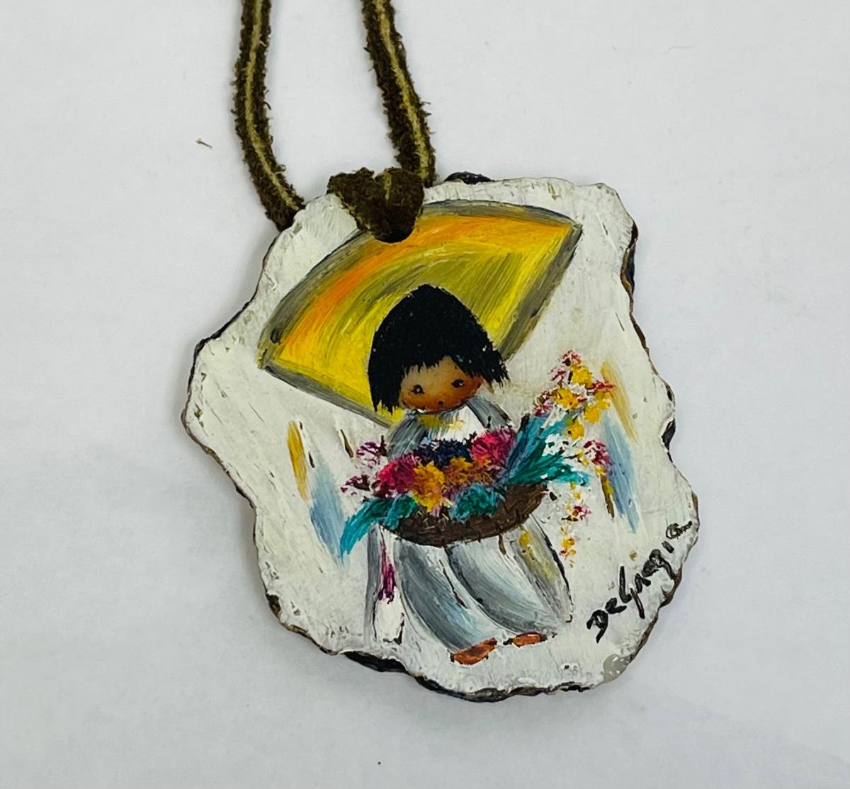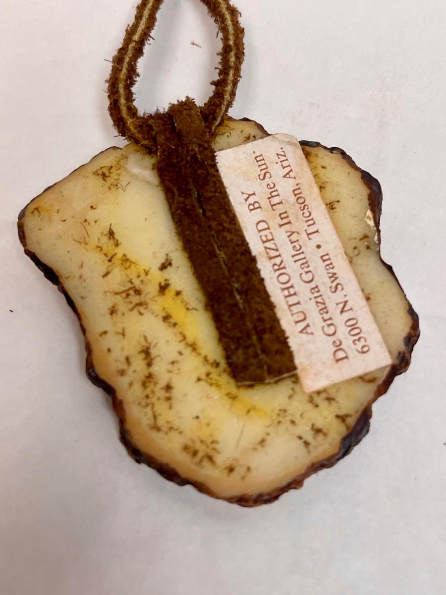 Leather cord necklace with hand-painted stone pendant. Sticker on back indicates it's from Tucson, AZ. In good condition.