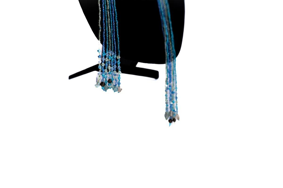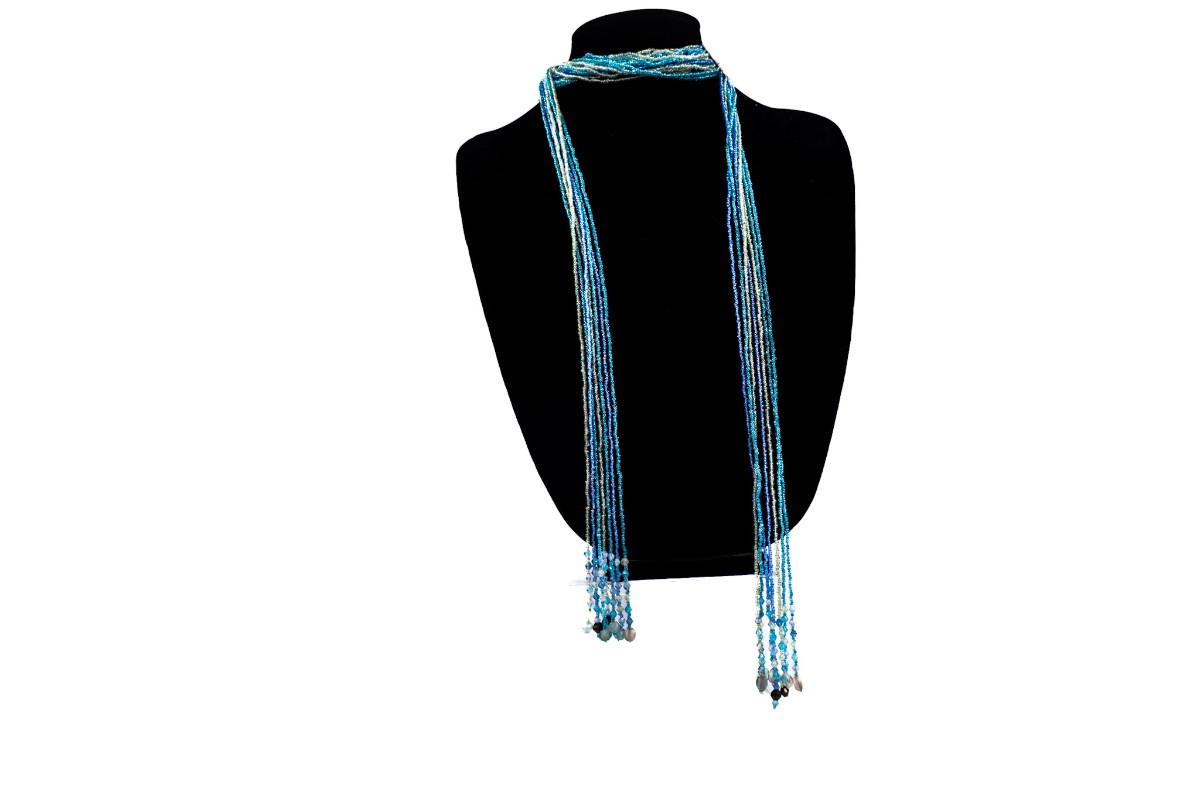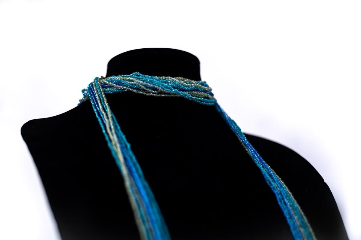 This is a multistrand seed bead necklace in shades of blue, green, and white.