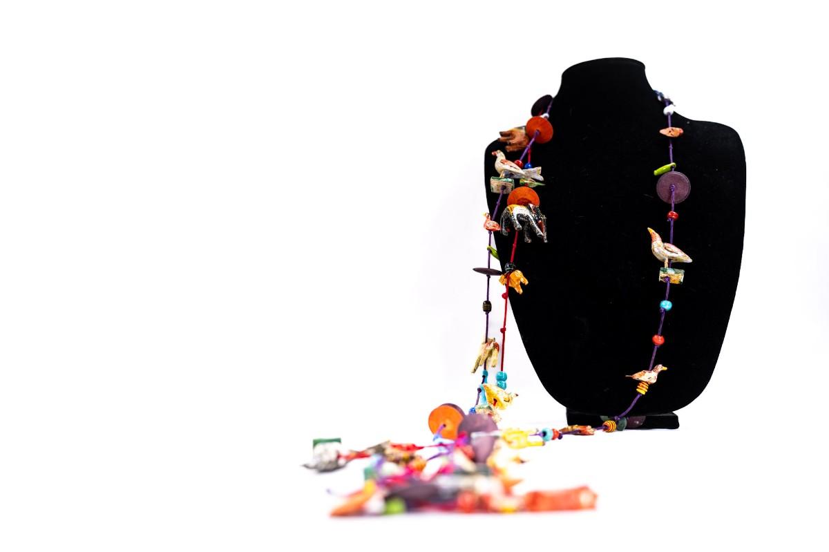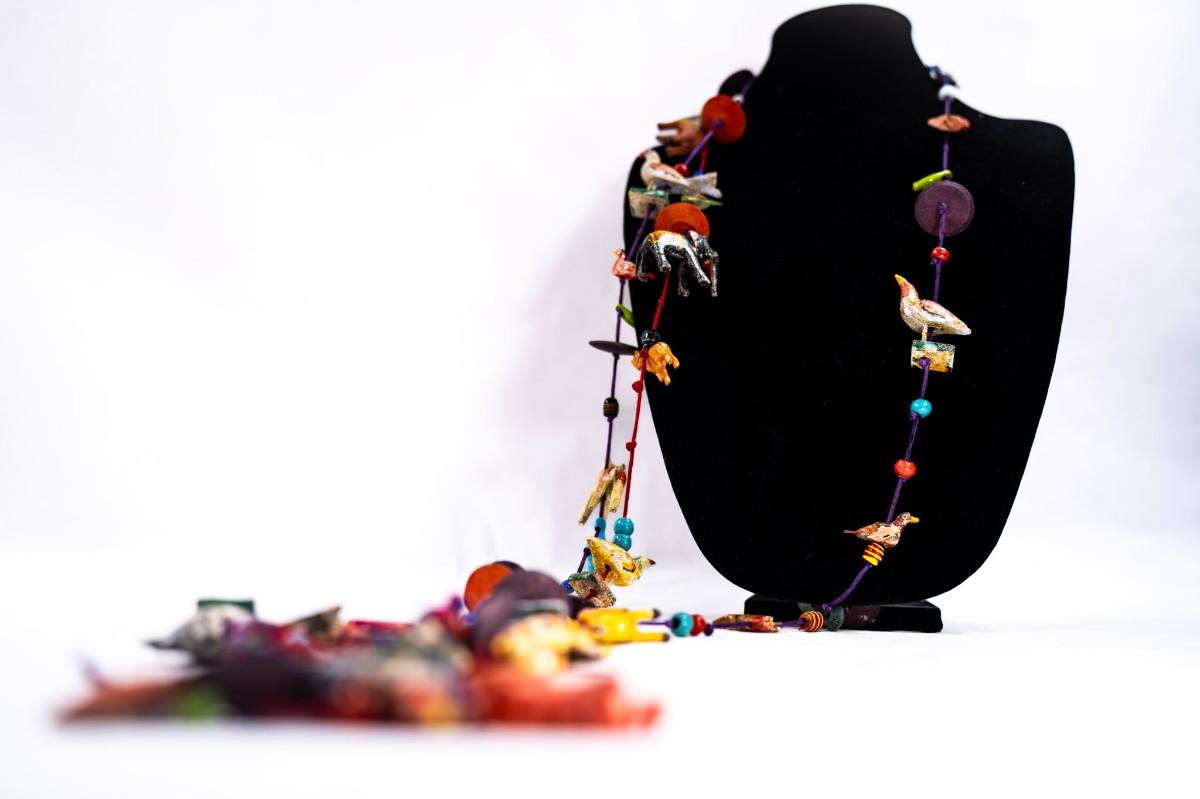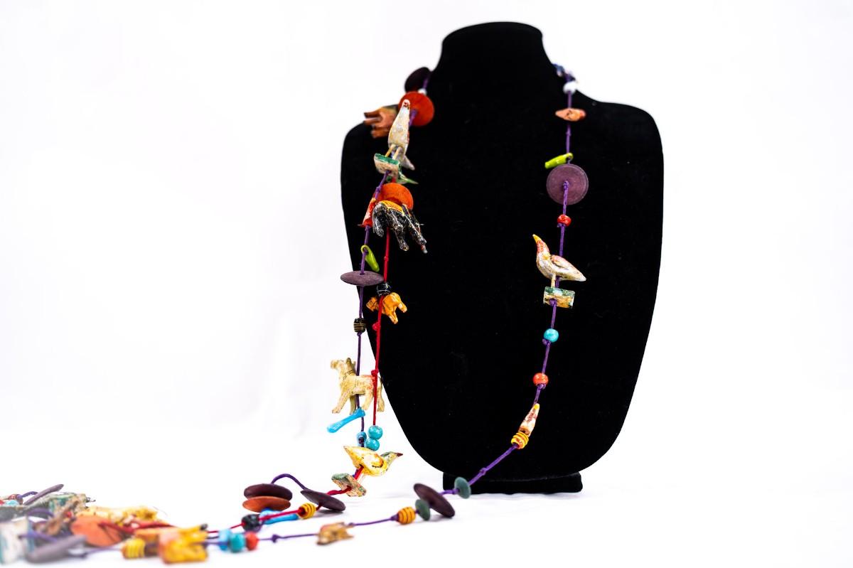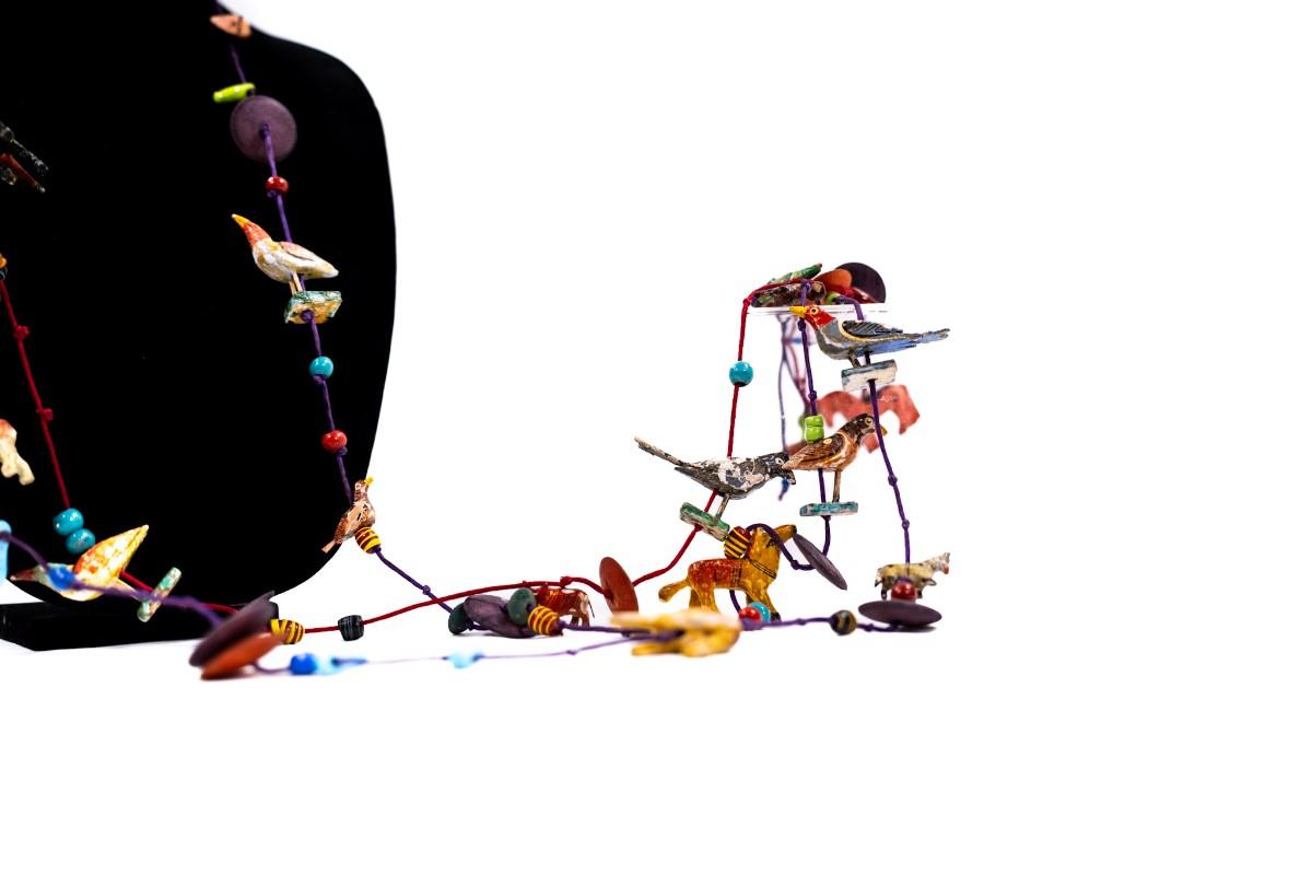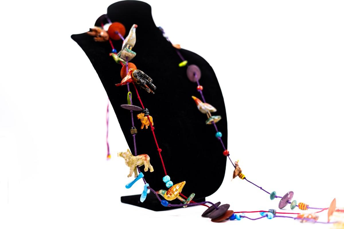 This is a unique, handmade folk art necklace featuring carved and painted animals and disk beads. 1 animal has damage.