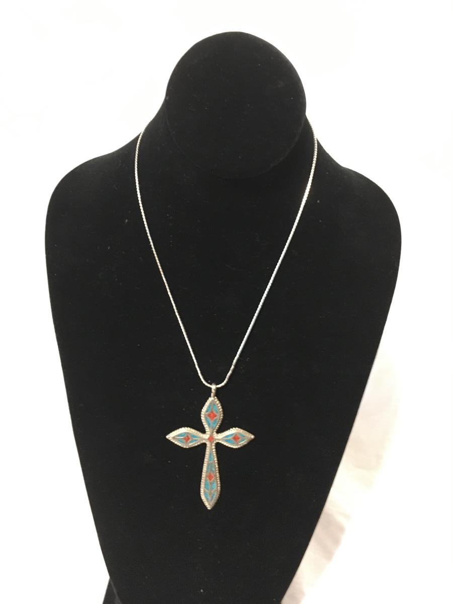 Nice necklace with cross pendant with turquoise chips please see attached photos