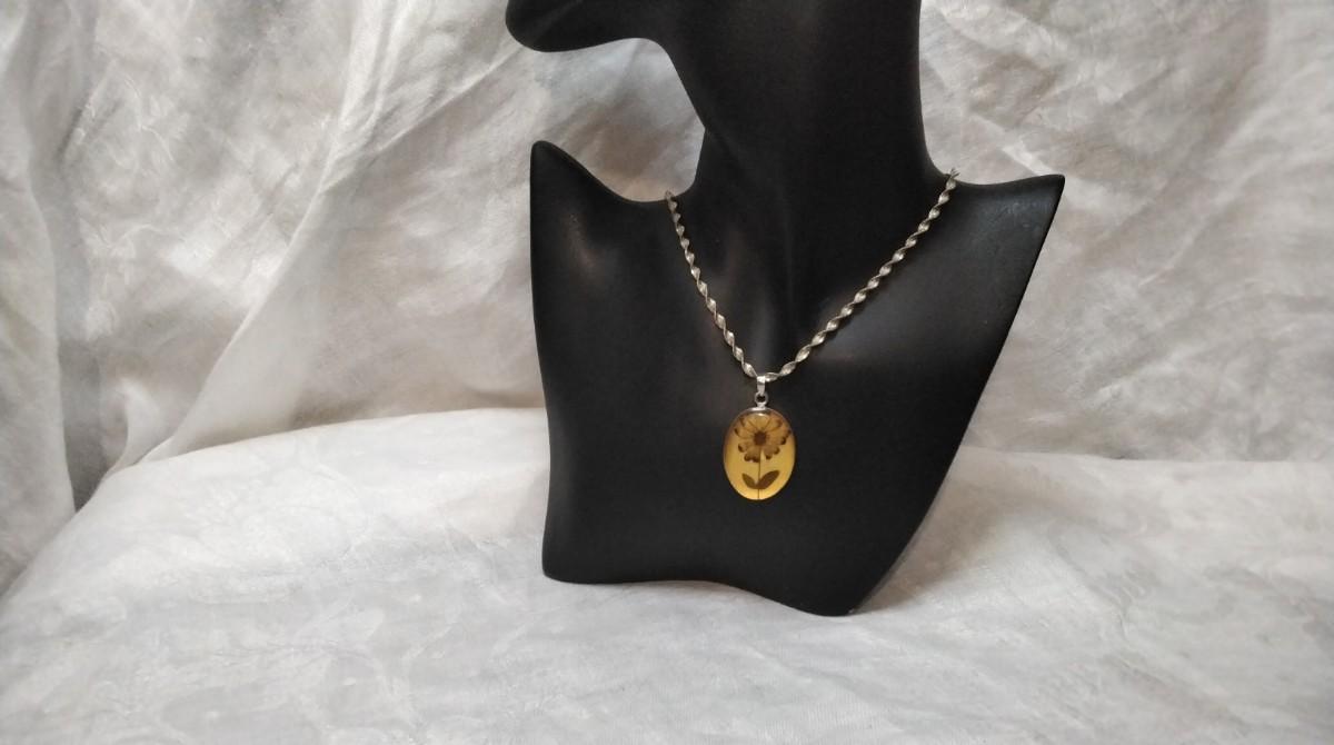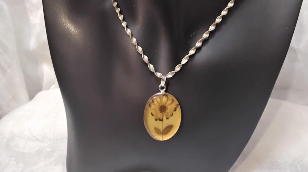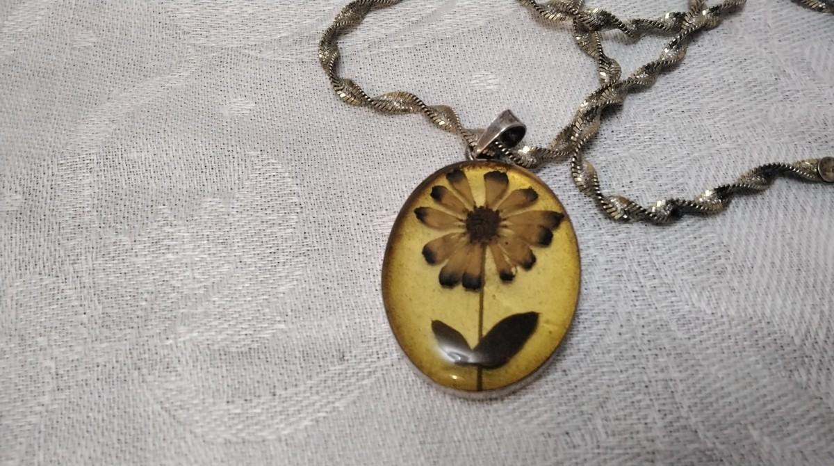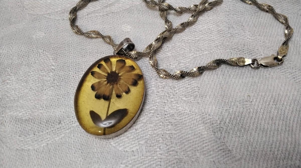Beautiful vintage necklace. Pendant has a thick acrylic cover over the flower with Mexico 925 Backing.