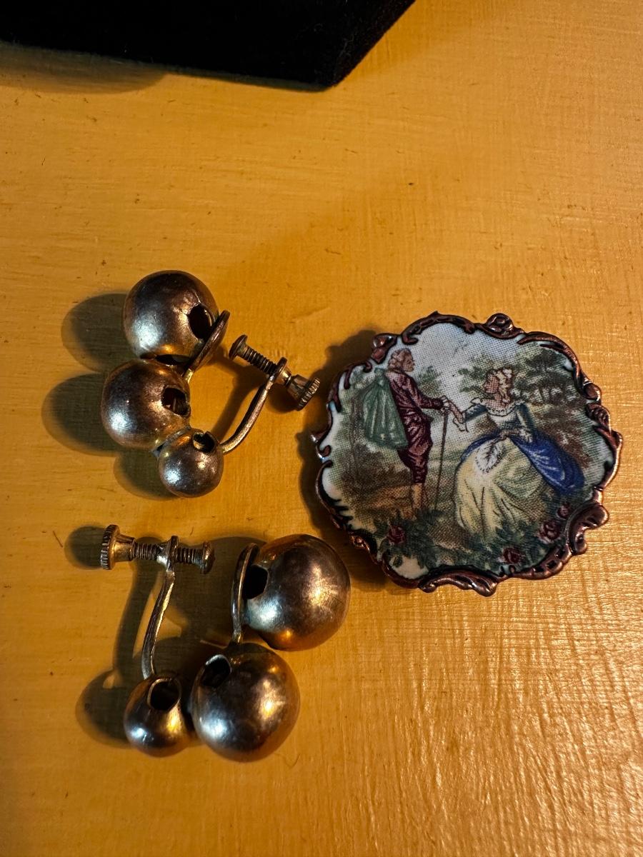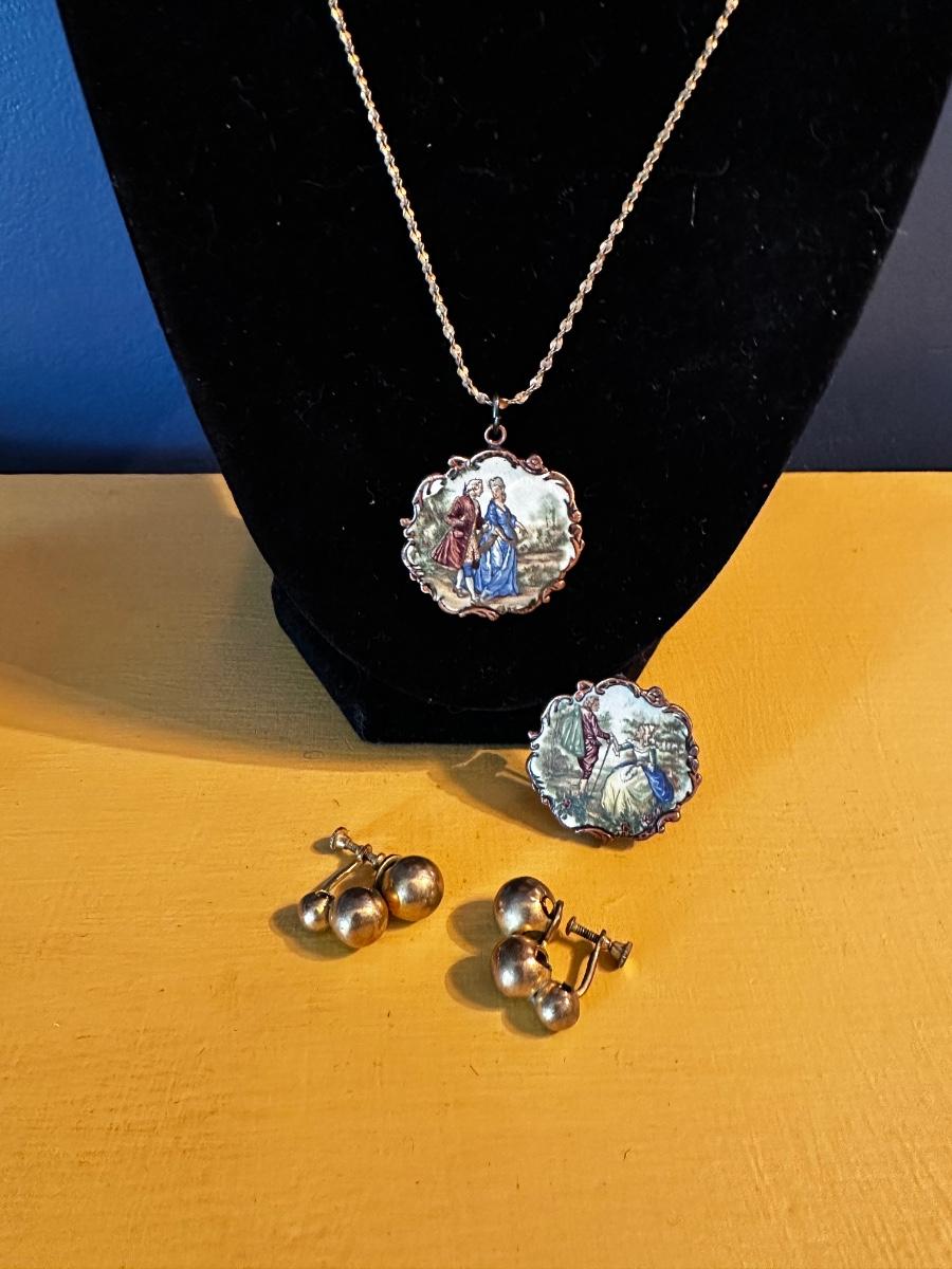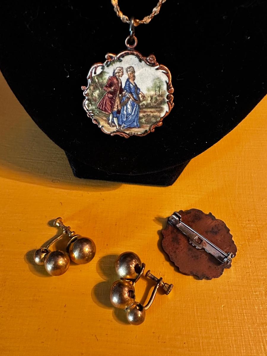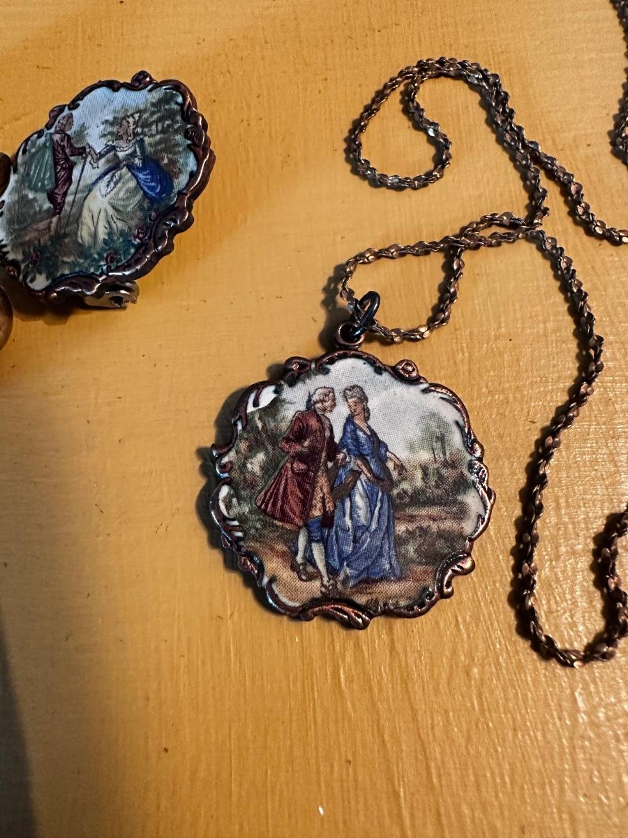 Wonderful unique Necklace and brooch set with two different scenes. Each with a man and a woman.