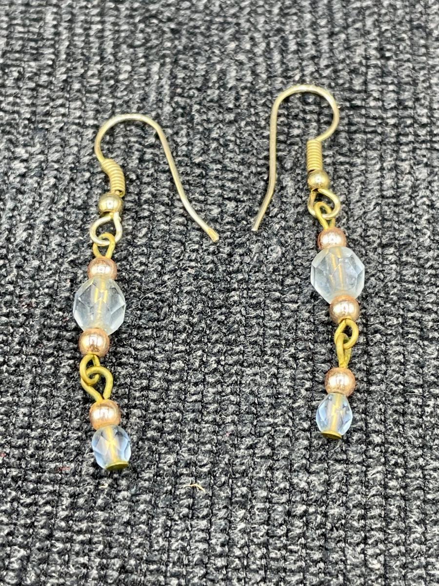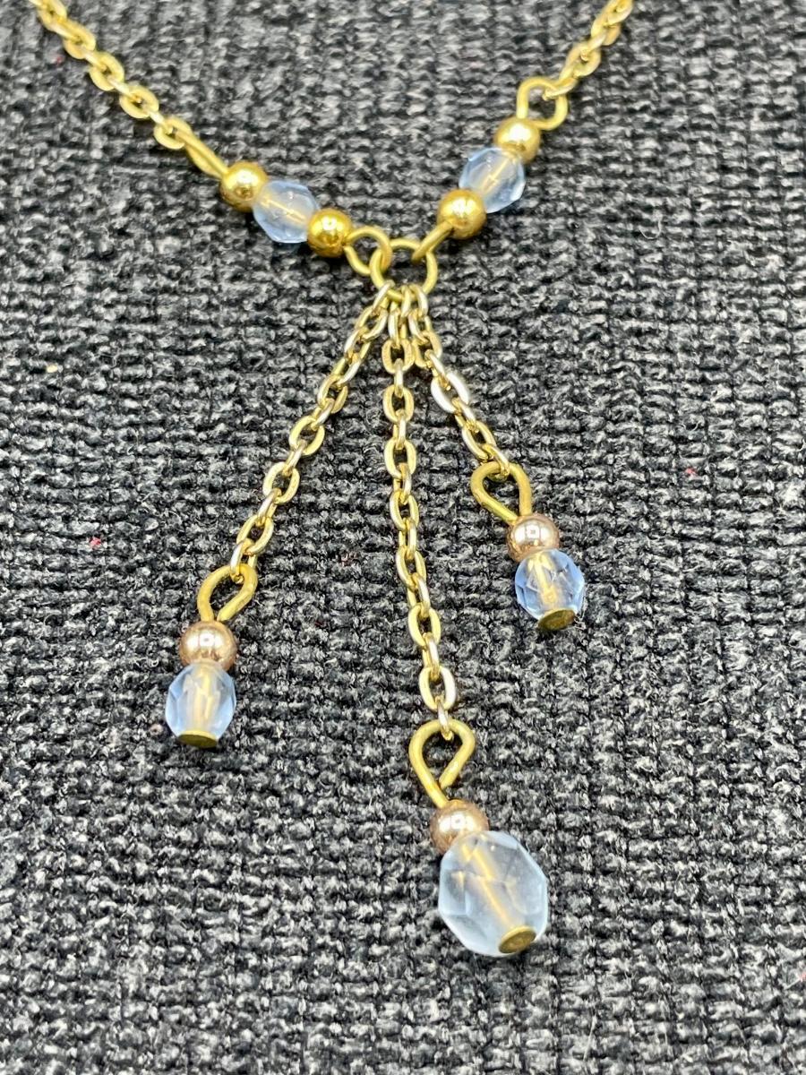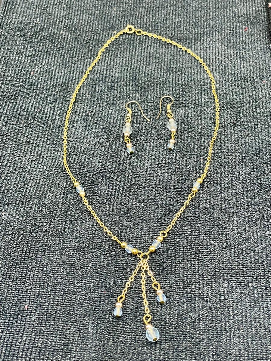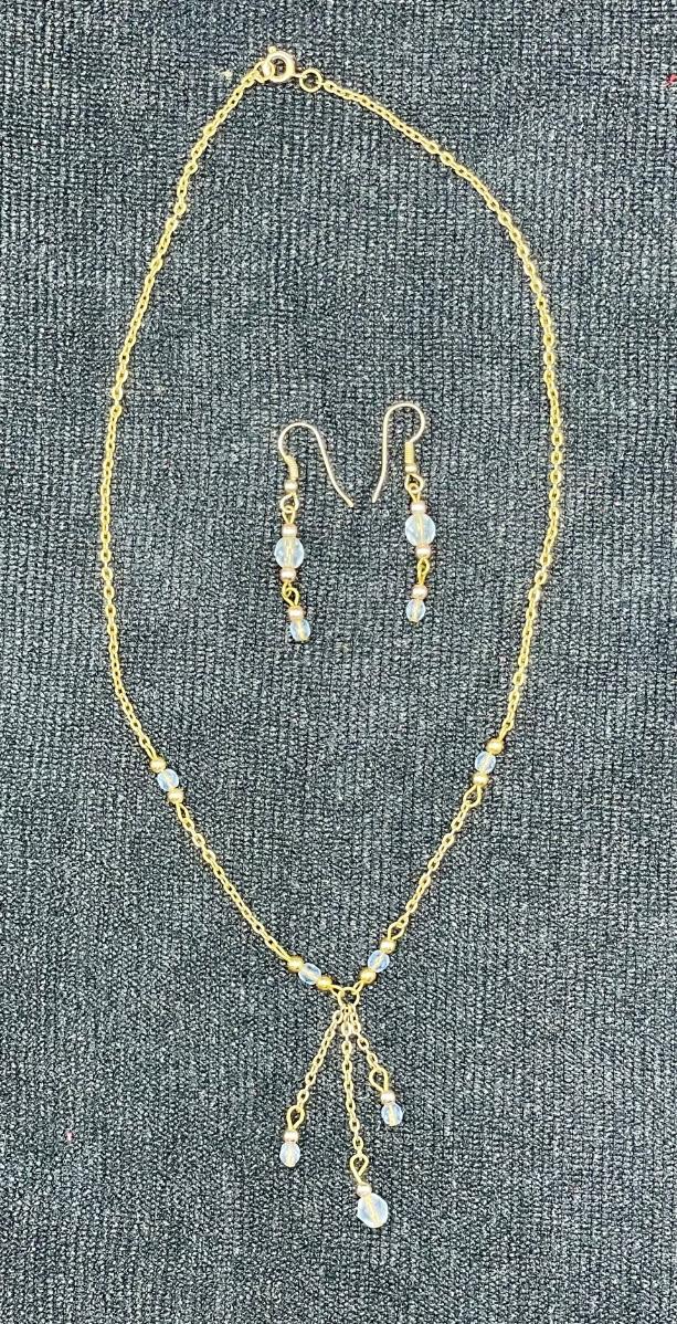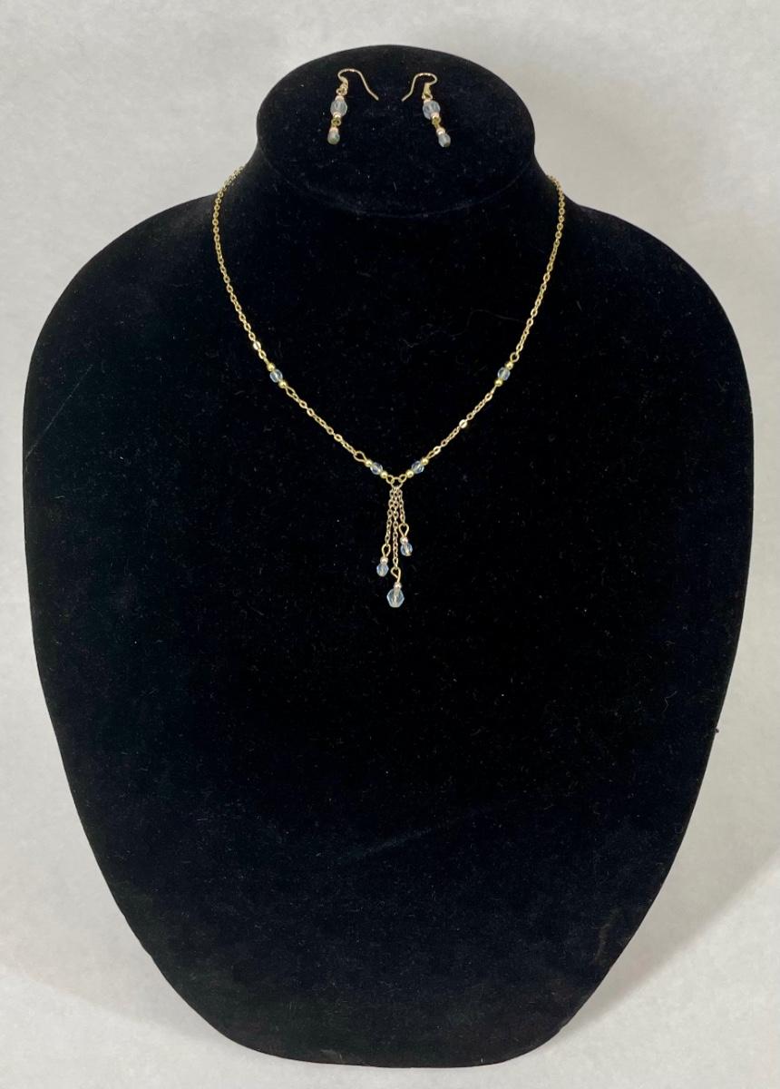 Gold-tone necklace chain and 3 dangling blue stones. Matching earrings for pierced ears.