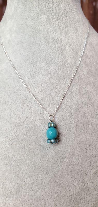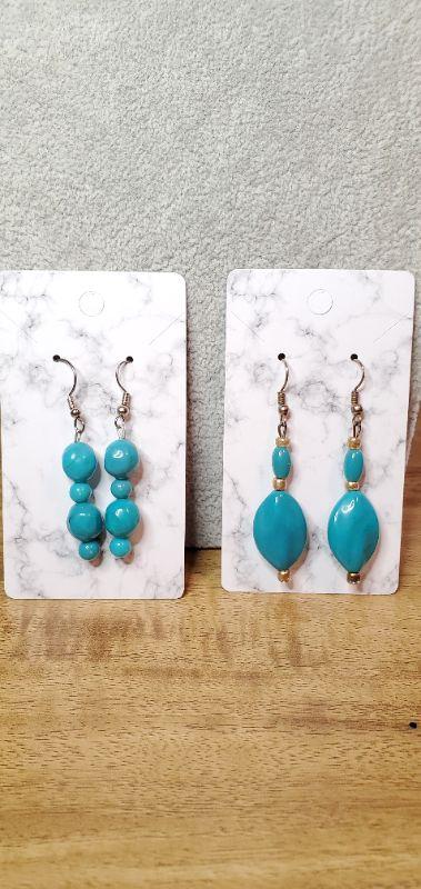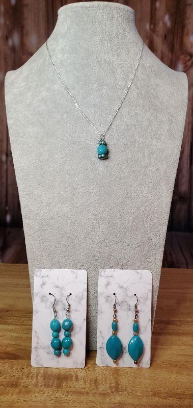 Hand crafted necklace with two sets of earrings. Necklace features a standard clasp closure. The earrings feature a standard fishhook fitting.