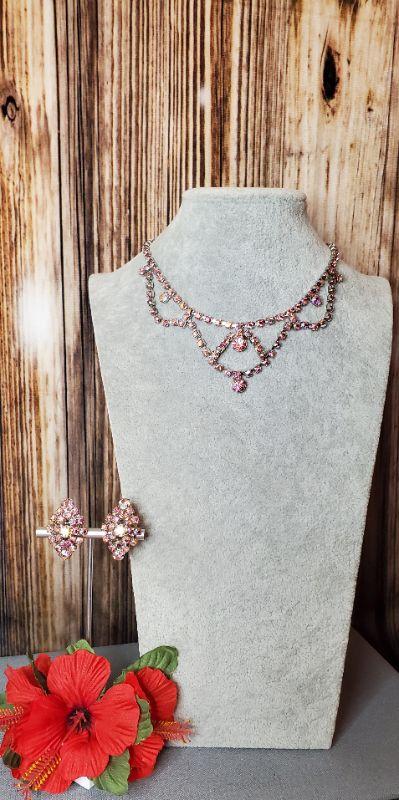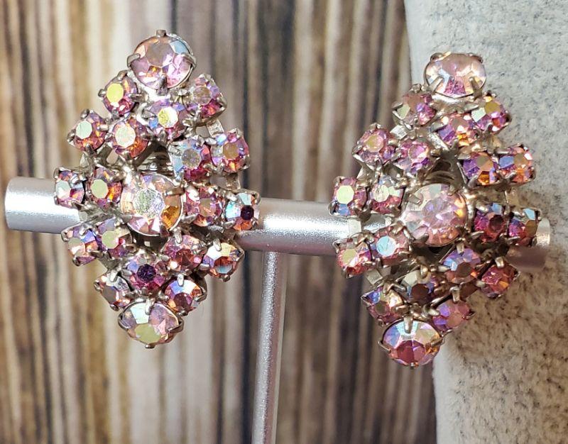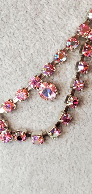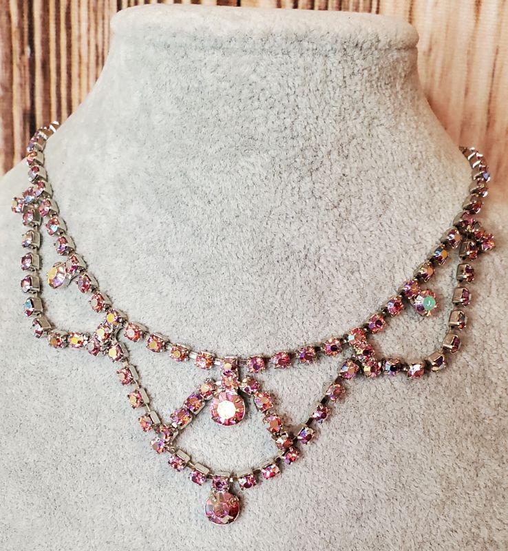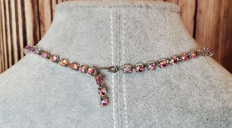 1950s vintage princess necklace. Silver tone metal setting, with prong-set Aurora Borealis rhinestones. Unsigned, but it's very nice quality.