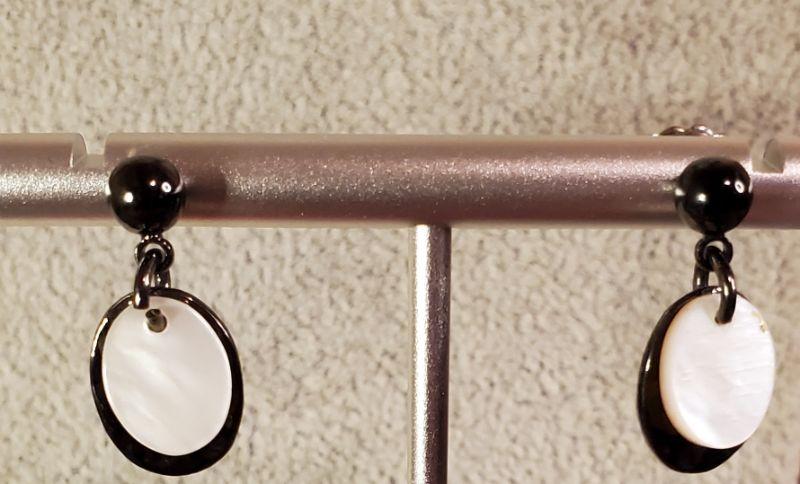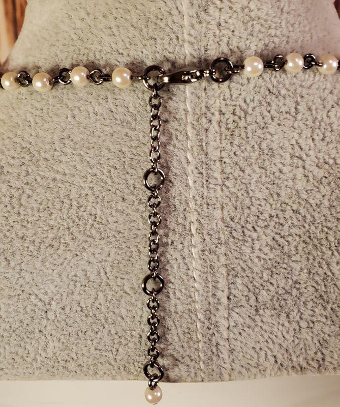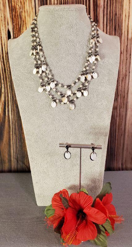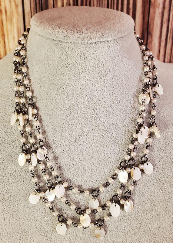 19.5” Multi-strand black chain Necklace with simulated pearl beads and simulated mother of pearl discs.
