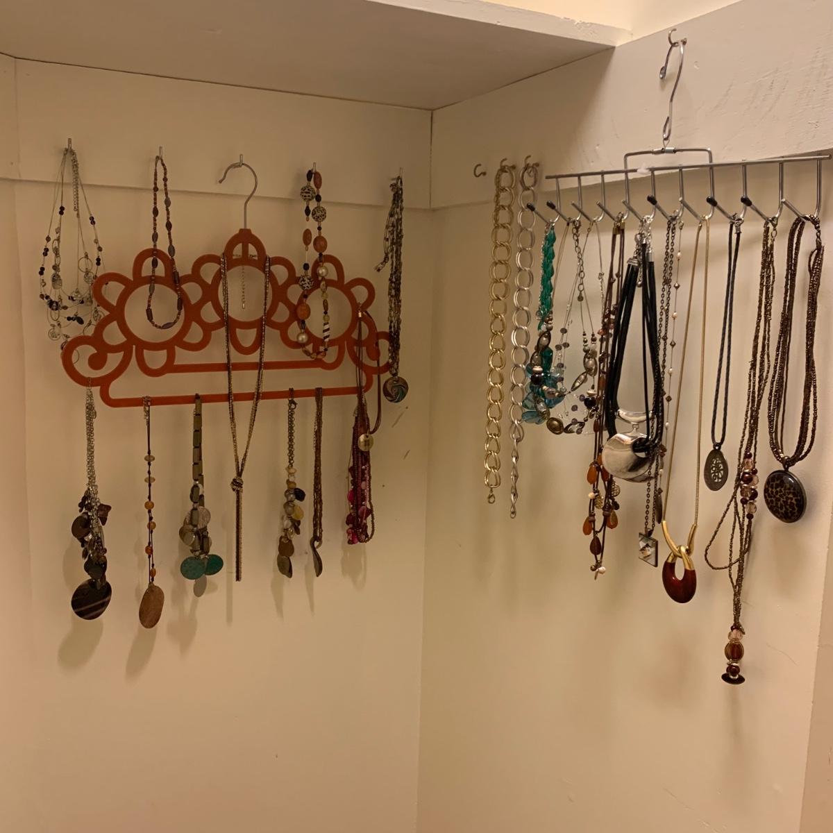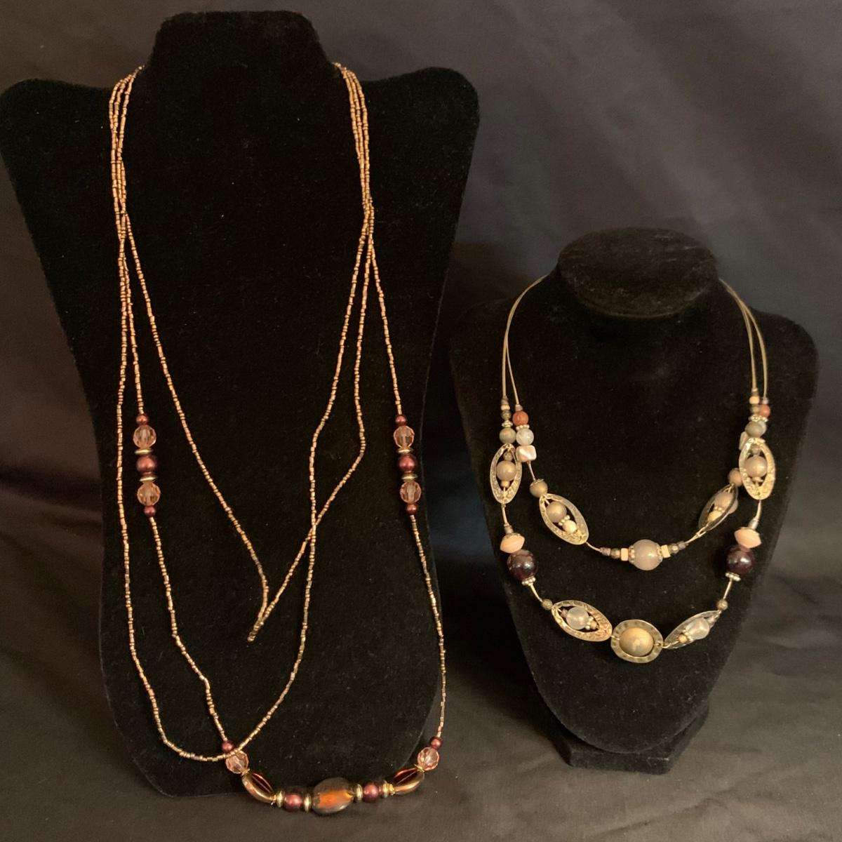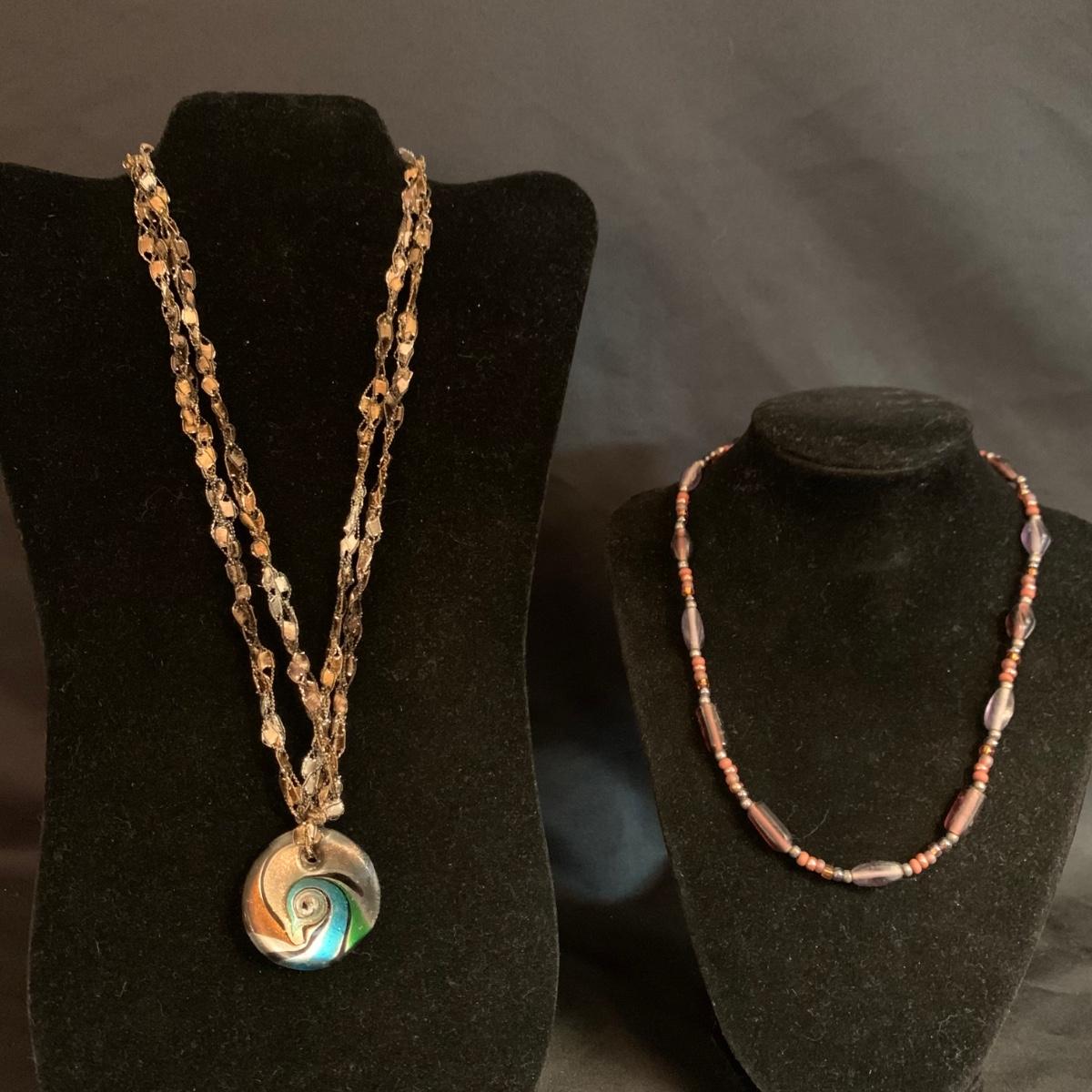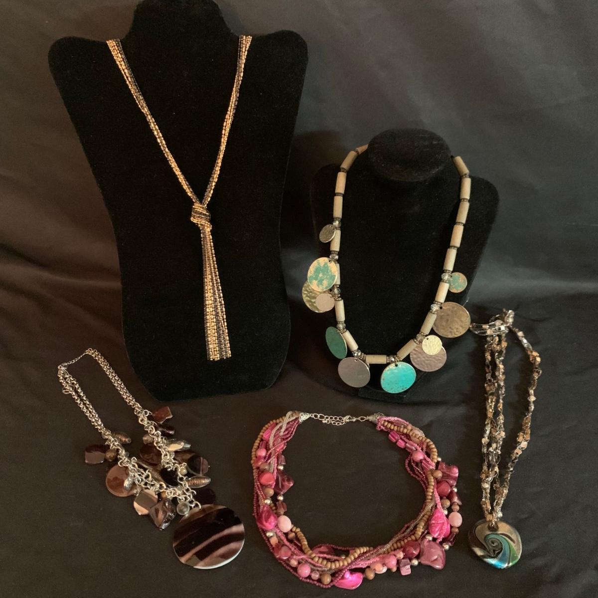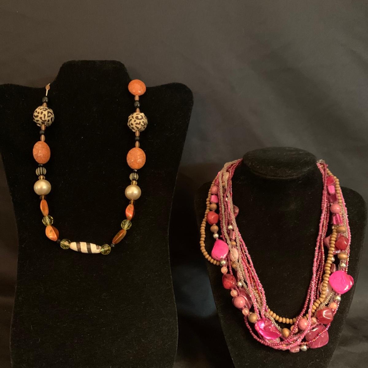 27 necklaces in a variety of styles. Many are beaded. One pendant is marked 925. Some have cords while some have metal chains. The necklaces come in a variety of lengths. Two hangers are included as well.