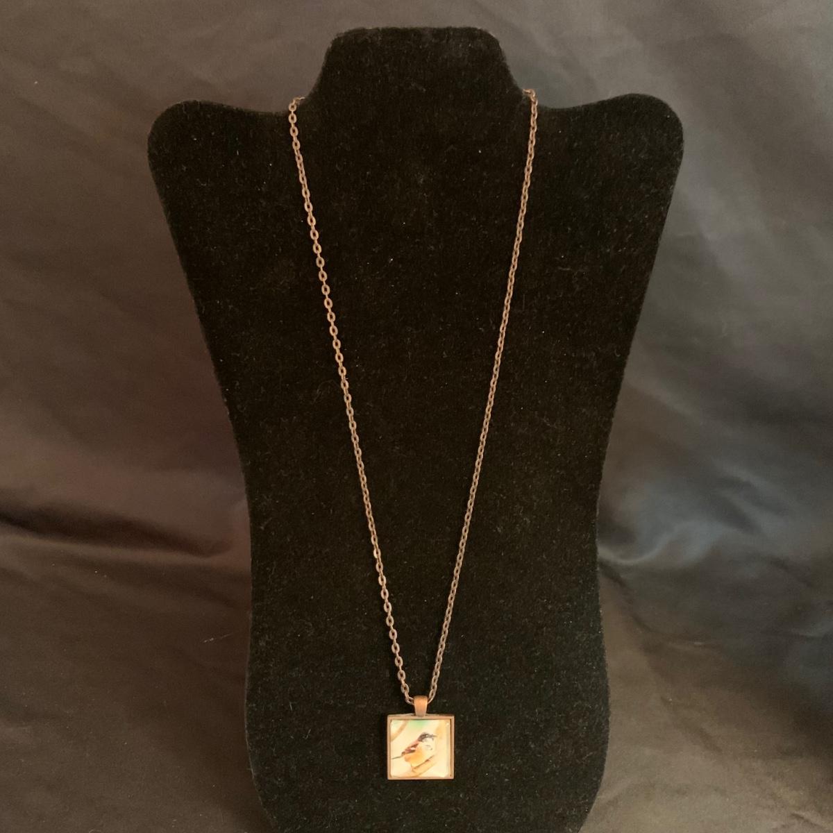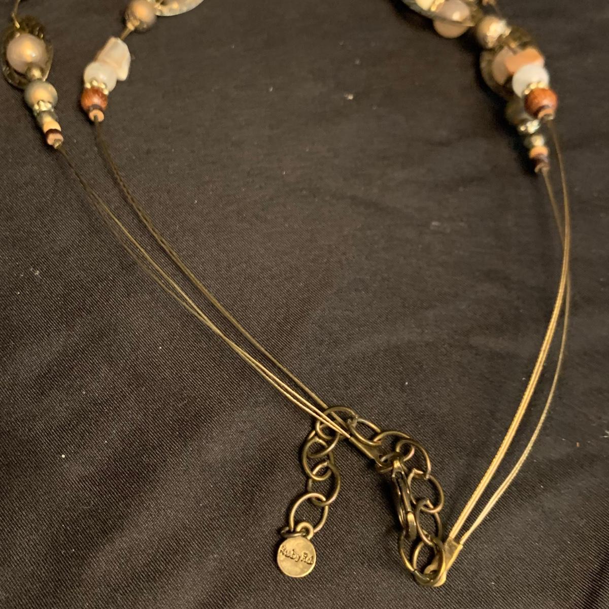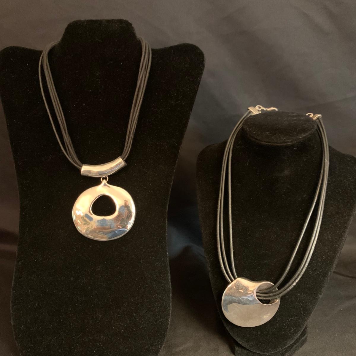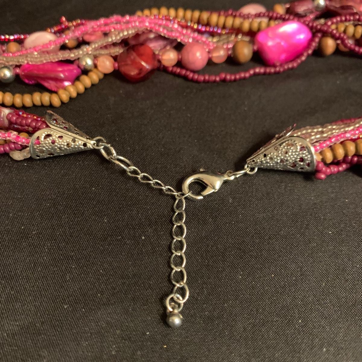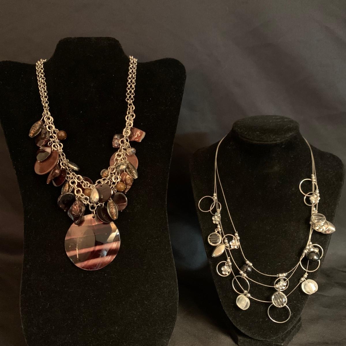 27 necklaces in a variety of styles. Many are beaded. One pendant is marked 925. Some have cords while some have metal chains. The necklaces come in a variety of lengths. Two hangers are included as well.