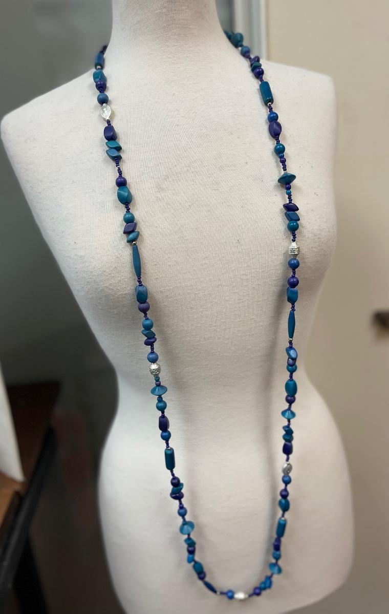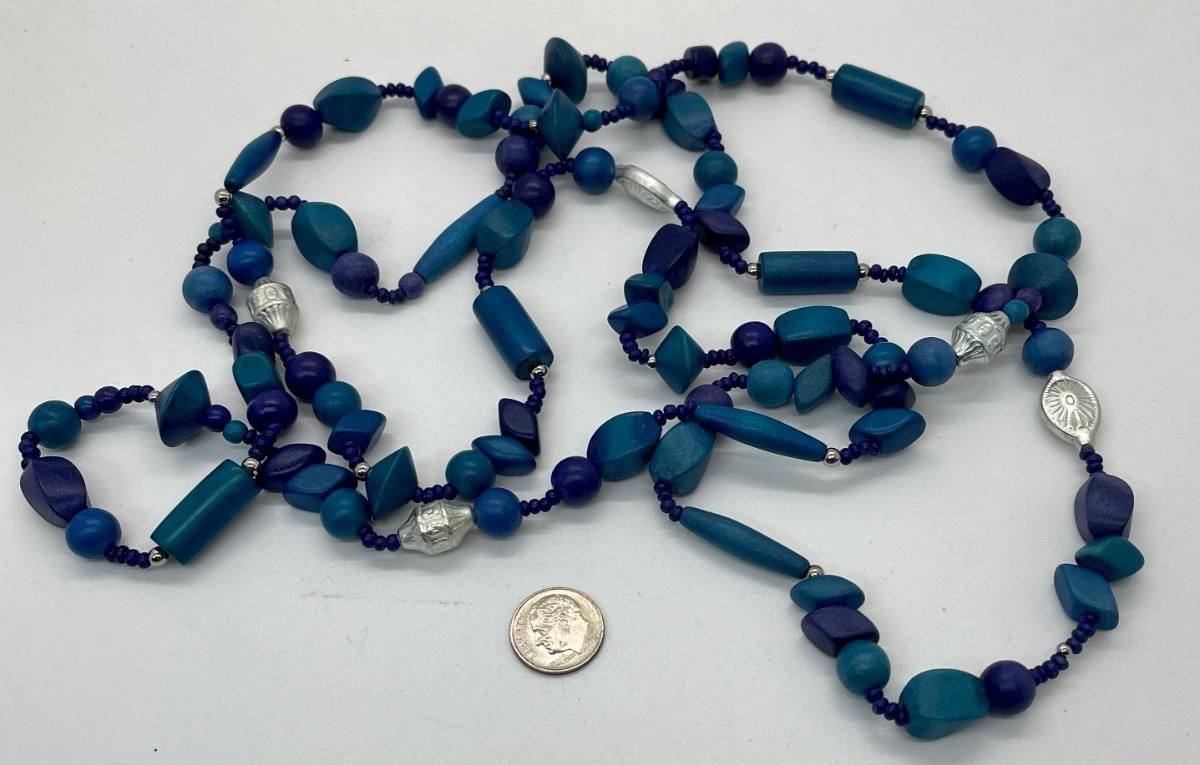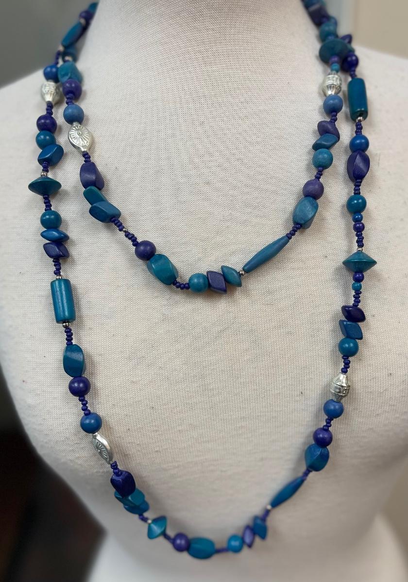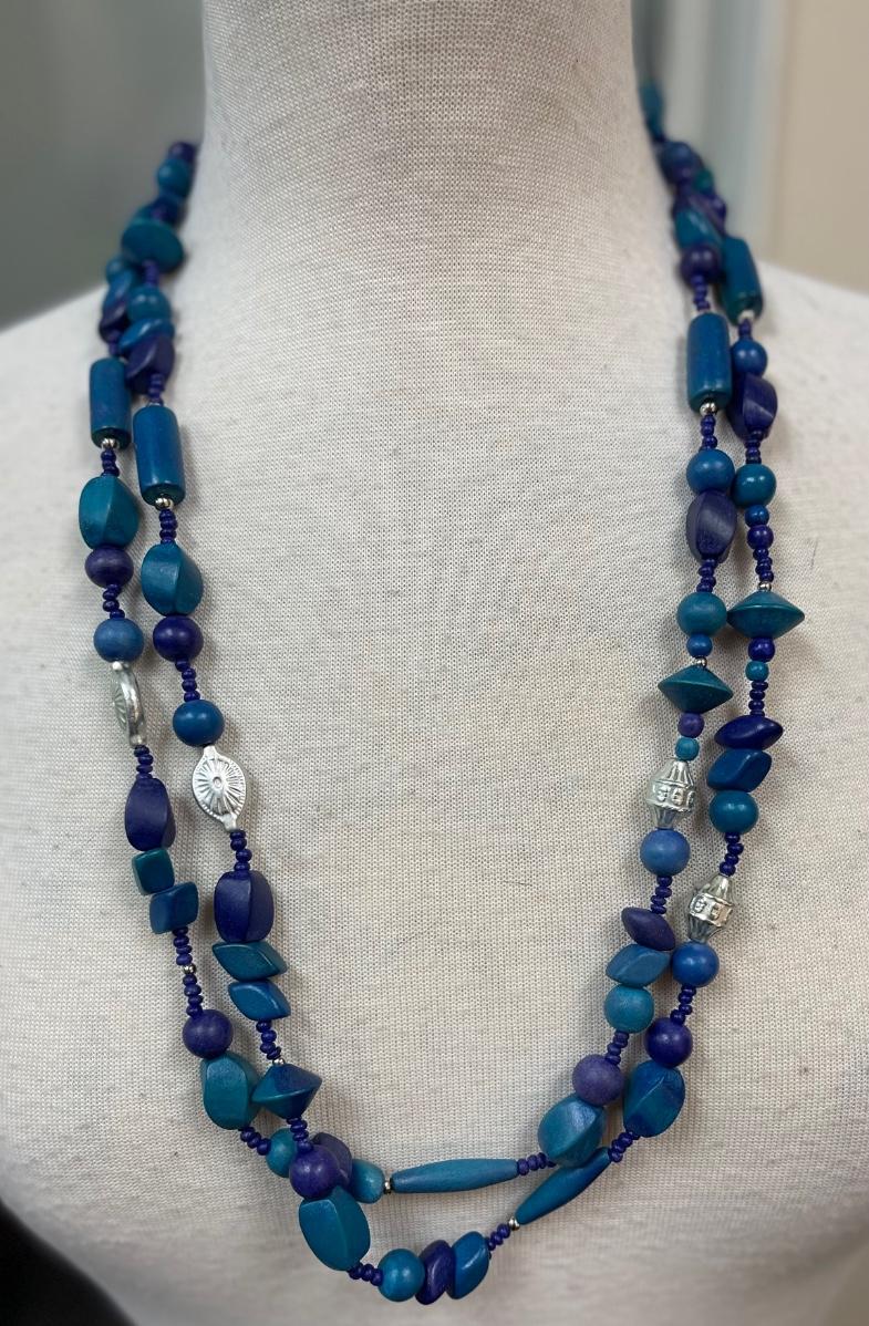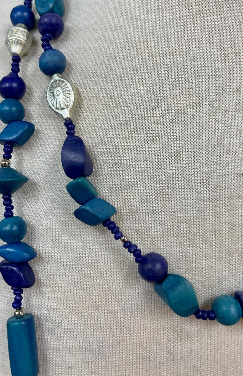 Mixed Variety of Blue Wooden Beads Long Necklace