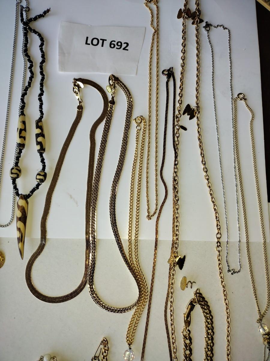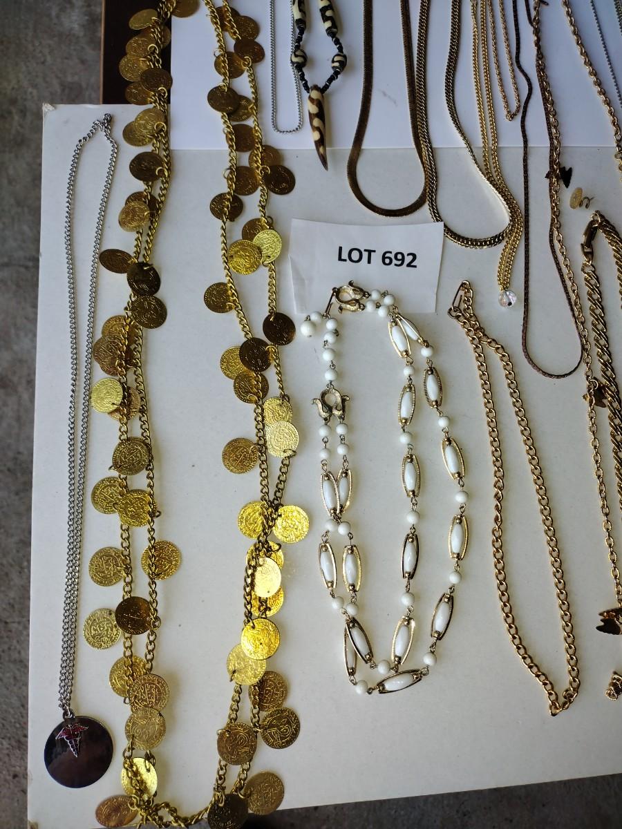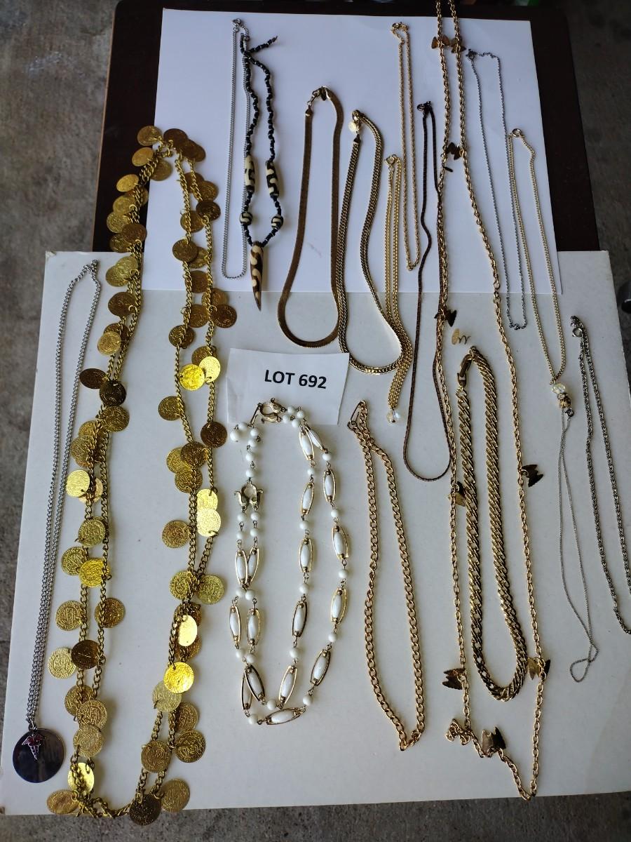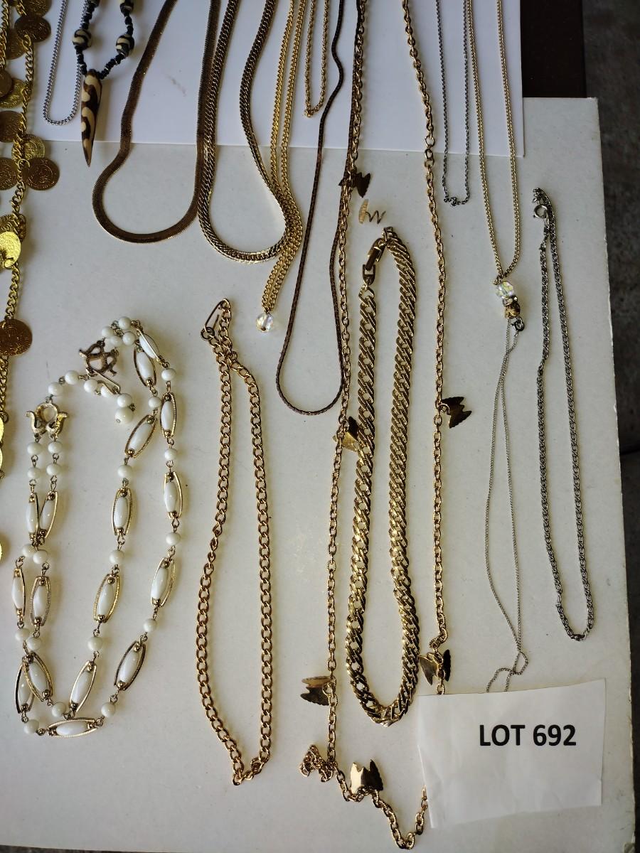 Gold tone necklaces. White beaded necklace silver chains. All costume.. 1 Sarah Coventry butterfly long chain necklace.. 17 total