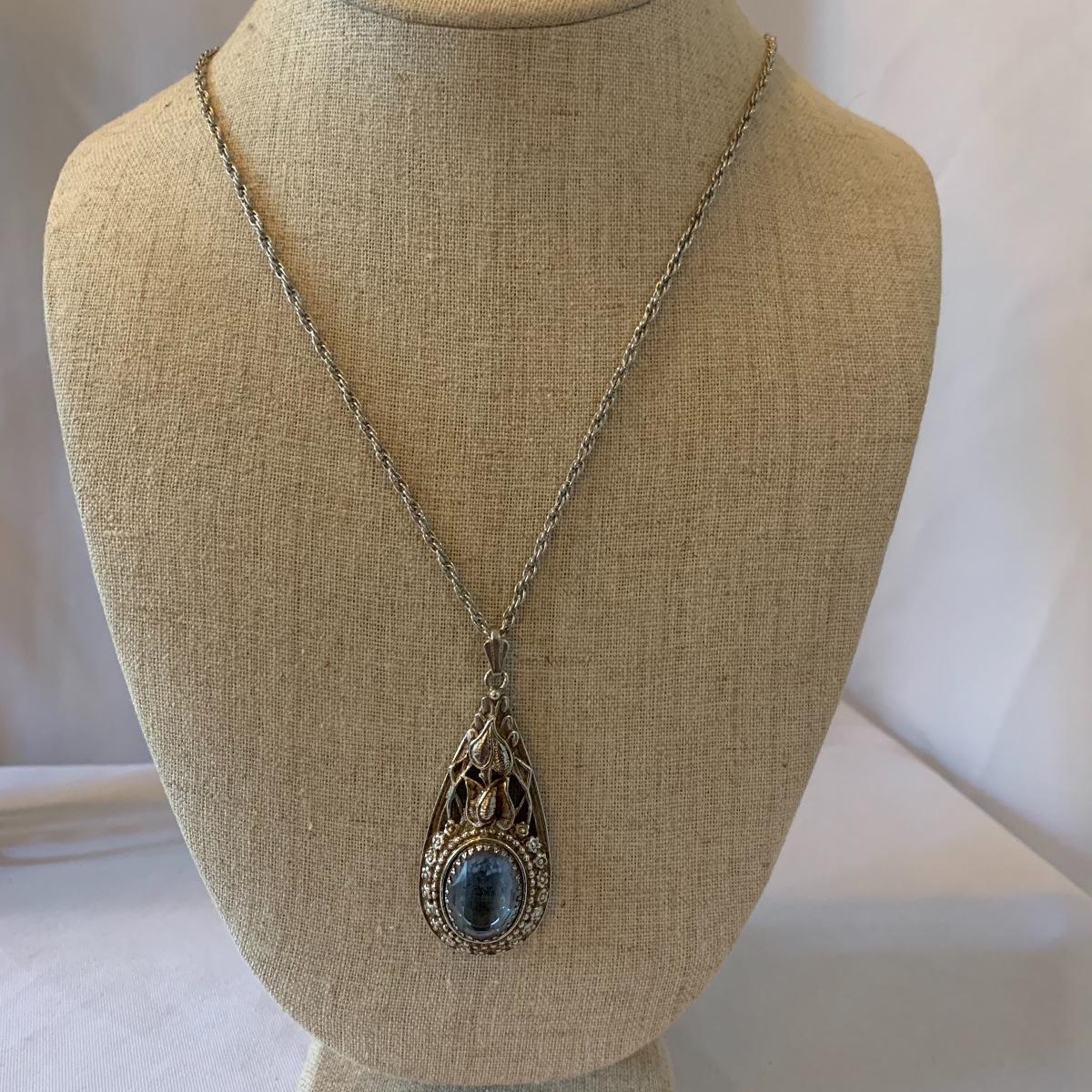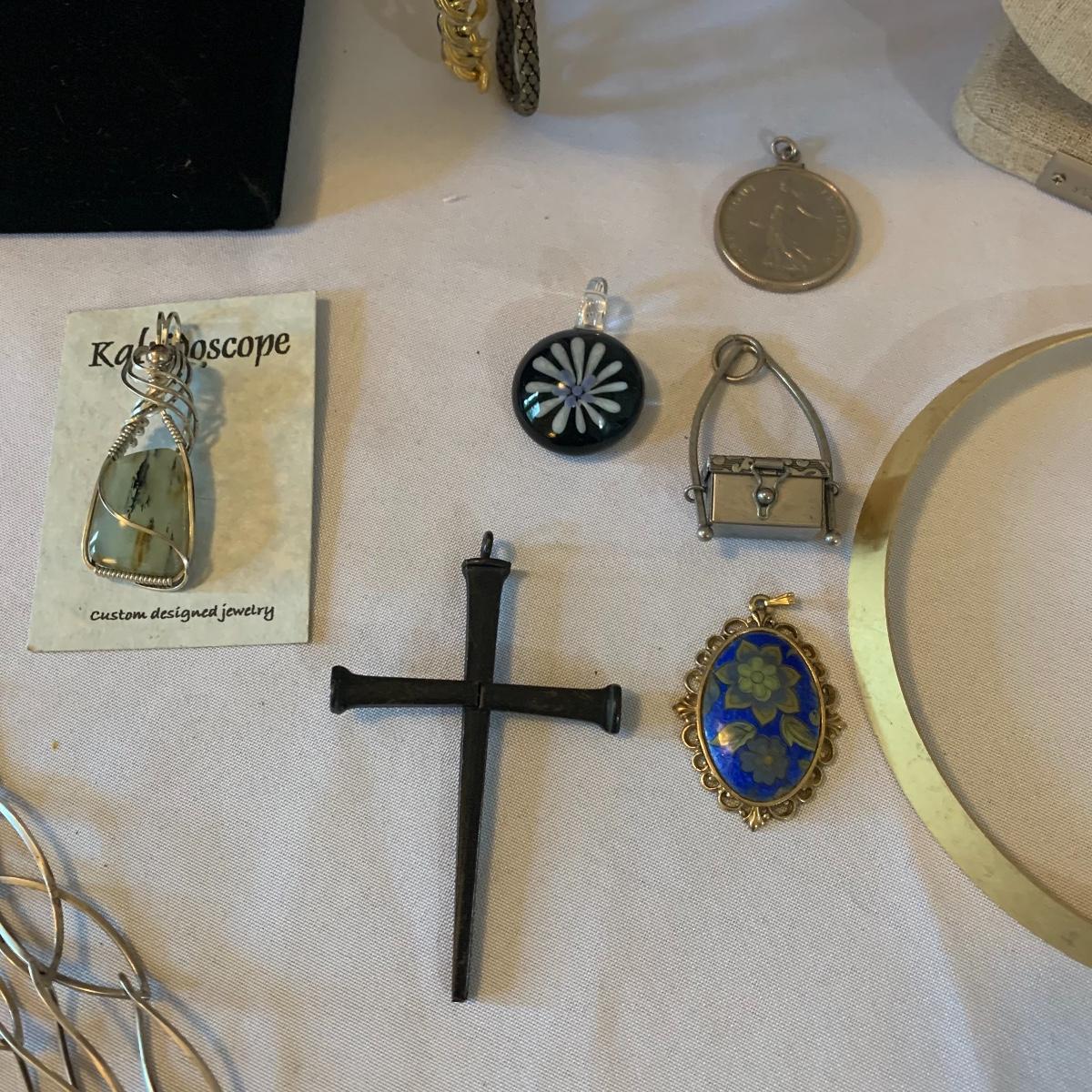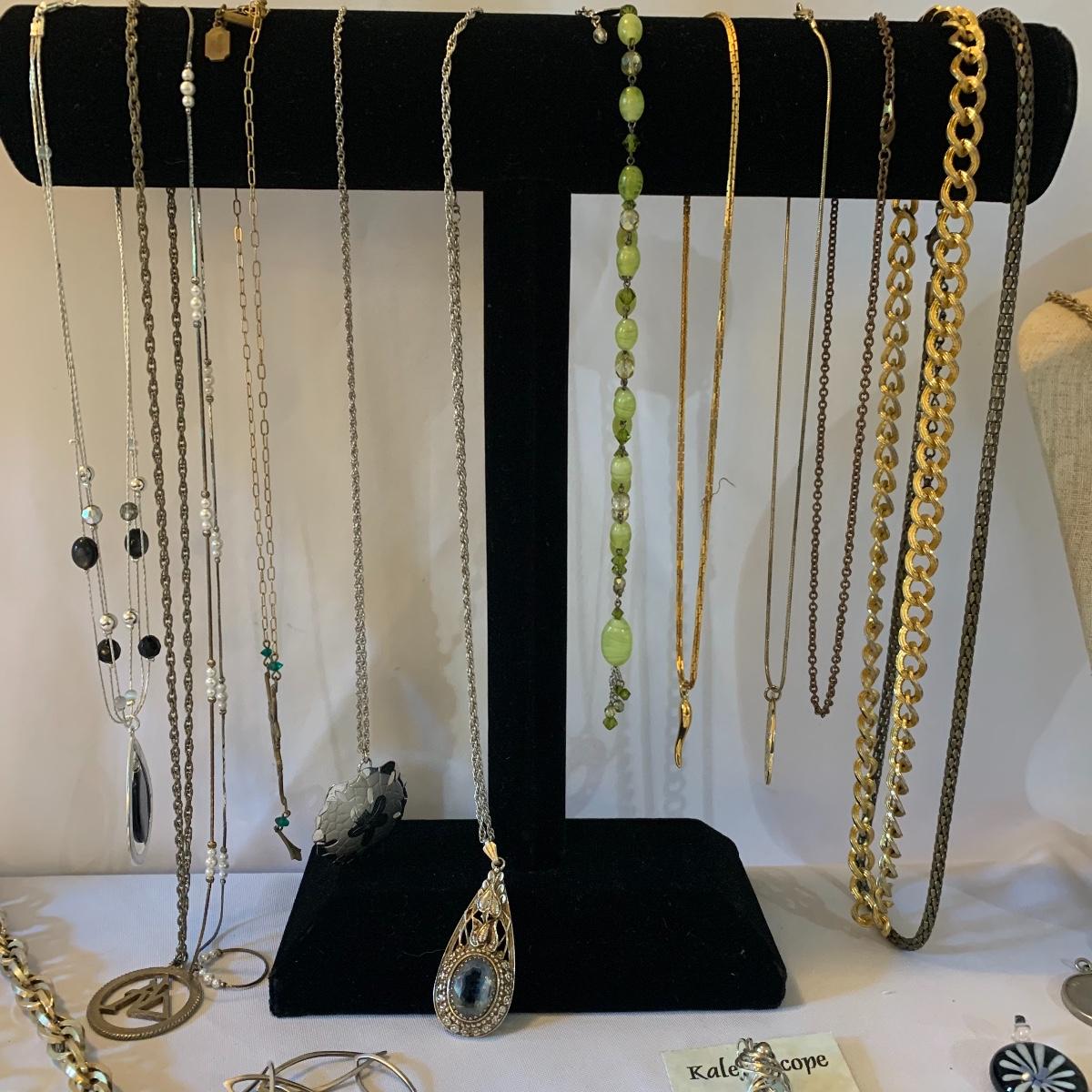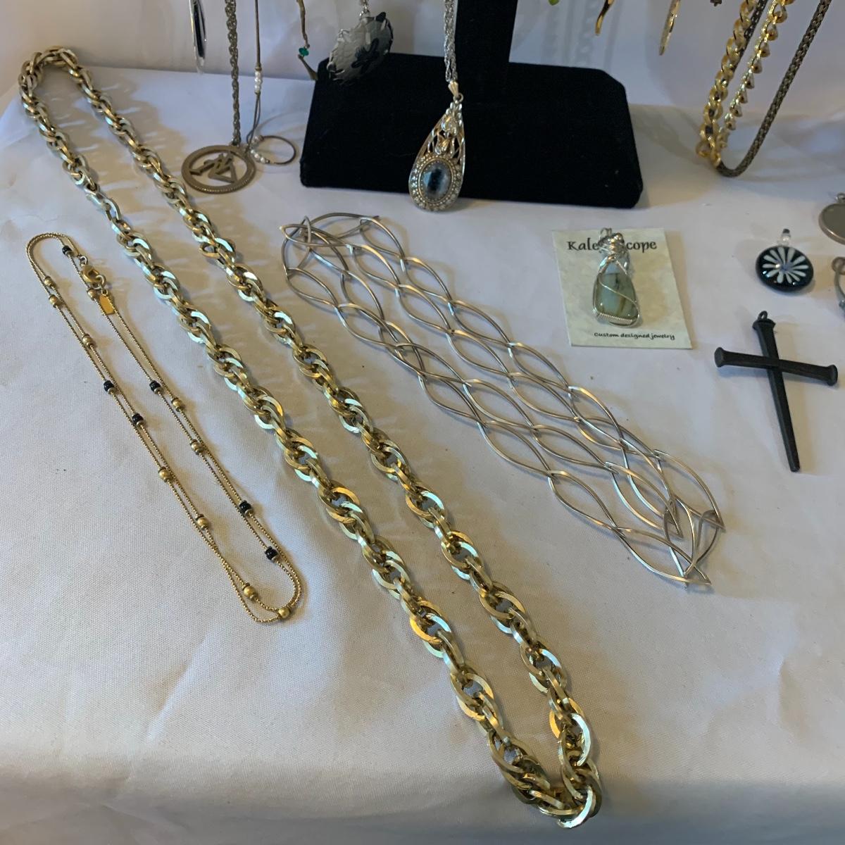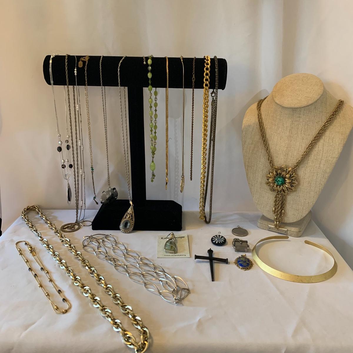 Twenty-three pieces total in this lot. All necklaces are in good condition with clasps working. Makers such as Whiting & Davis, Talbots, Cheryl Reis, Pididdly Links, Charel and more. There is a fraternal pendant and a fun boxed pendant that has a scroll that reads “carpe omnious”. Shipping available.