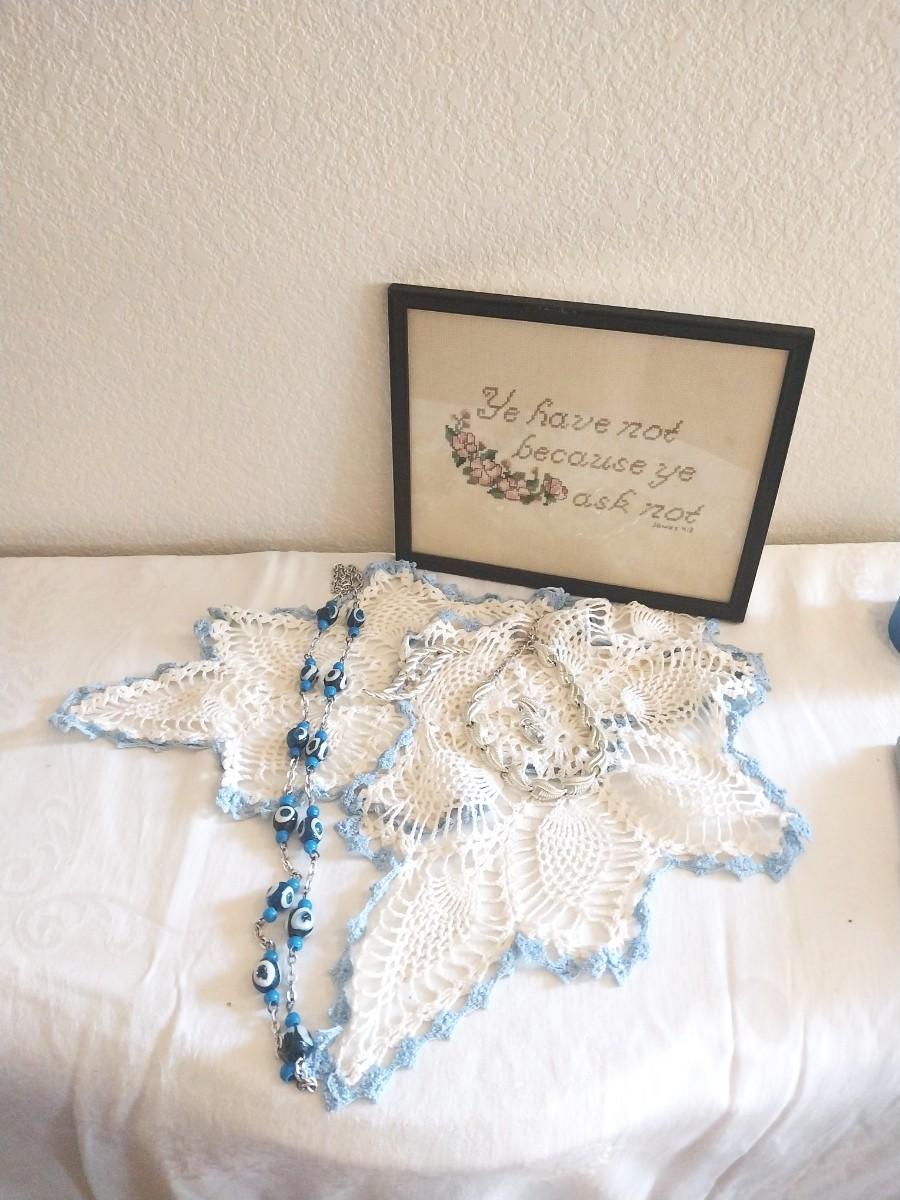 NECKLACES-EMBROIDERED FRAMED SAYING AND DOWLIE
