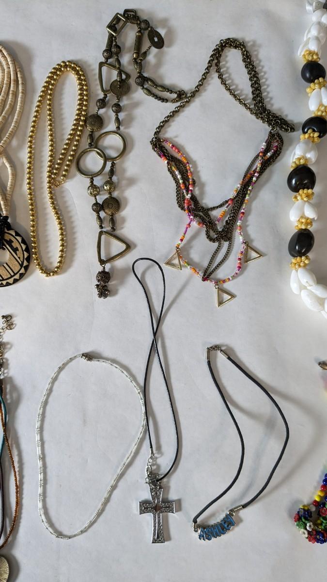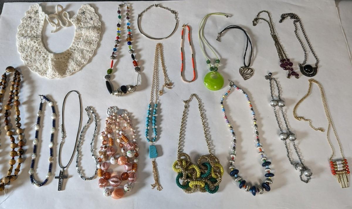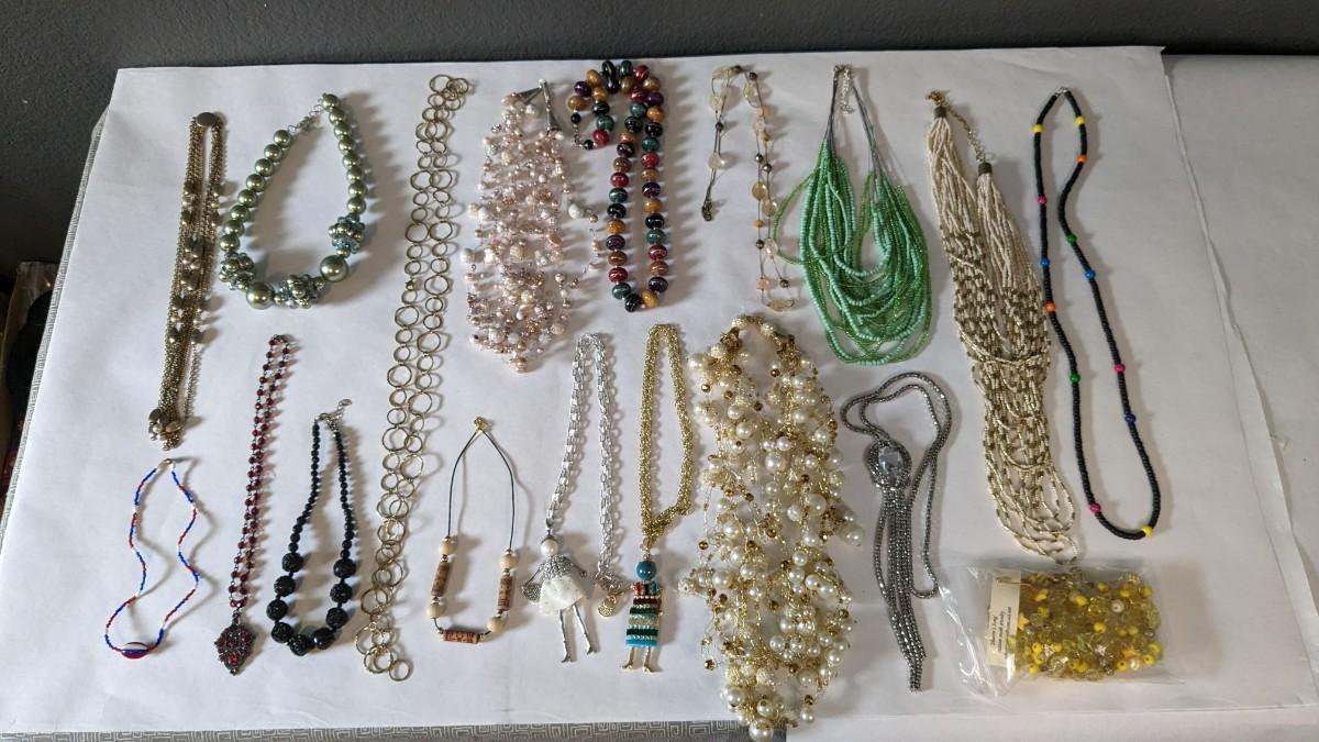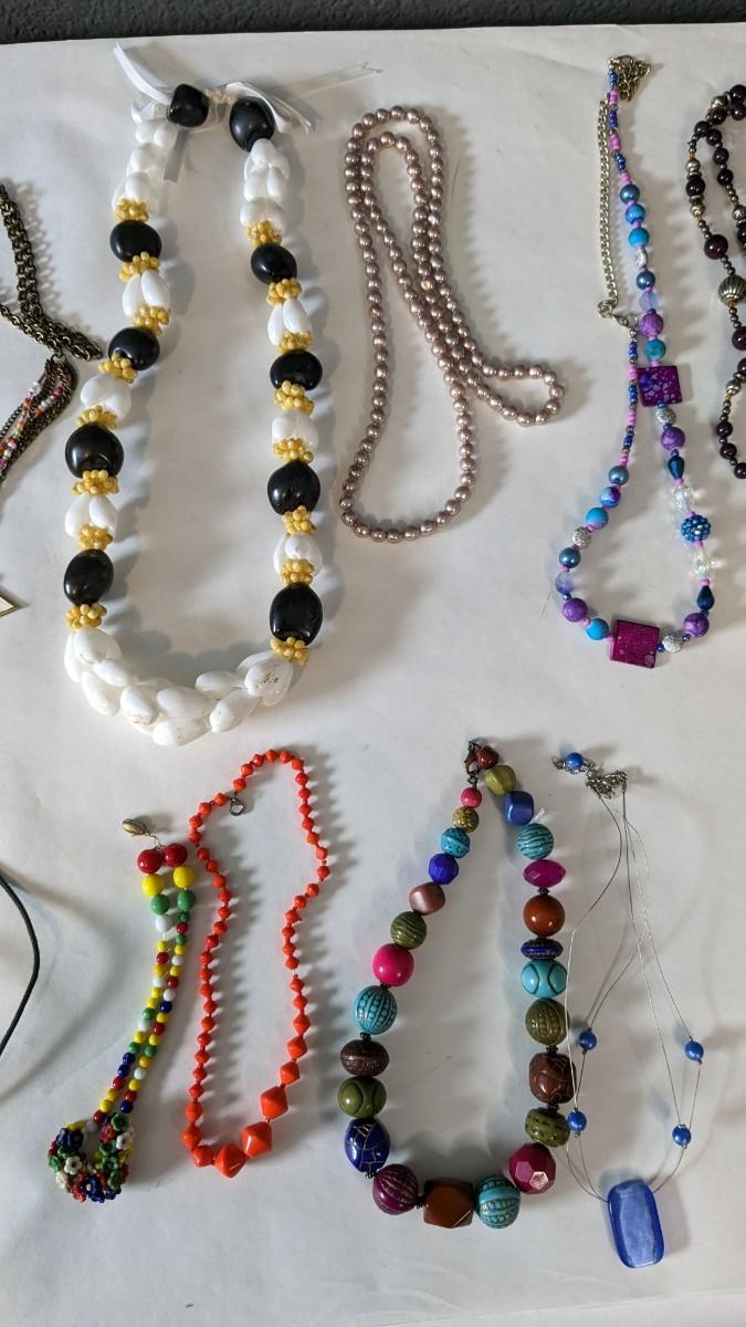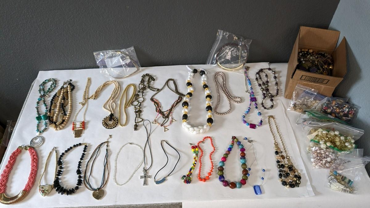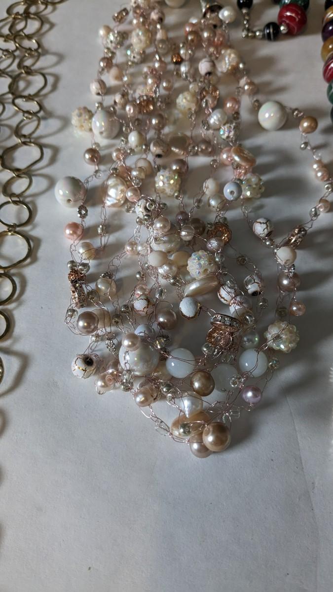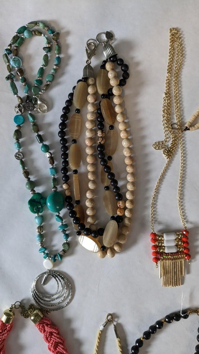 this is a whopper of an assortment on some truly stunning necklaces. This lot includes stunning glass beads, crystals, polished gems, raw gems (including mother of pearl, turquoise, and more!) As well as some incredible local creations, cuffs & collars, contemporary costume jewelry, and multi strand stunners. Note wear to shell collar. Sizes range from 31.5" tassel necklace to 6" when closed. 2616
