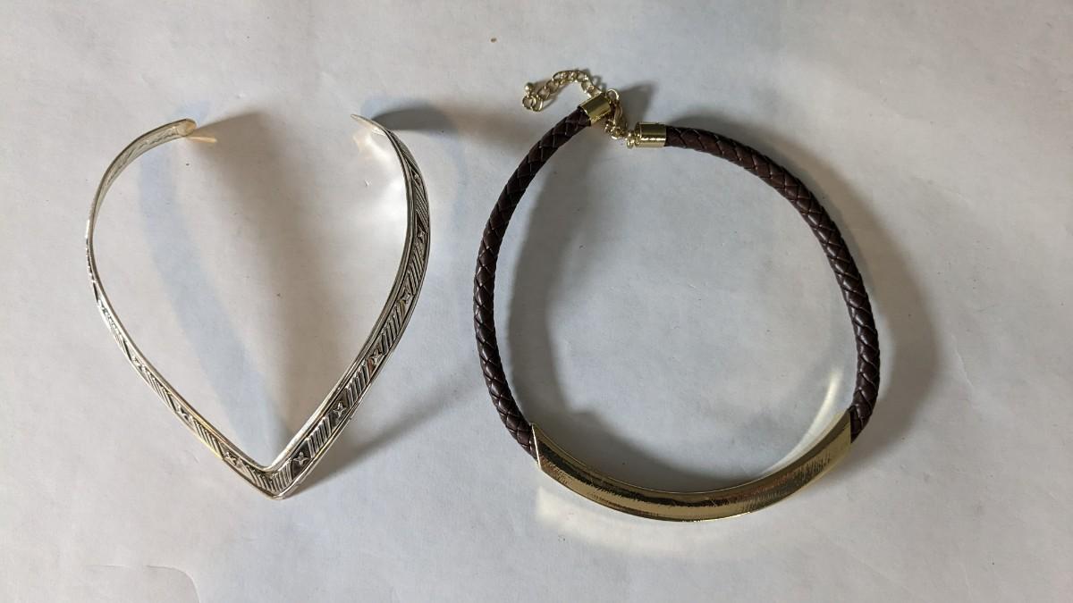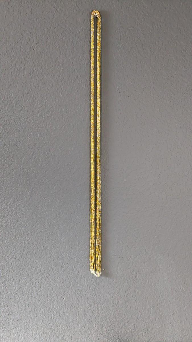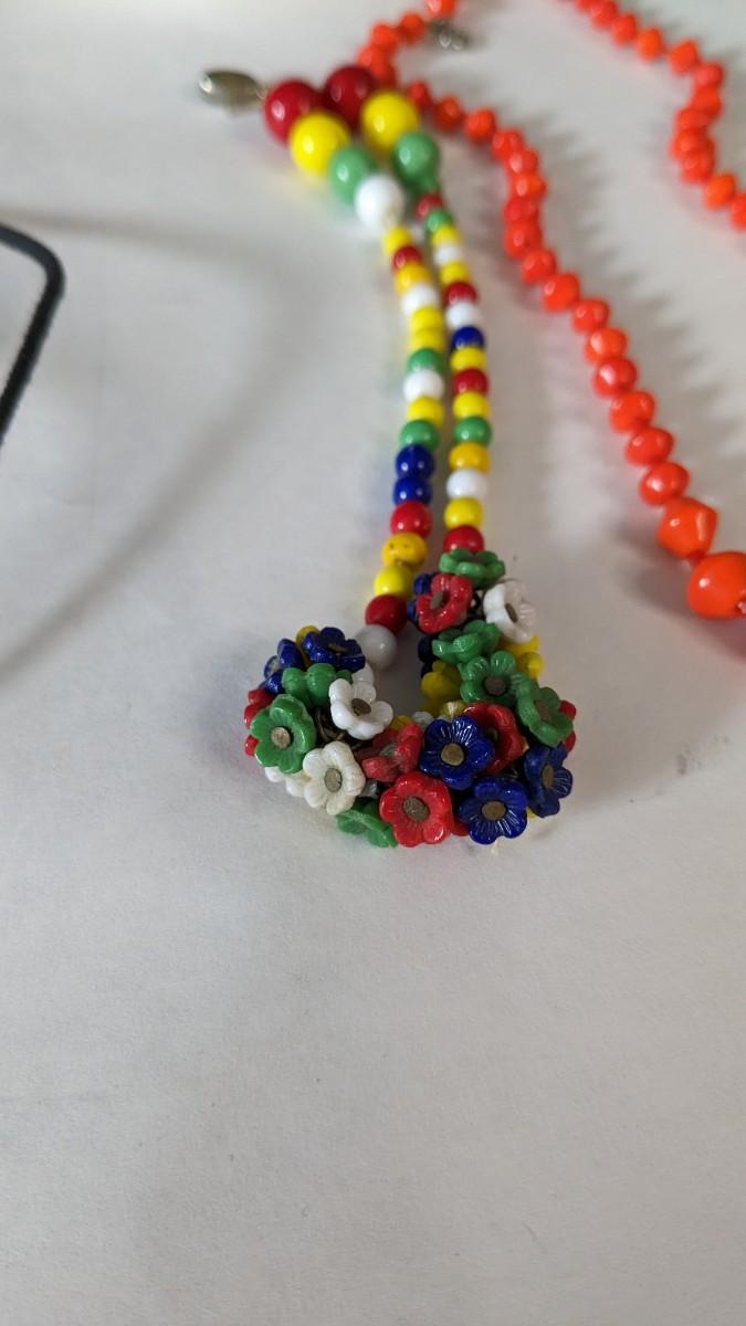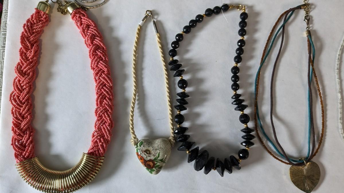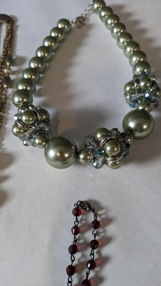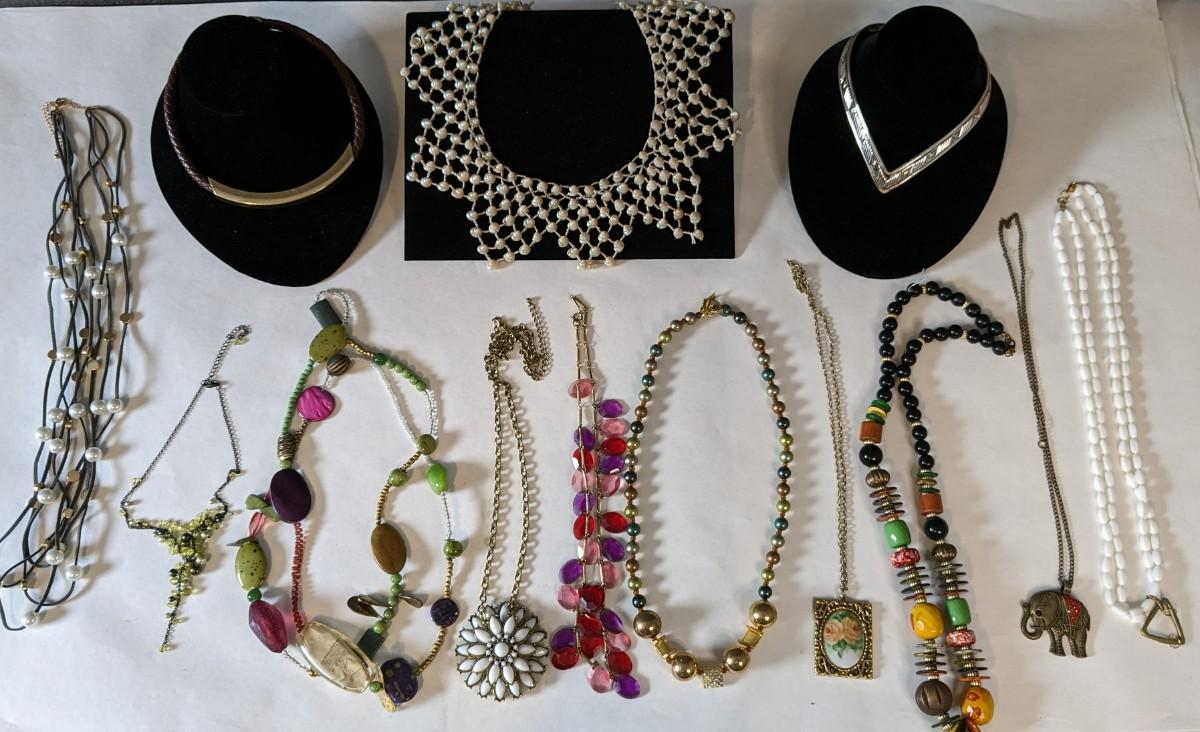 this is a whopper of an assortment on some truly stunning necklaces. This lot includes stunning glass beads, crystals, polished gems, raw gems (including mother of pearl, turquoise, and more!) As well as some incredible local creations, cuffs & collars, contemporary costume jewelry, and multi strand stunners. Note wear to shell collar. Sizes range from 31.5" tassel necklace to 6" when closed. 2616