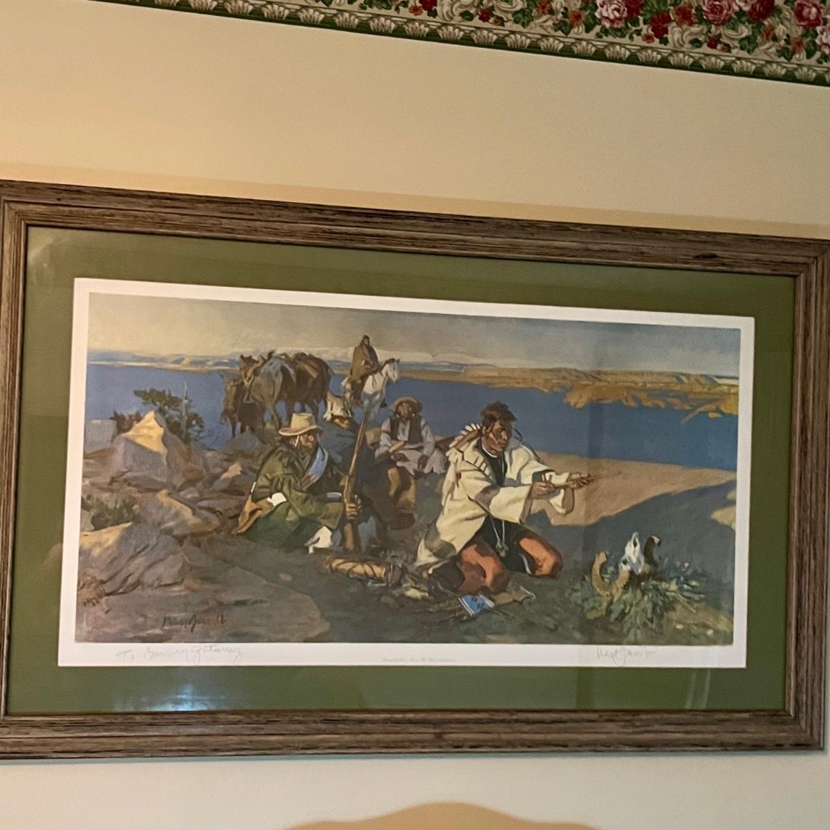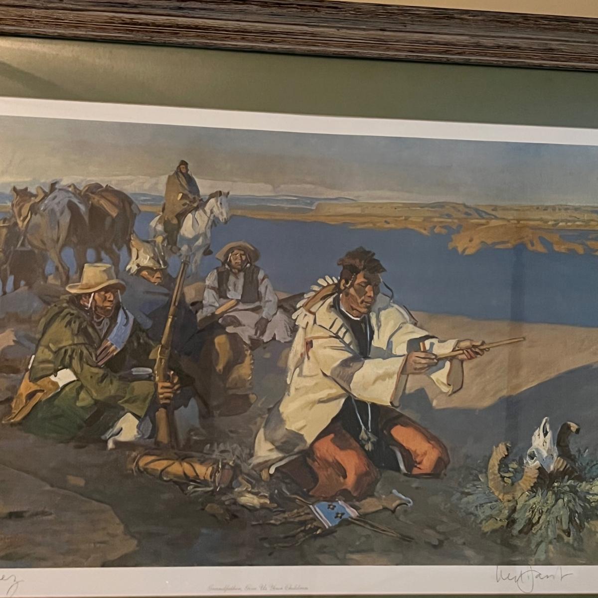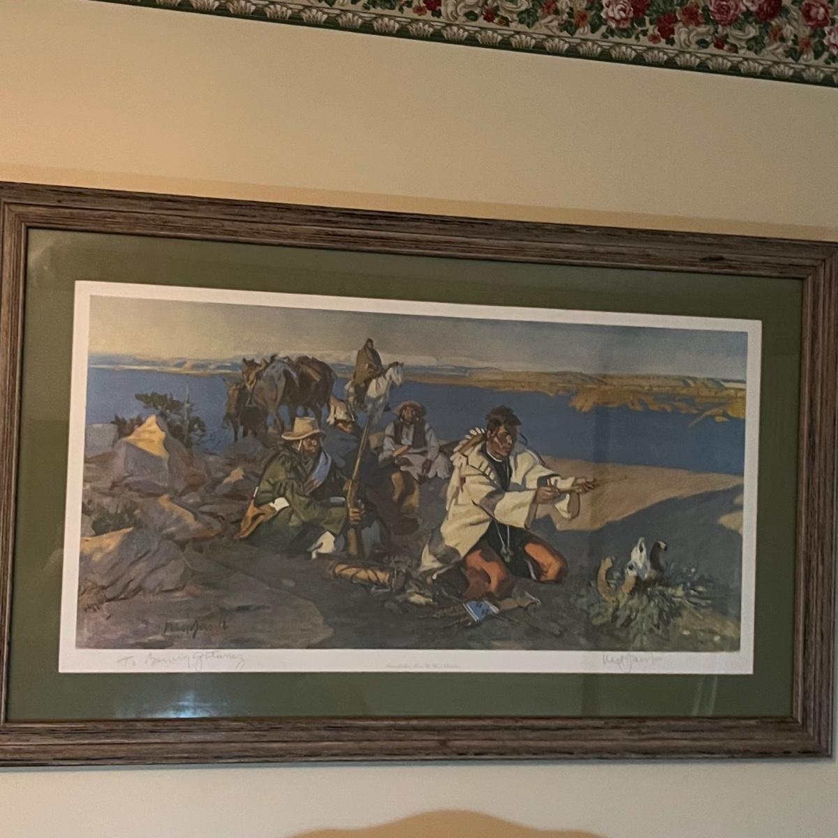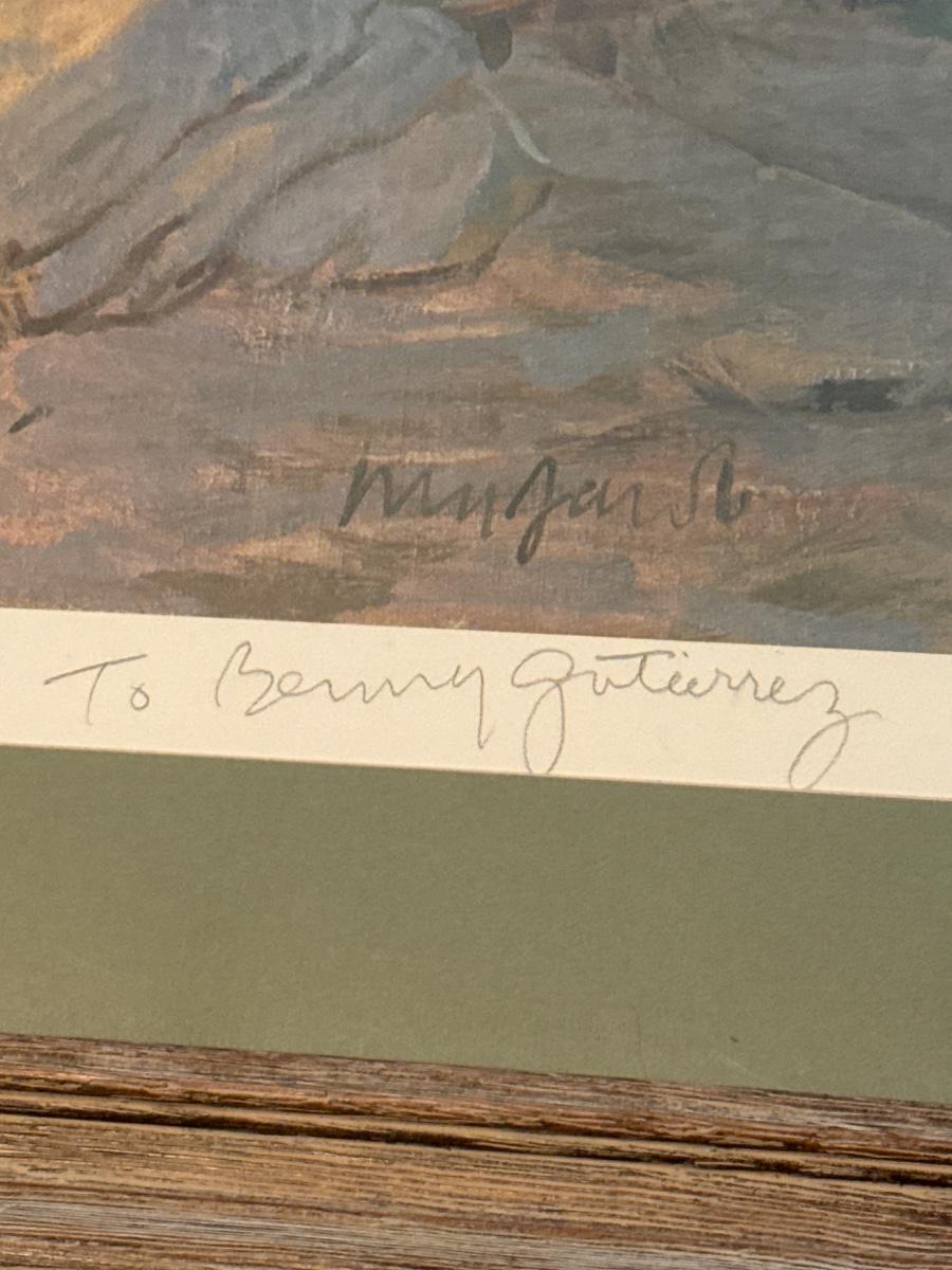 This large print has a pencil and a stamped signature. It was also signed to someone. It is under glass, matted and mounted in a rustic wood frame that measures 43.5” x 1” x 27”H.