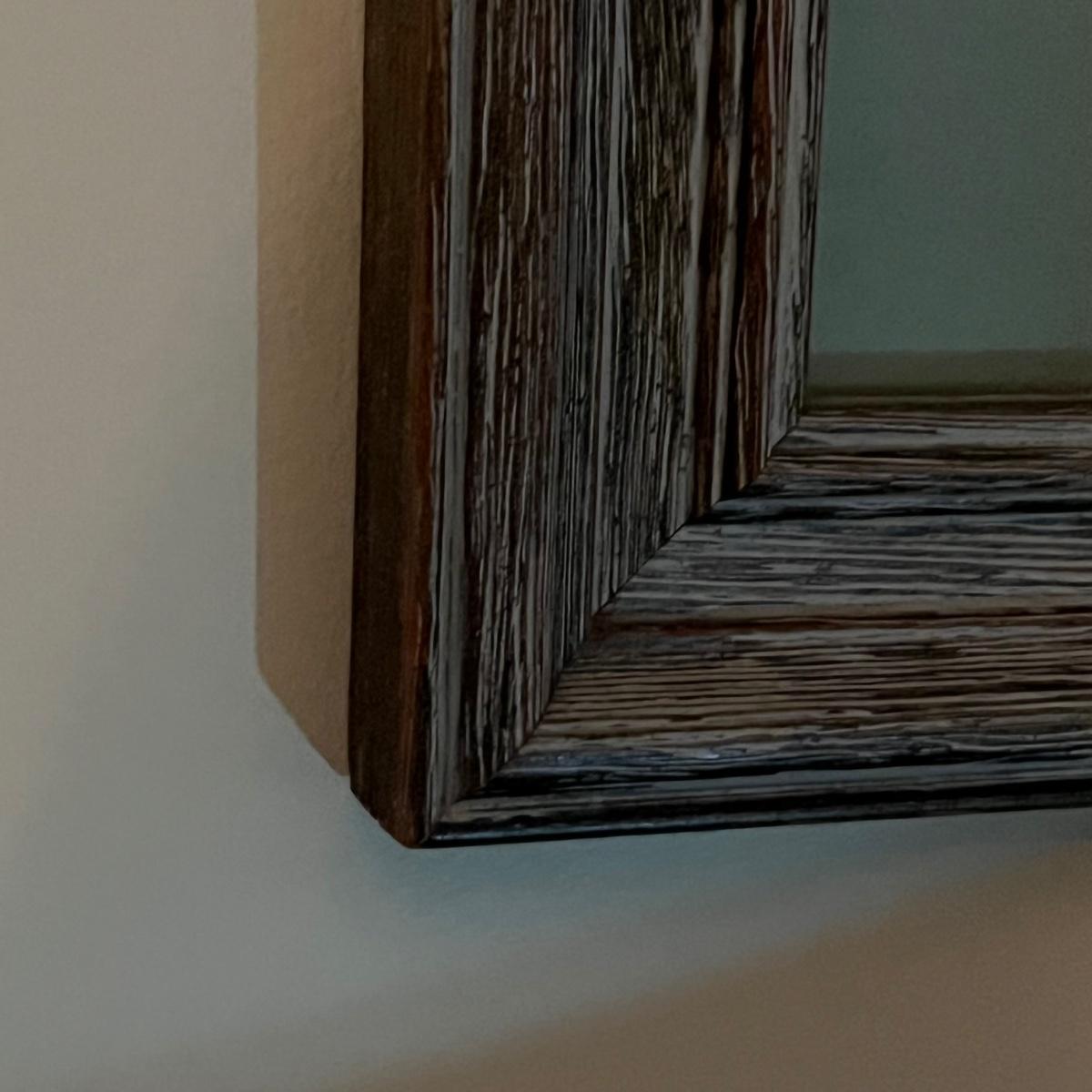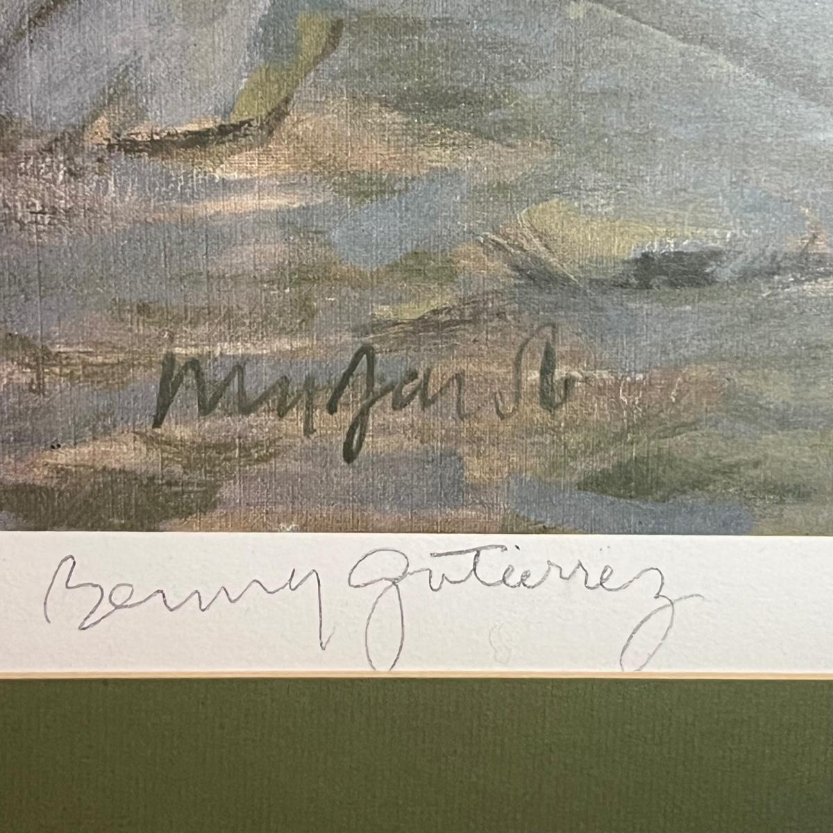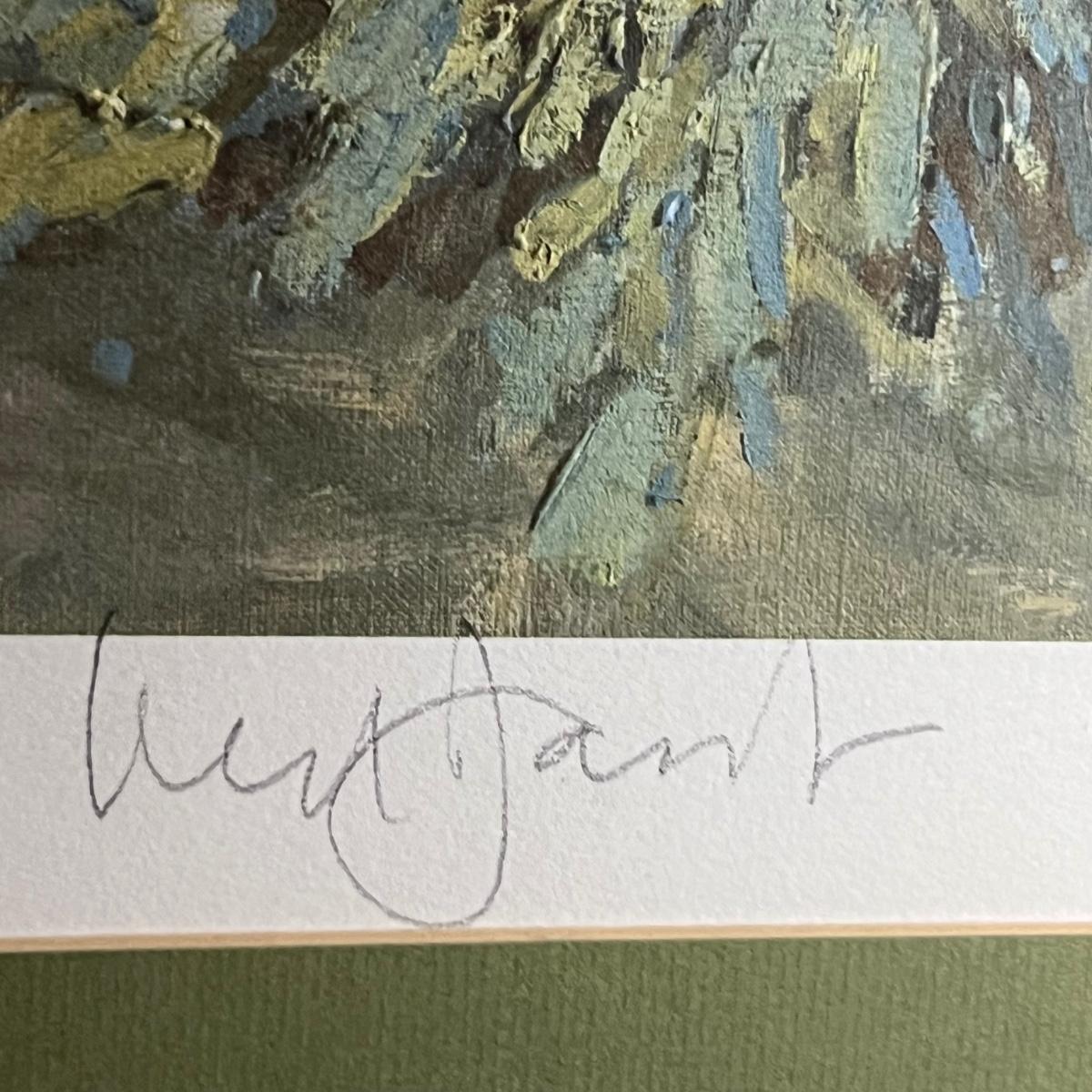 This large print has a pencil and a stamped signature. It was also signed to someone. It is under glass, matted and mounted in a rustic wood frame that measures 43.5” x 1” x 27”H.
