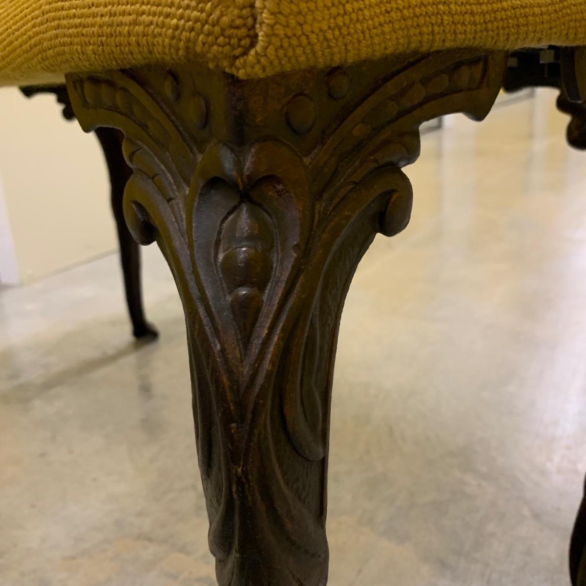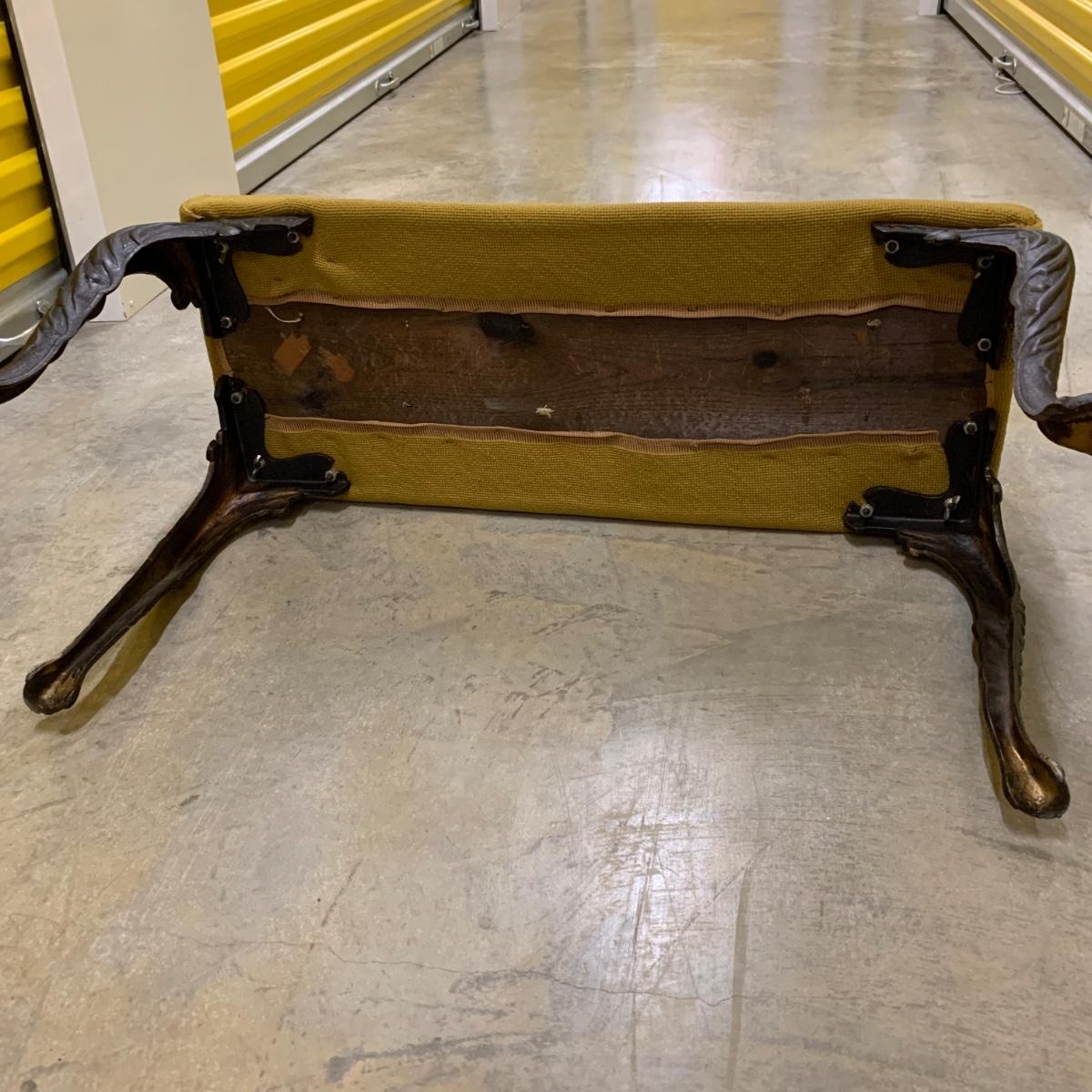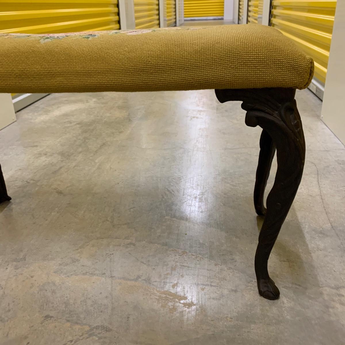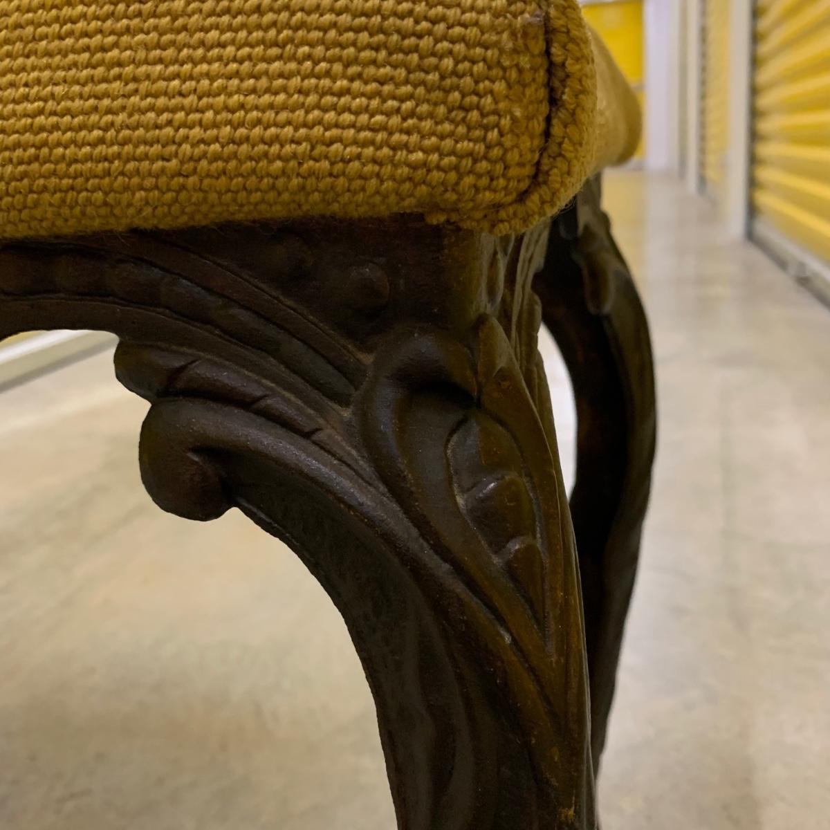 Bench seat is wood topped with a cushion and a needlepoint cover. The main color of the cover is a dark tan/camel color. The ornate legs are a sturdy metal that feels like iron. The bench measures 31”L x 13”W x 18” H. It is in good condition and fully intact. The legs are slightly wobbly. Local pickup only.